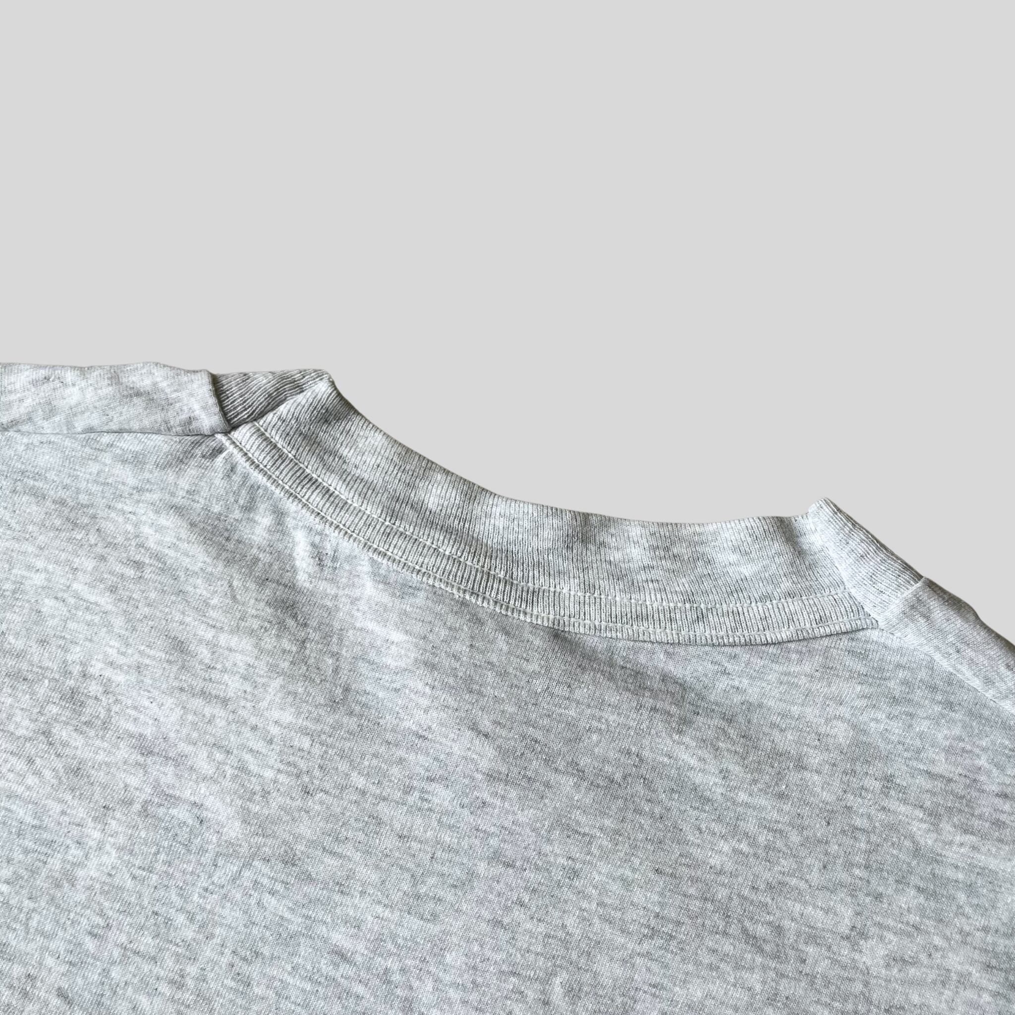 グレーの霜降りボディに、レッド、イエロー、ブラックのコントラストが効いたプリントが、エネルギッシュで楽しい雰囲気を演出。一見シンプルながらも、遊び心のあるデザインが、あなたの個性を引き立てます。