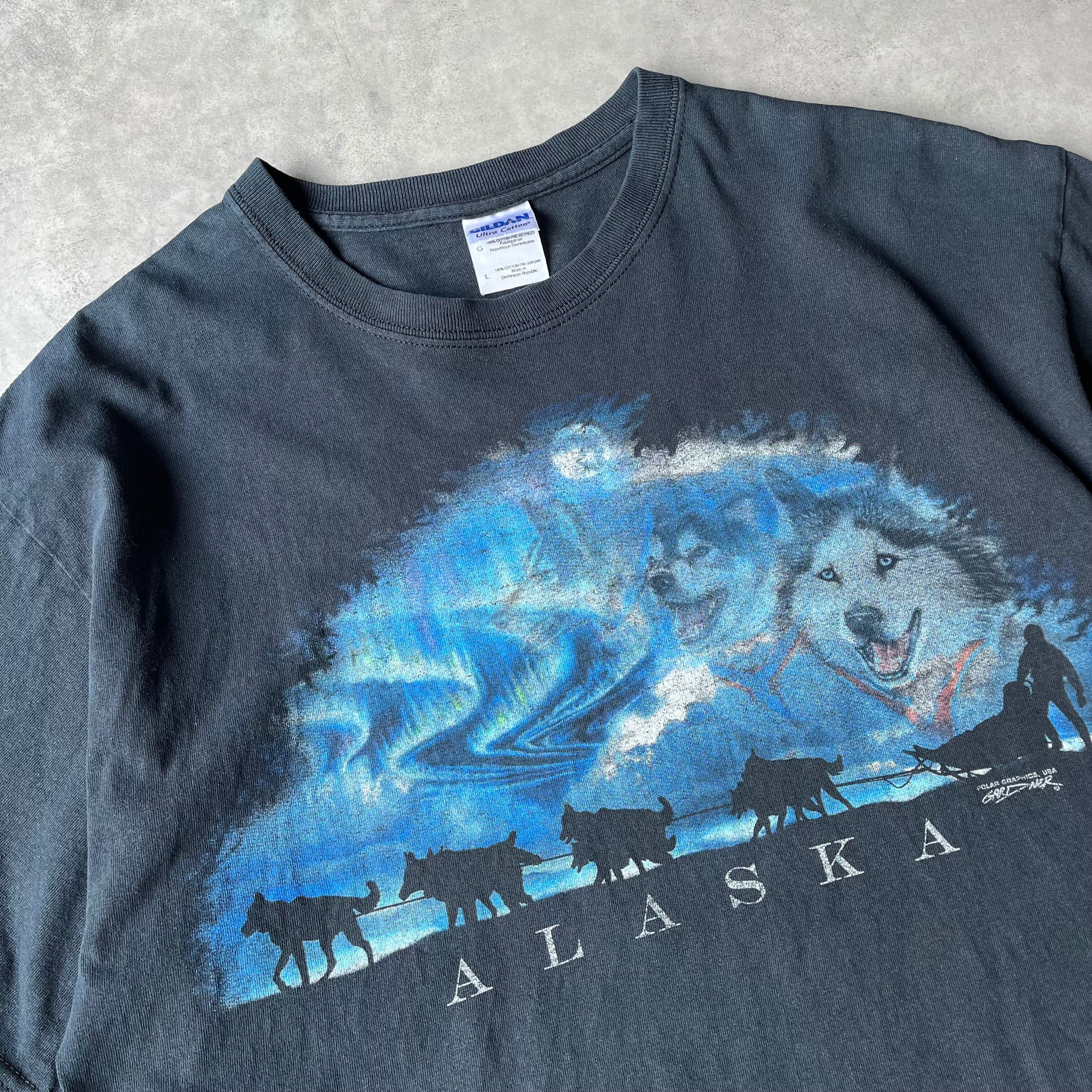 アラスカのオーロラとシベリアンハスキーが描かれたアニマルTシャツ。