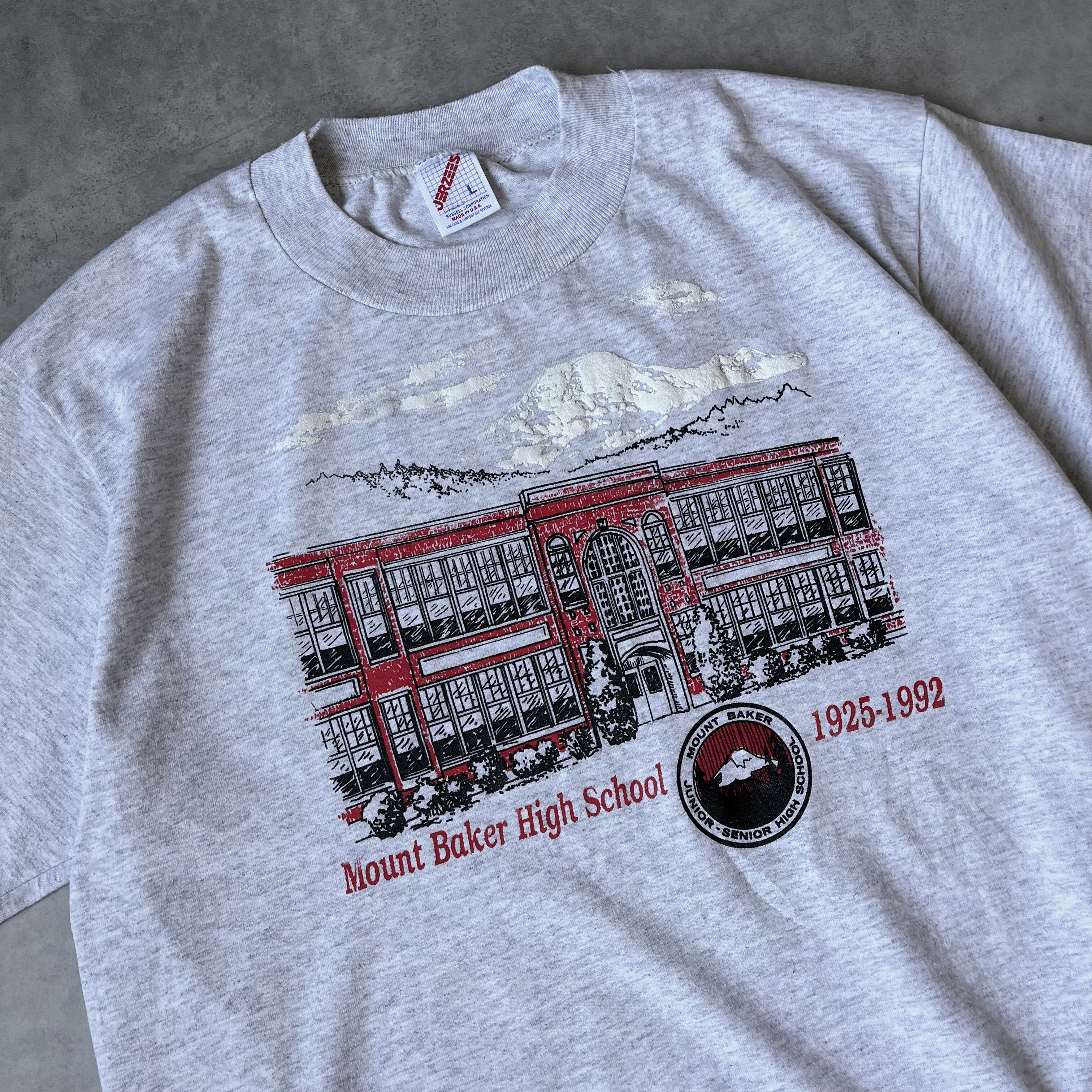 マウントベーカー高校と描かれており、右下には「1925-1992」という年号があり、これは学校の設立年と、おそらくこのTシャツが作られた年、または特定の記念年を示しており歴史や思い出を記念して作られたものだと思われます。