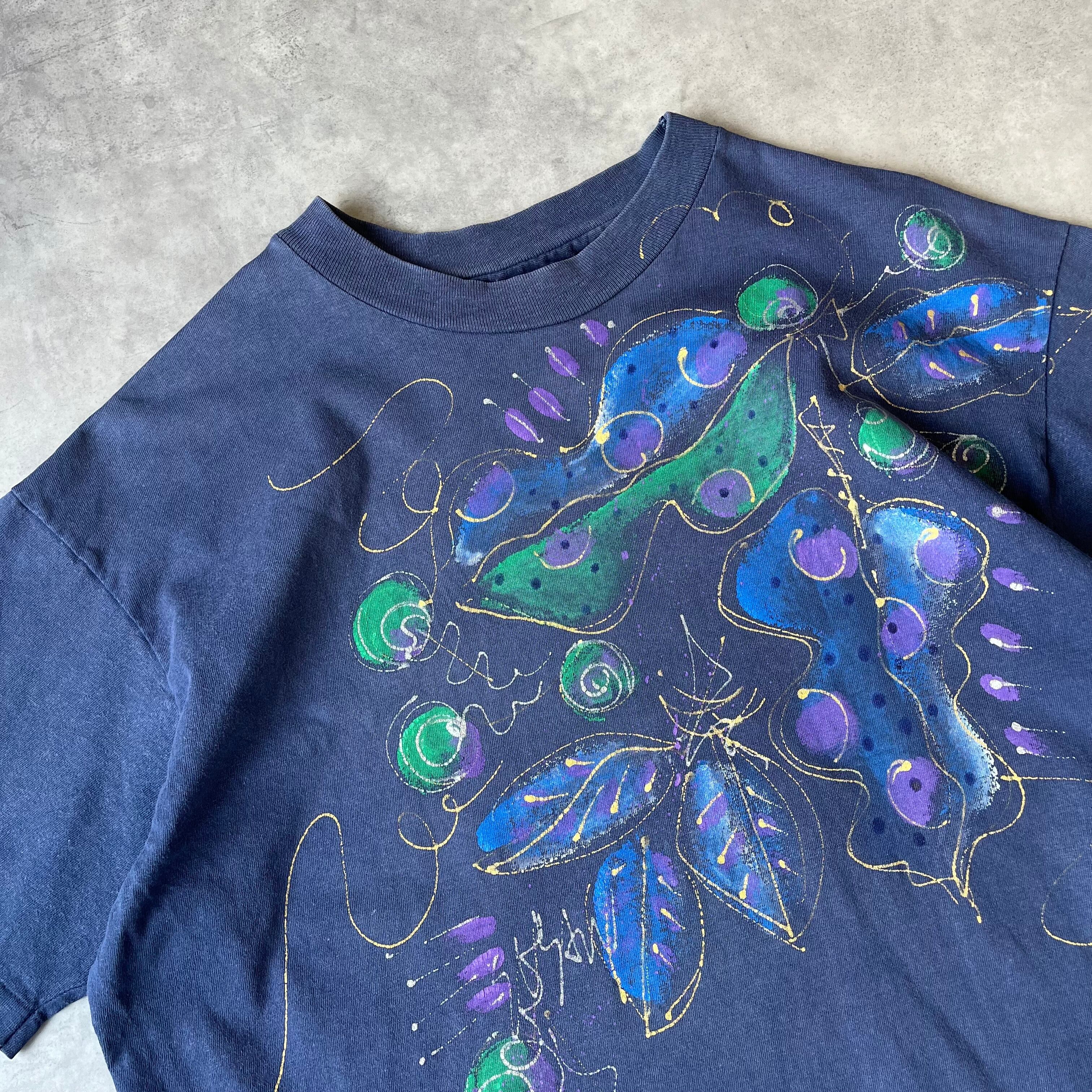 手描き風のアートが映える、ネイビーボディのTシャツ。