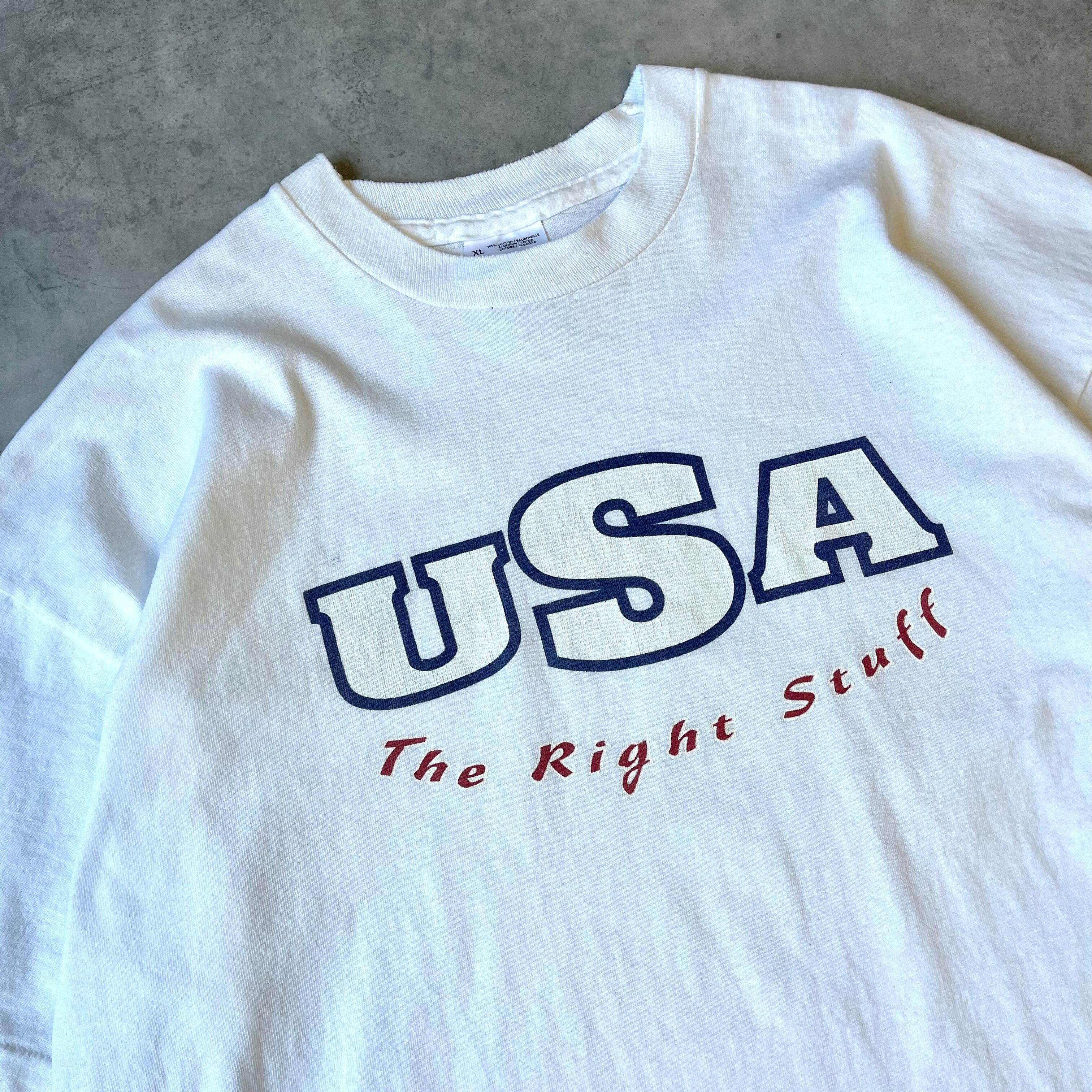 アメリカの英雄像や宇宙開発時代を象徴する「THE RIGHT STUFF」のメッセージがプリントされた、存在感のあるTシャツ。