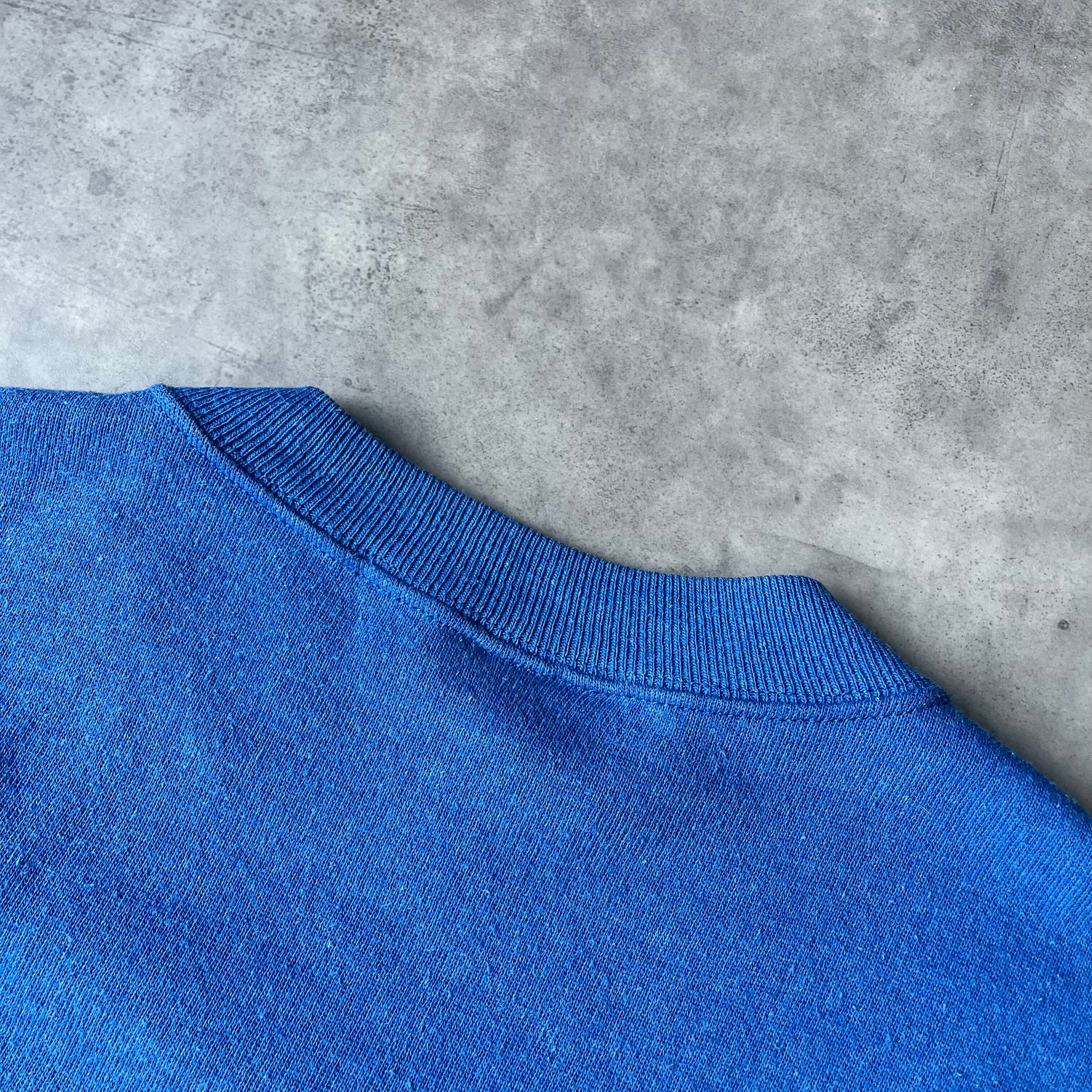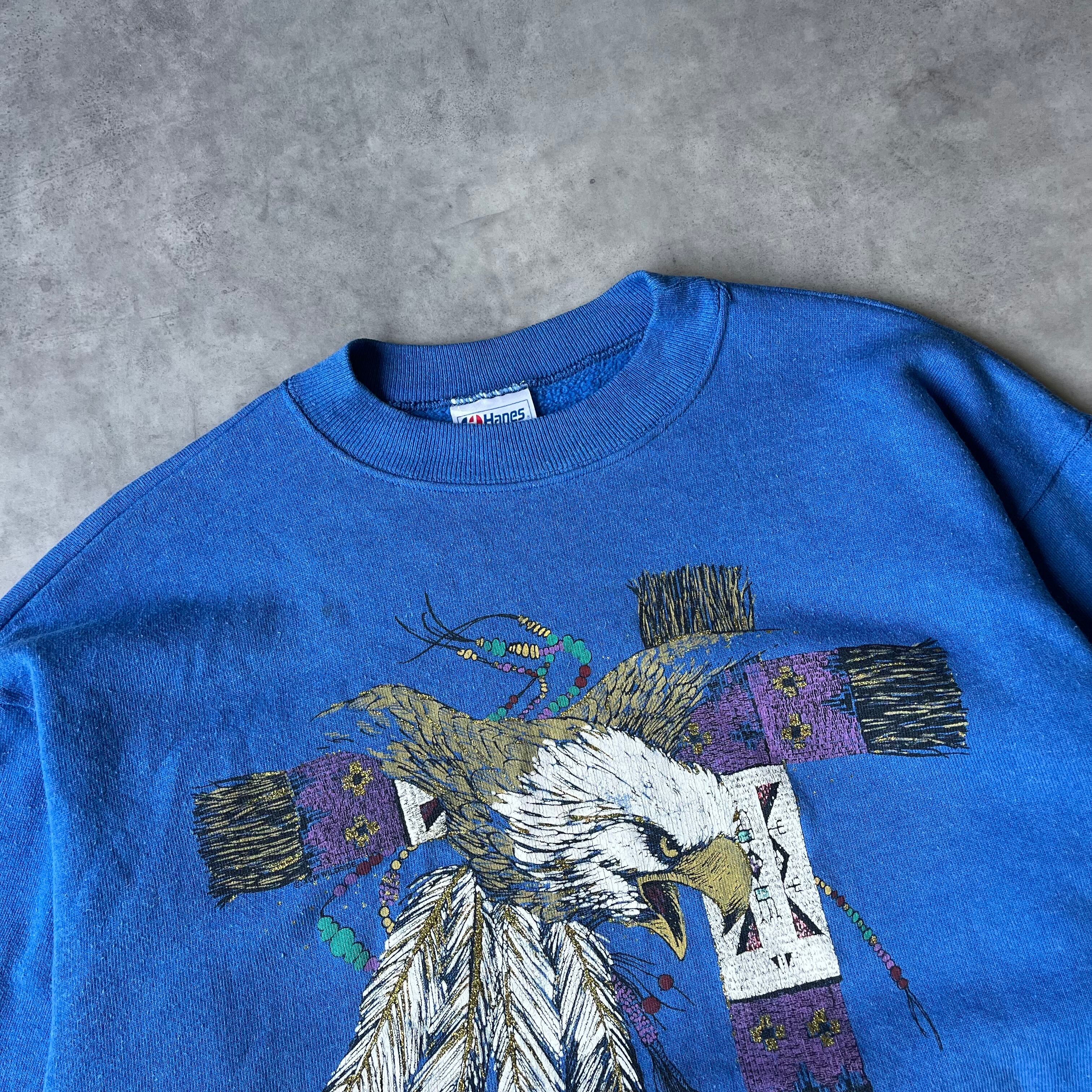 80年代にアメリカで製造された、Hanesボディのアニマルプリントスウェットです。 鮮やかなブルーのボディを背景に、ハクトウワシとフェザーを組み合わせたネイティブ・アメリカン調のグラフィックが大胆に描かれています。ミズーリ州ブランソンのスーベニアアイテム由来と思われる、当時のレトロな空気感を色濃く残したデザインが特徴です。