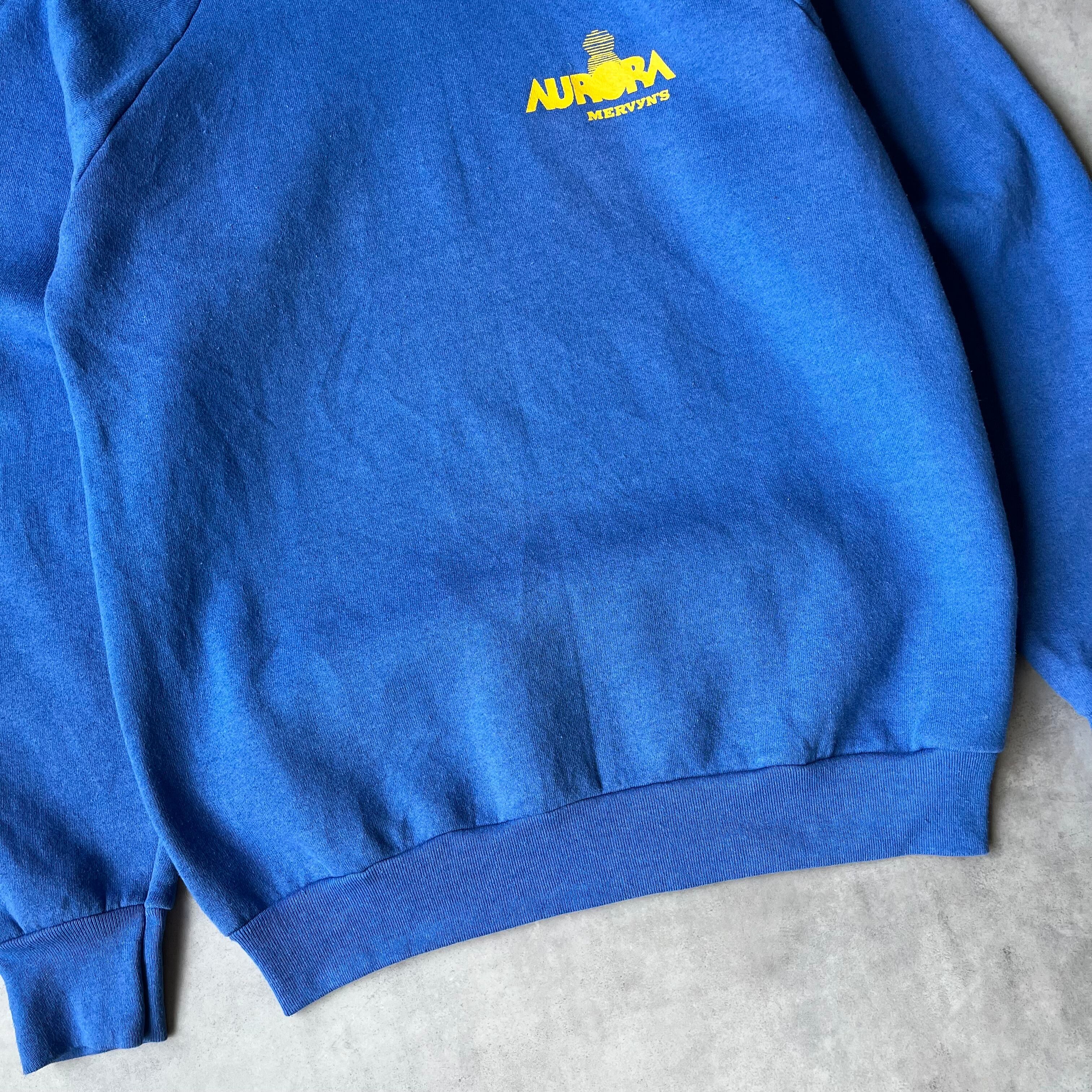 80年代にアメリカで製造された、Fruit of the Loomボディのラグランスリーブスウェットです。 米大手デパートチェーン「Mervyn's」のプライベートブランドと思われる「AURORA」のロゴと、ユニークな王冠のグラフィックがイエローでプリントされています。鮮やかなブルーのボディにイエローのプリントが映える、当時のアメリカらしい配色が魅力の一着です。