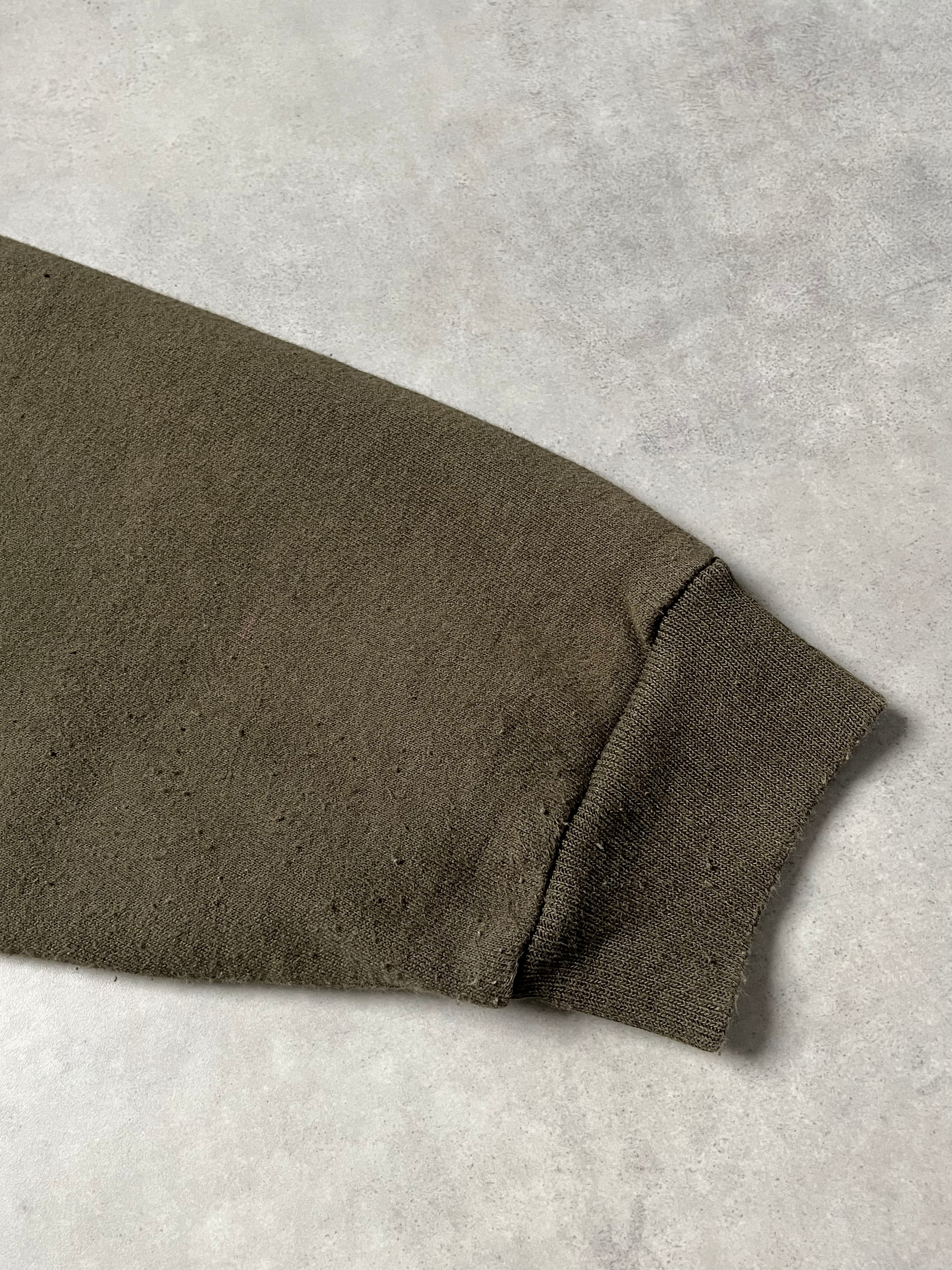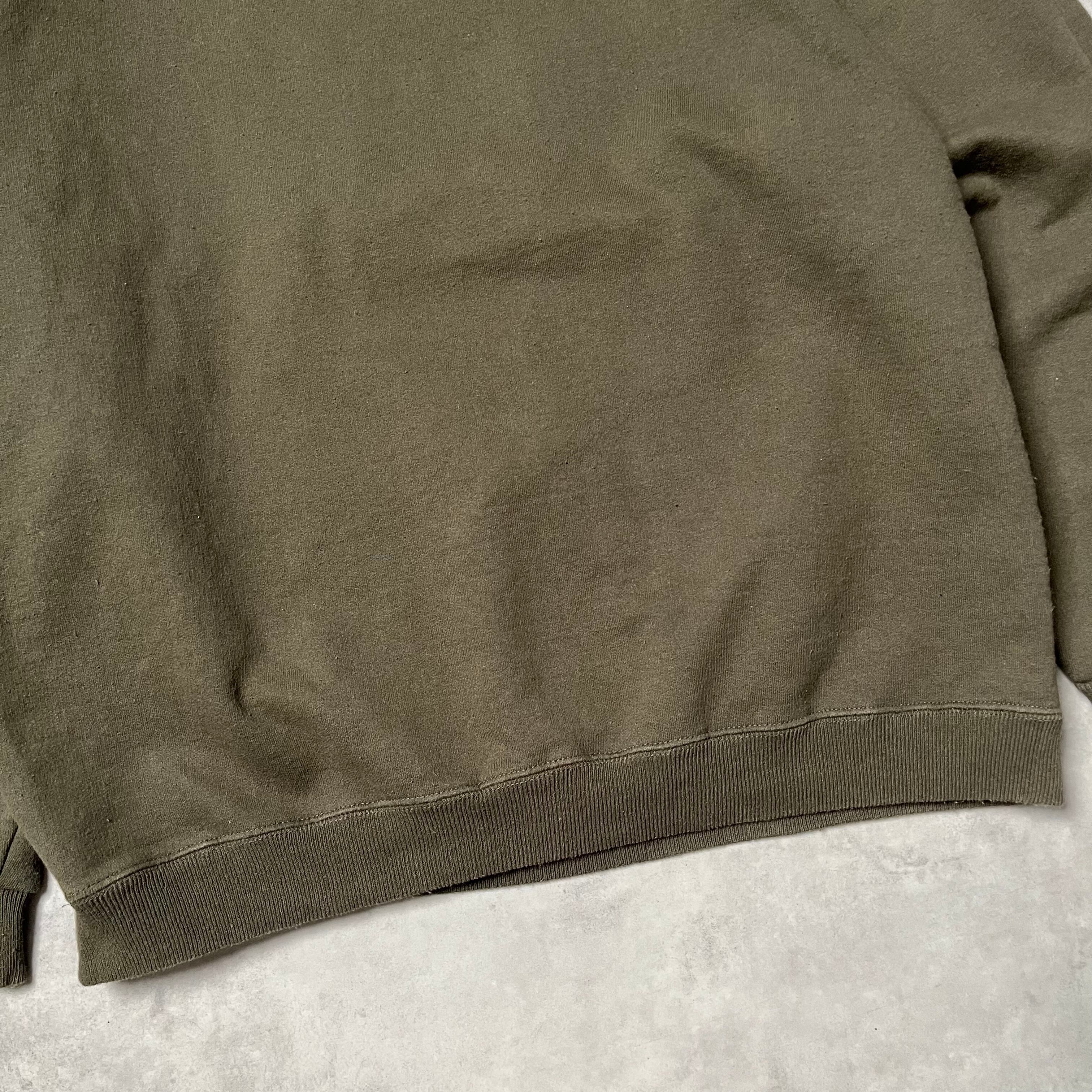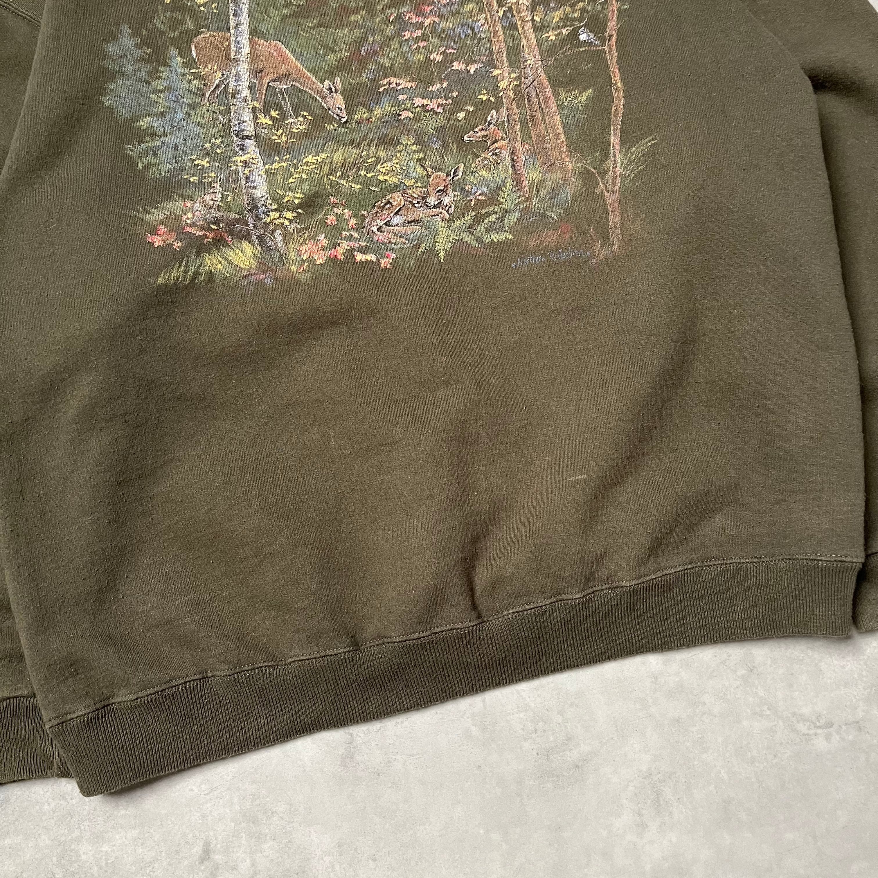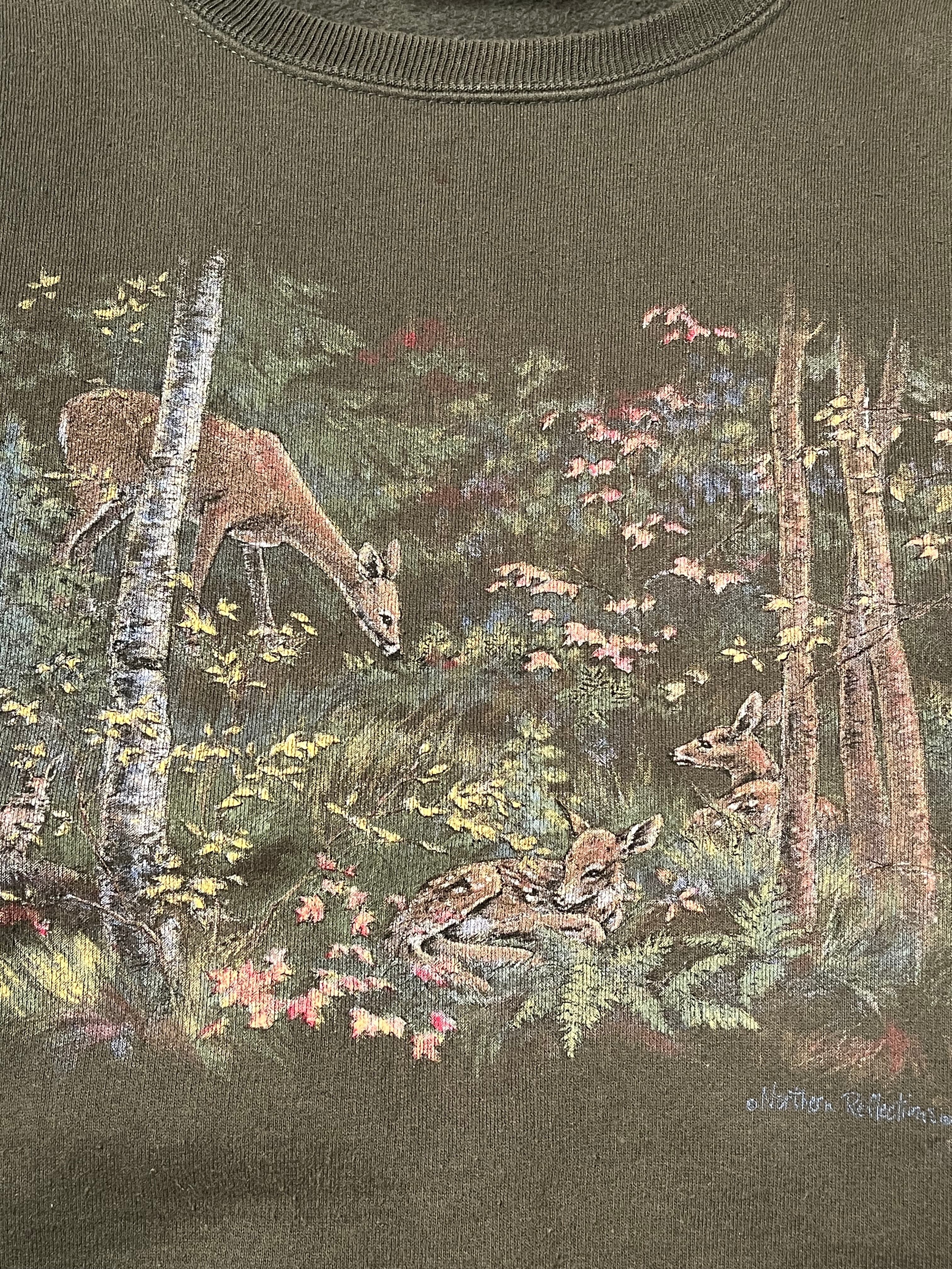 90年代の「Northern Reflections」製、深みのあるダークグリーンのクルーネックスウェットです。 森の中で静かに過ごす鹿と子鹿が描かれた、温かみのあるネイチャープリントが特徴。柔らかなボディは、身幅59cm、肩幅59cmとゆったりしたボックスシルエットになっており、男女問わずリラックスして着用できるサイズ感です。