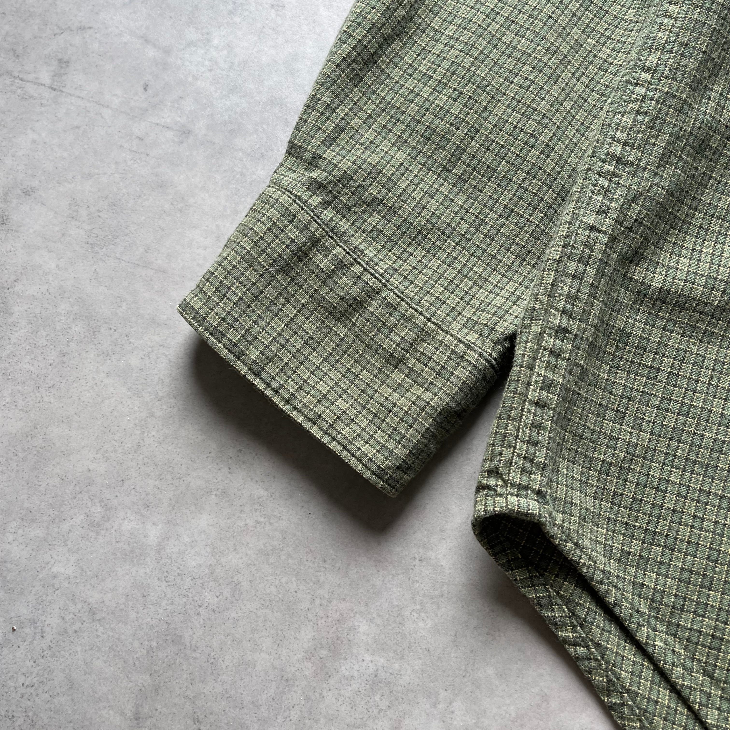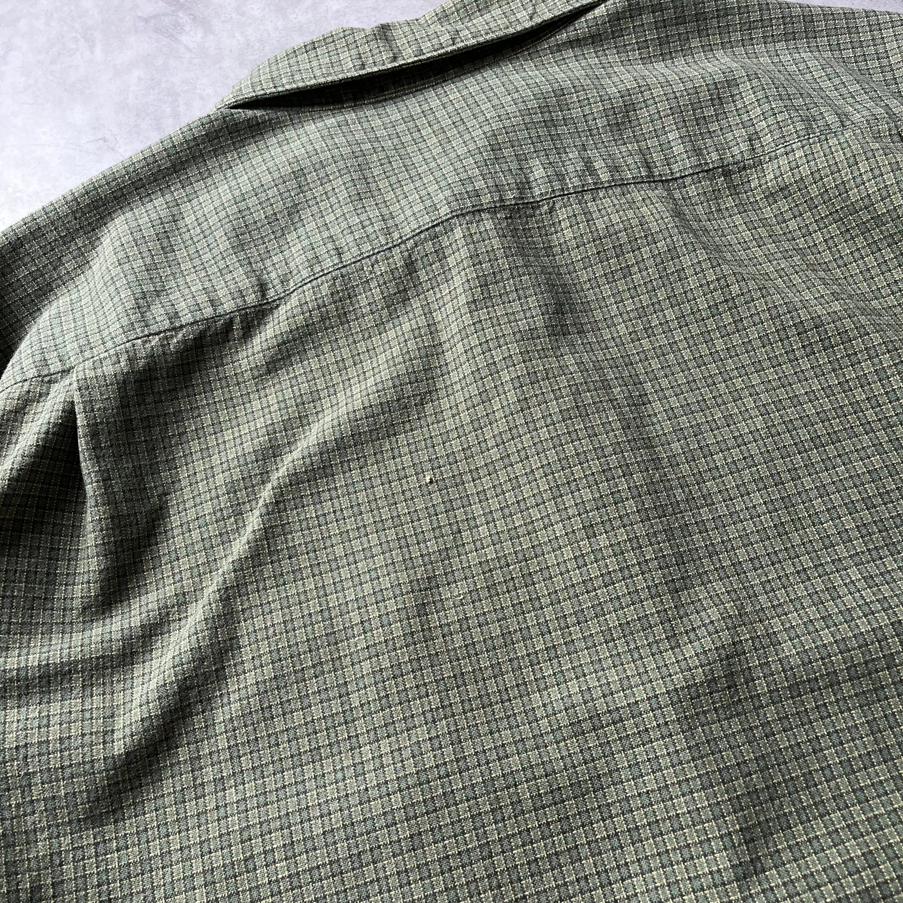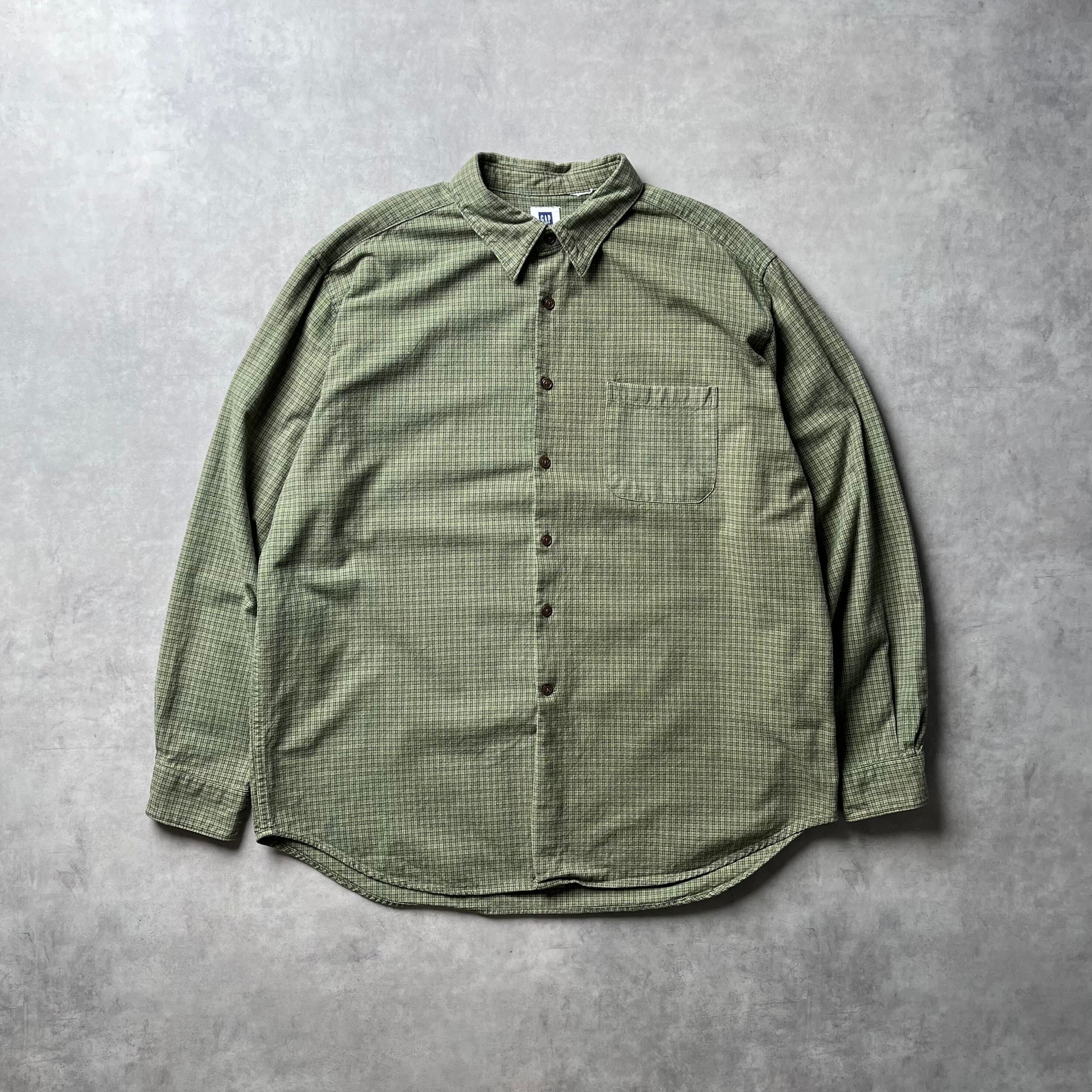 落ち着いたオリーブグリーンの配色が特徴的な、GAPの長袖チェックシャツです。 細かな「ピクセルチェック」柄にブラウンのボタンが配されており、秋らしい温かみのあるデザイン。素材はおそらく綿100%で、微起毛加工によるふんわりとした肌触りが心地よく、羽織りとしてもインナーとしても重宝する厚みです。