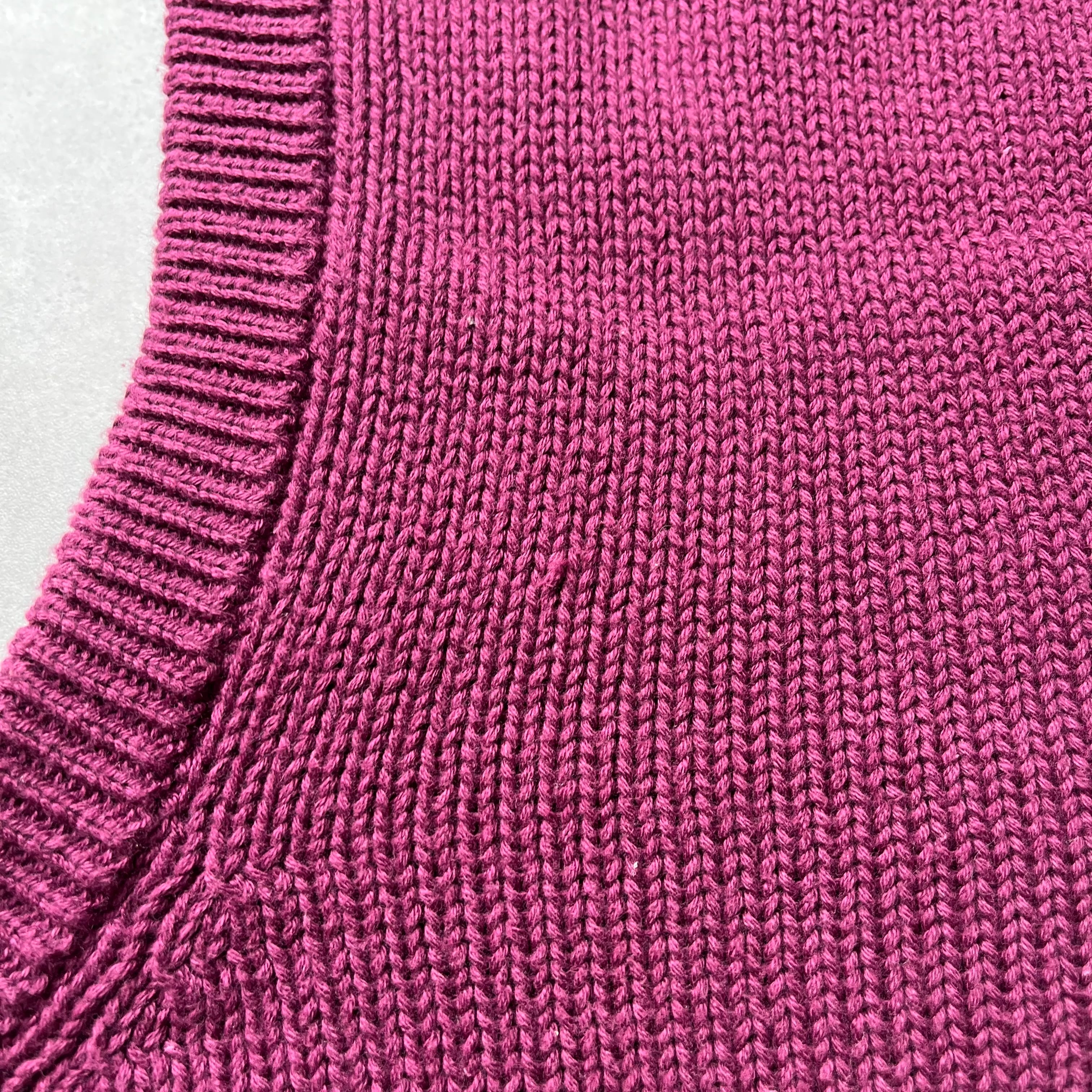 90年代、「Eddie Bauer」による、パープルカラーのコットンニットベストです。 秋らしい深みのある色合いと、程よい深さのVネックラインが特徴。厚すぎない絶妙なゲージで仕立てられており、シャツやカットソーとの重ね着でも着膨れせず、ロングシーズン活躍してくれる万能なアイテムです。