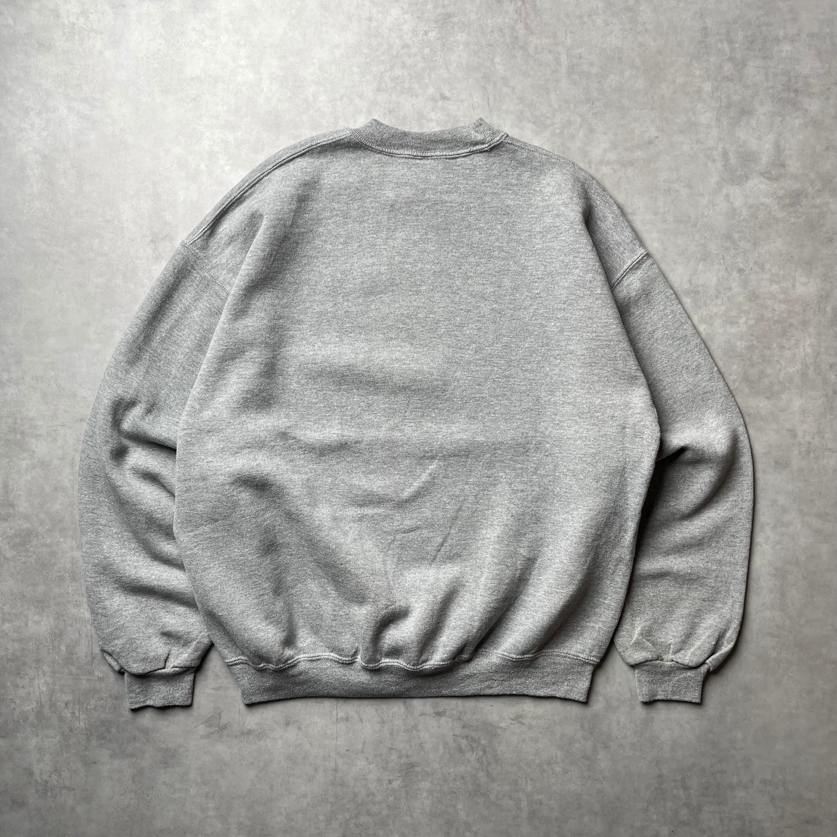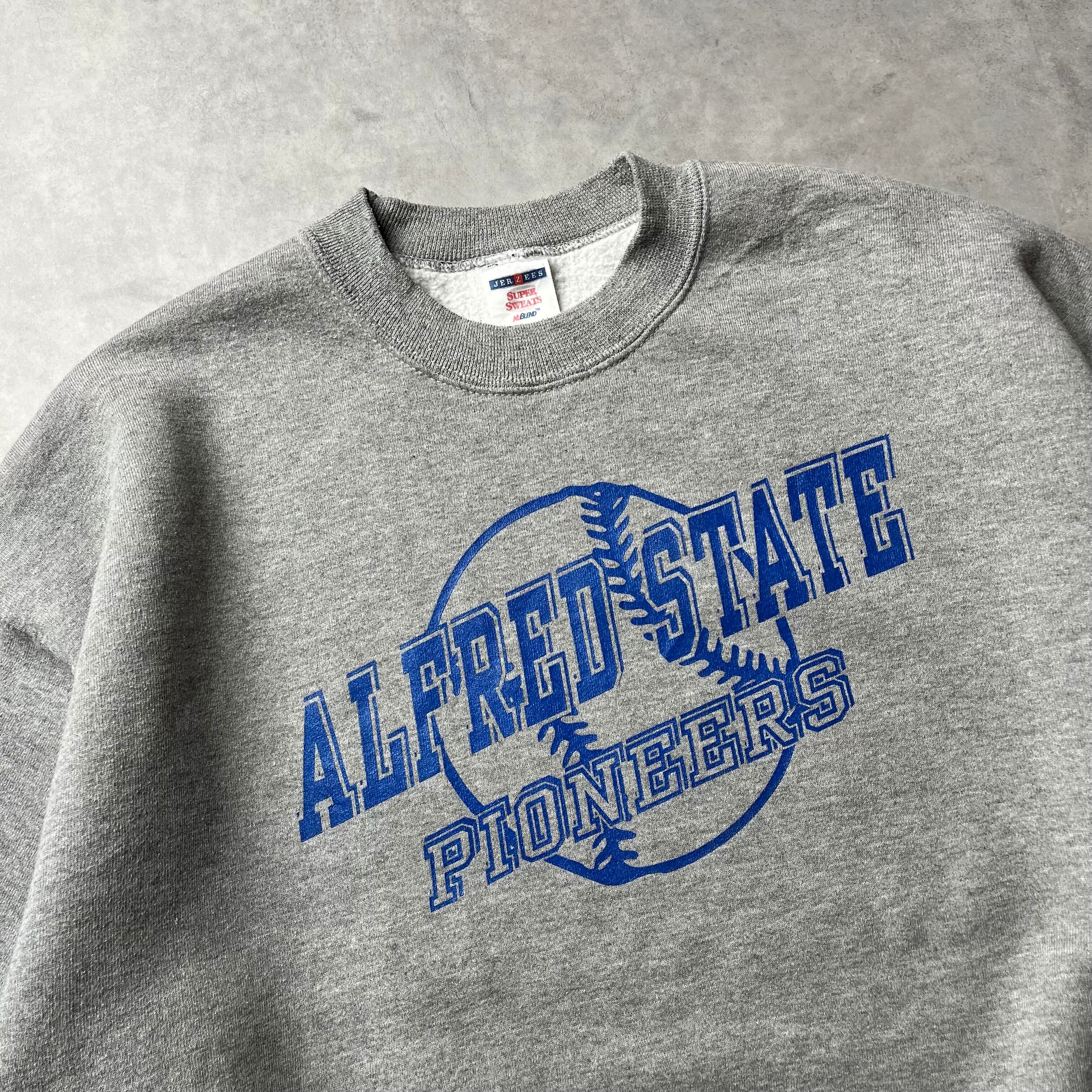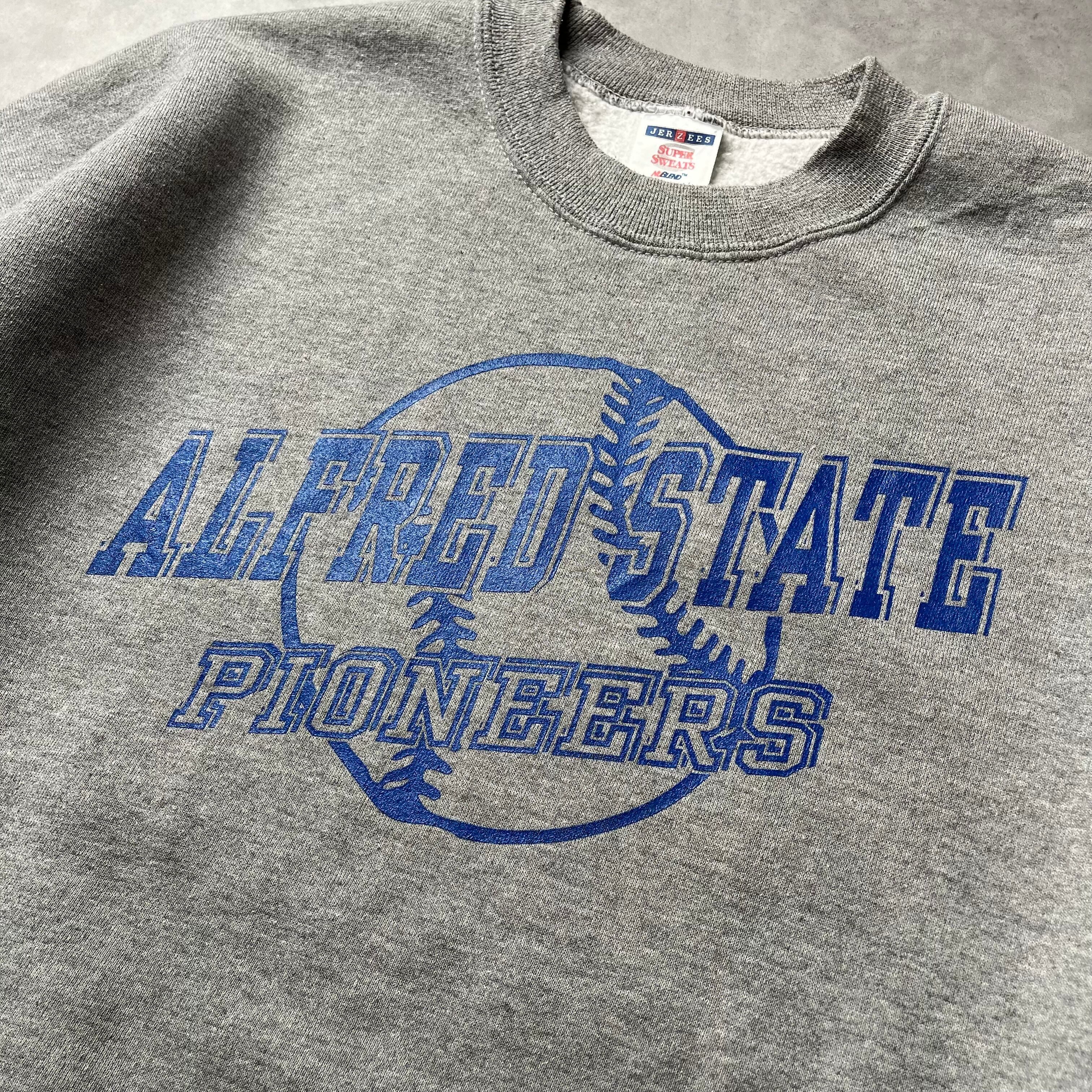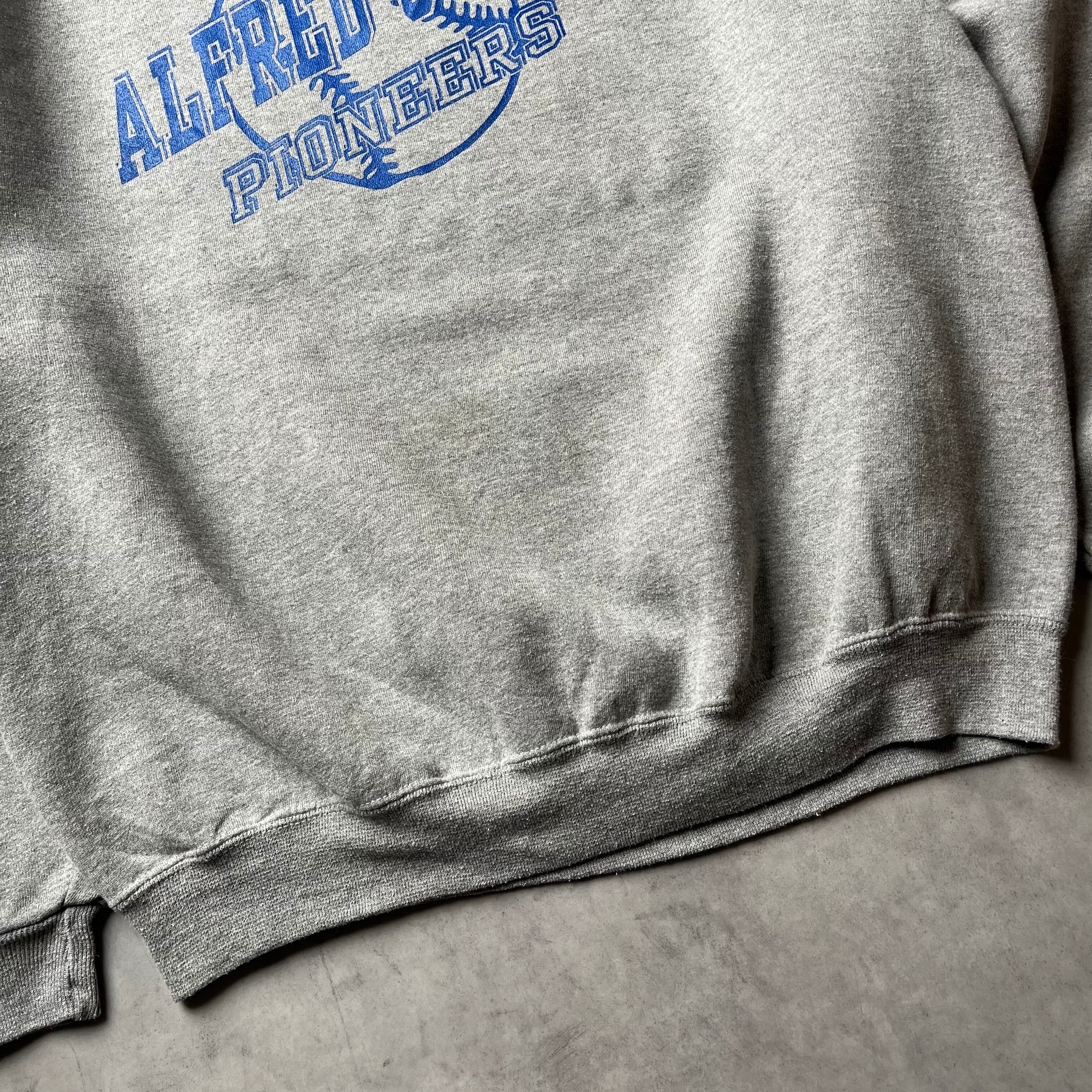 90年代のJERZEES「Super Sweats NuBlend」ボディを使用した、杢グレーのスウェットです。 ニューヨーク州の州立短大「Alfred State University」のチーム“Pioneers”のベースボールロゴが施されています。王道のカレッジデザインと、古着らしい霜降りのグレーが絶妙にマッチした、デイリーに使いやすい定番の一着です。
