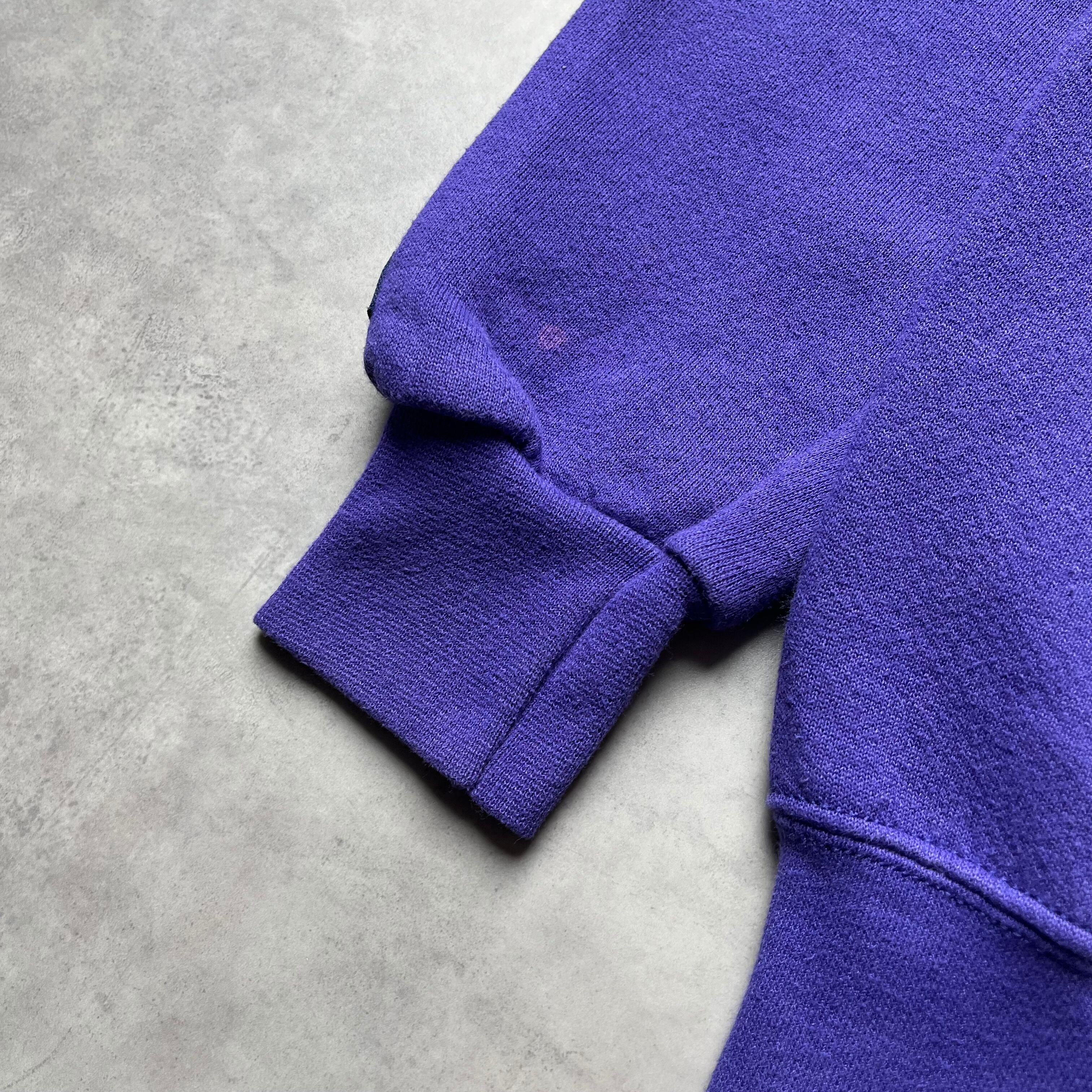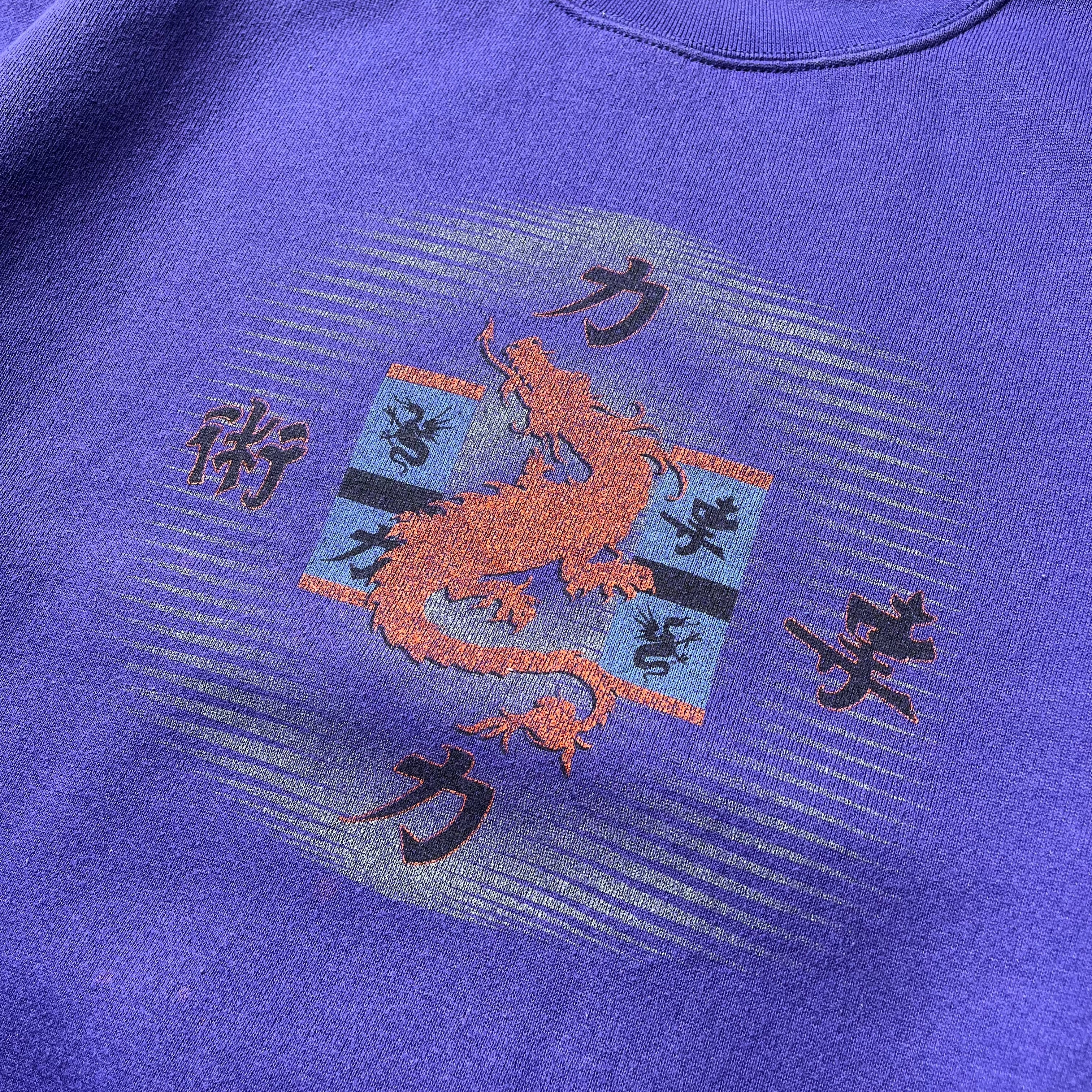 90s後半からY2Kムード漂う、JANSPORTボディを使用したパープルカラーのアートスウェットです。 フロントには鮮やかな赤い龍と「力」「術」といった漢字が組み合わされたグラフィックがプリントされています。当時の欧米から見た「クール・ジャパン / アジアン・エキゾチズム」を体現したような、独特の空気感を持つ一着です。