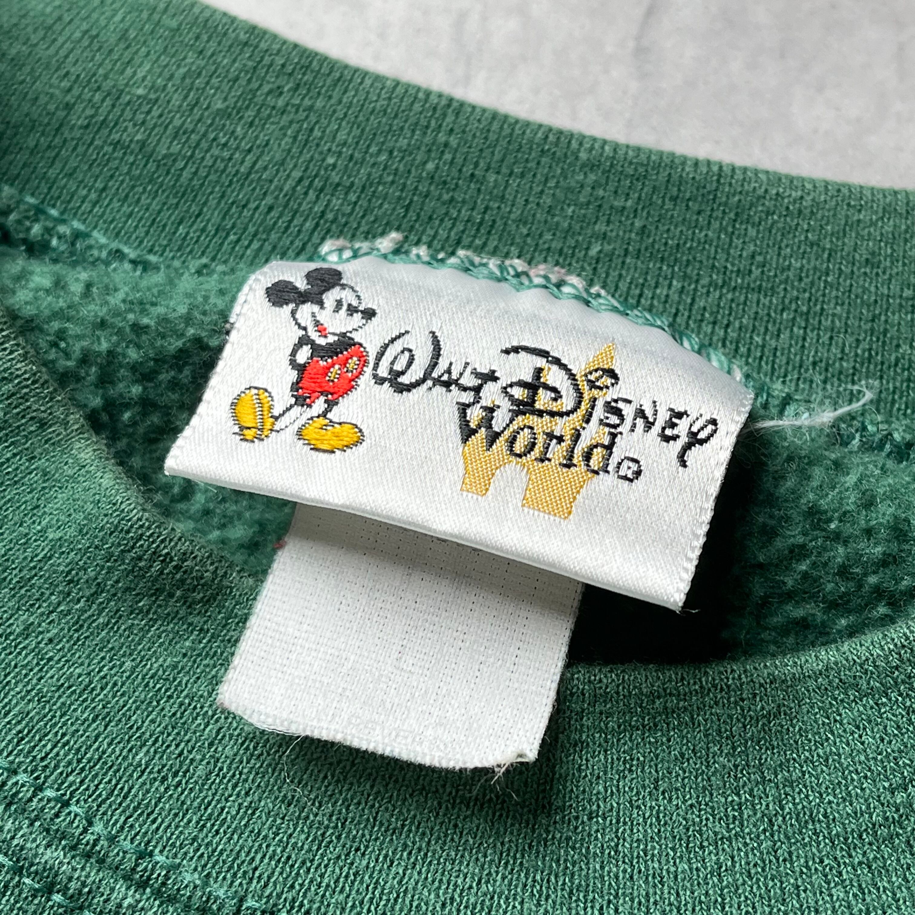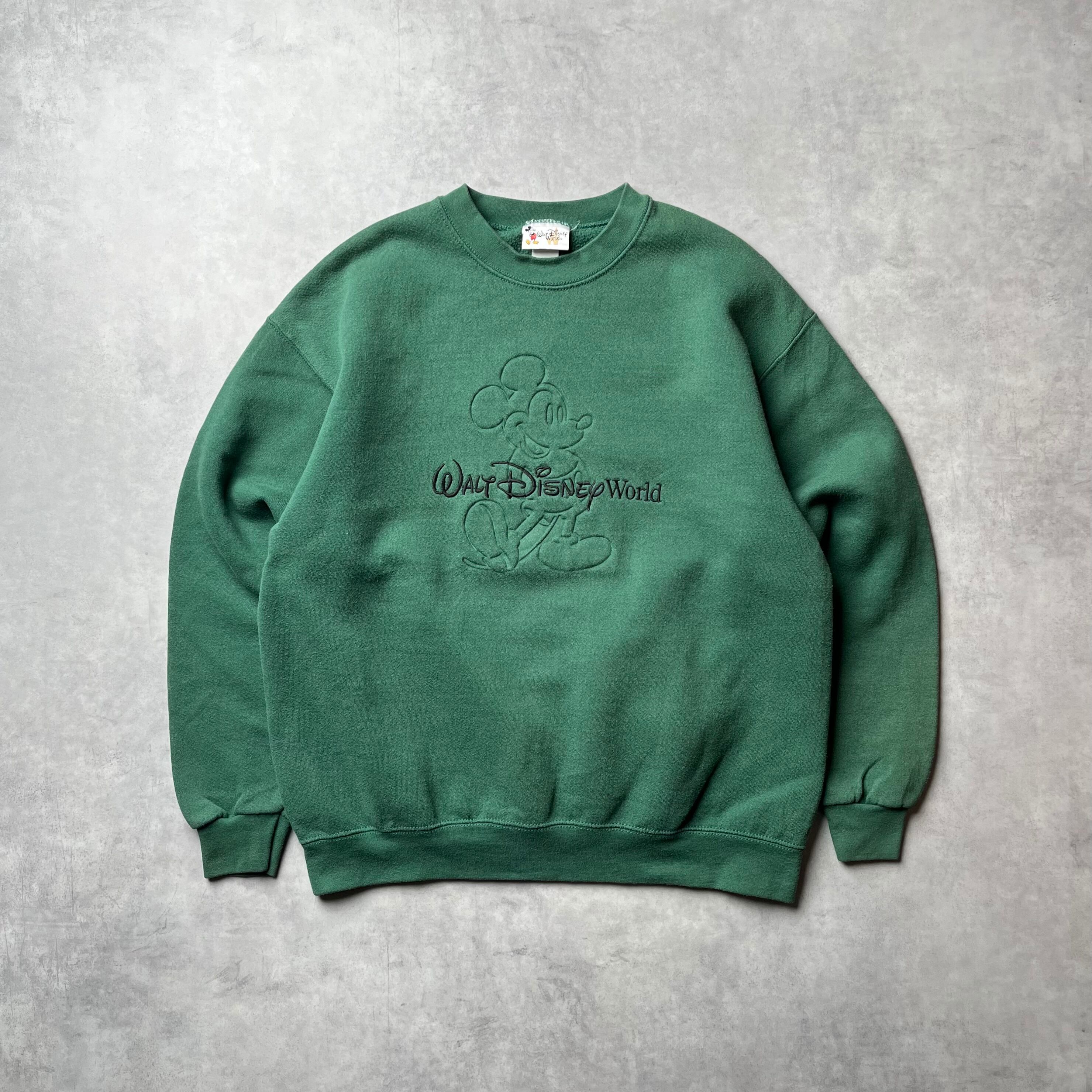 90年代の「Walt Disney World」オフィシャルスウェットです。 深みのあるグリーンボディをベースに、フロントにはミッキーマウスが「エンボス加工」で立体的に表現されています。キャラクターをあえて同系色でまとめることで、主張しすぎない上品な佇まいに仕上げられた、ヴィンテージ・ディズニーの中でも珍しいタイプの一着です。