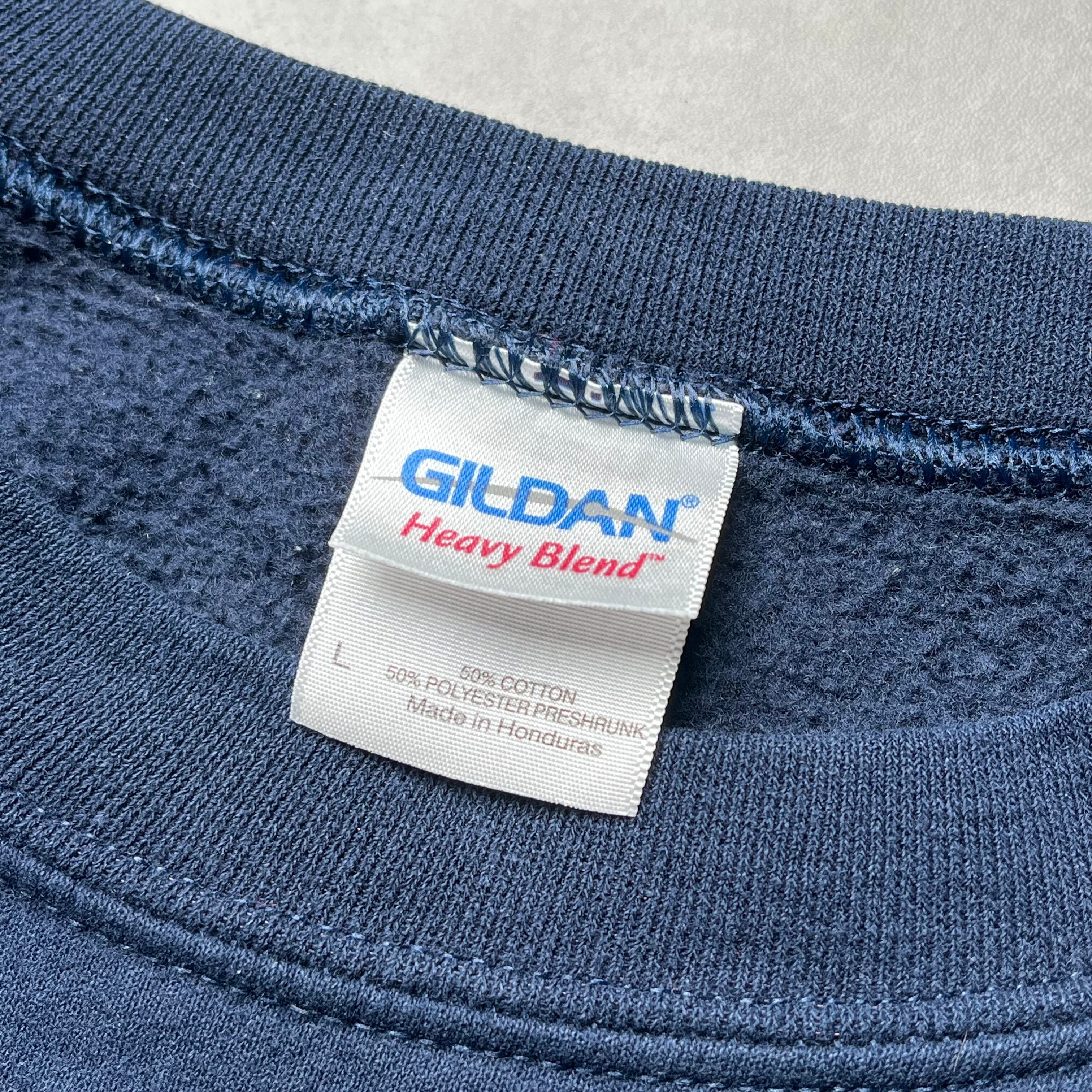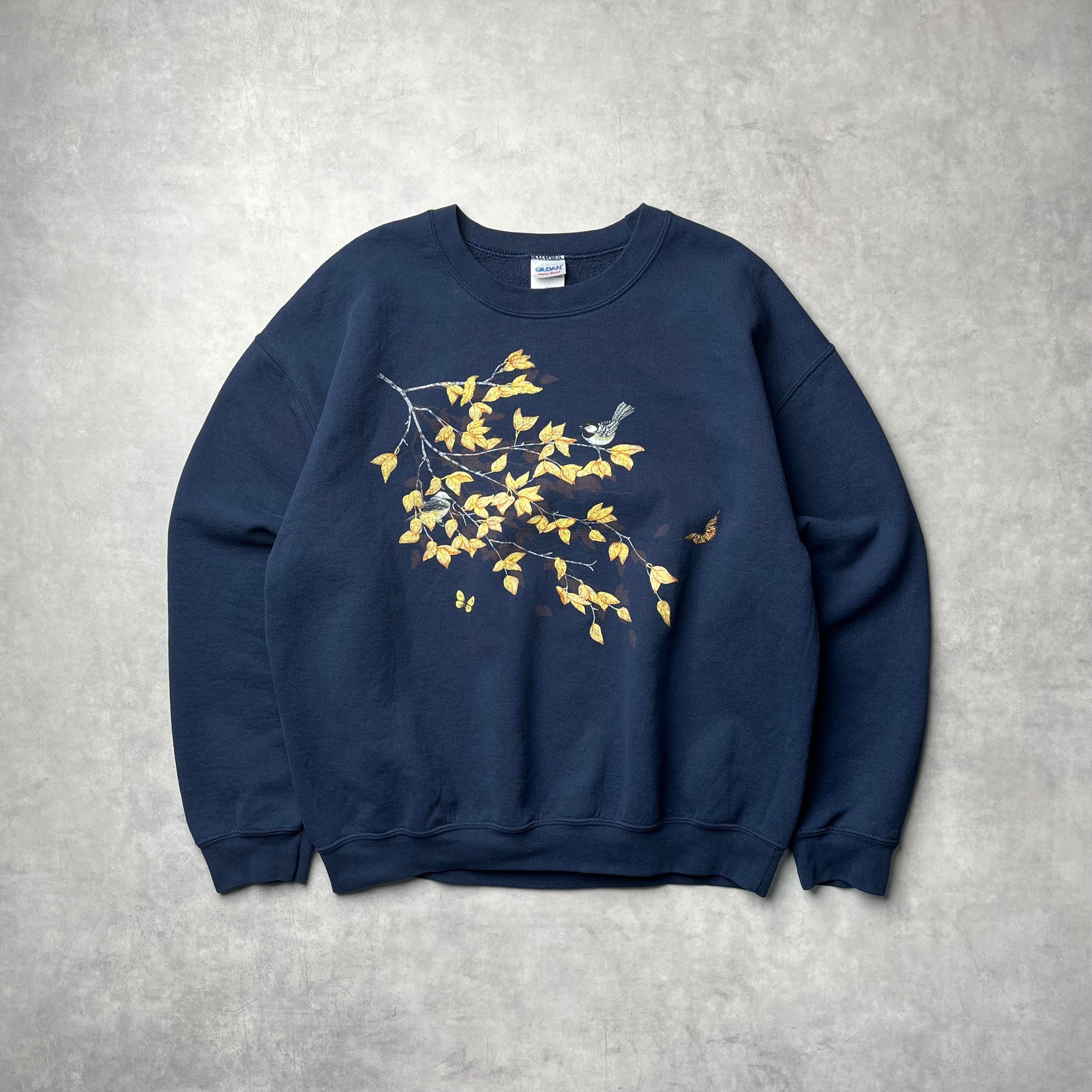 2000年代初頭のGILDANボディを使用した、グラフィックスウェットです。 深いネイビーカラーをベースに、胸元には枝に止まる小鳥や蝶、鮮やかなイエローの葉が優しいタッチで描かれています。主張しすぎないデザインながらもしっかりと季節感を感じさせる、大人な一着です。