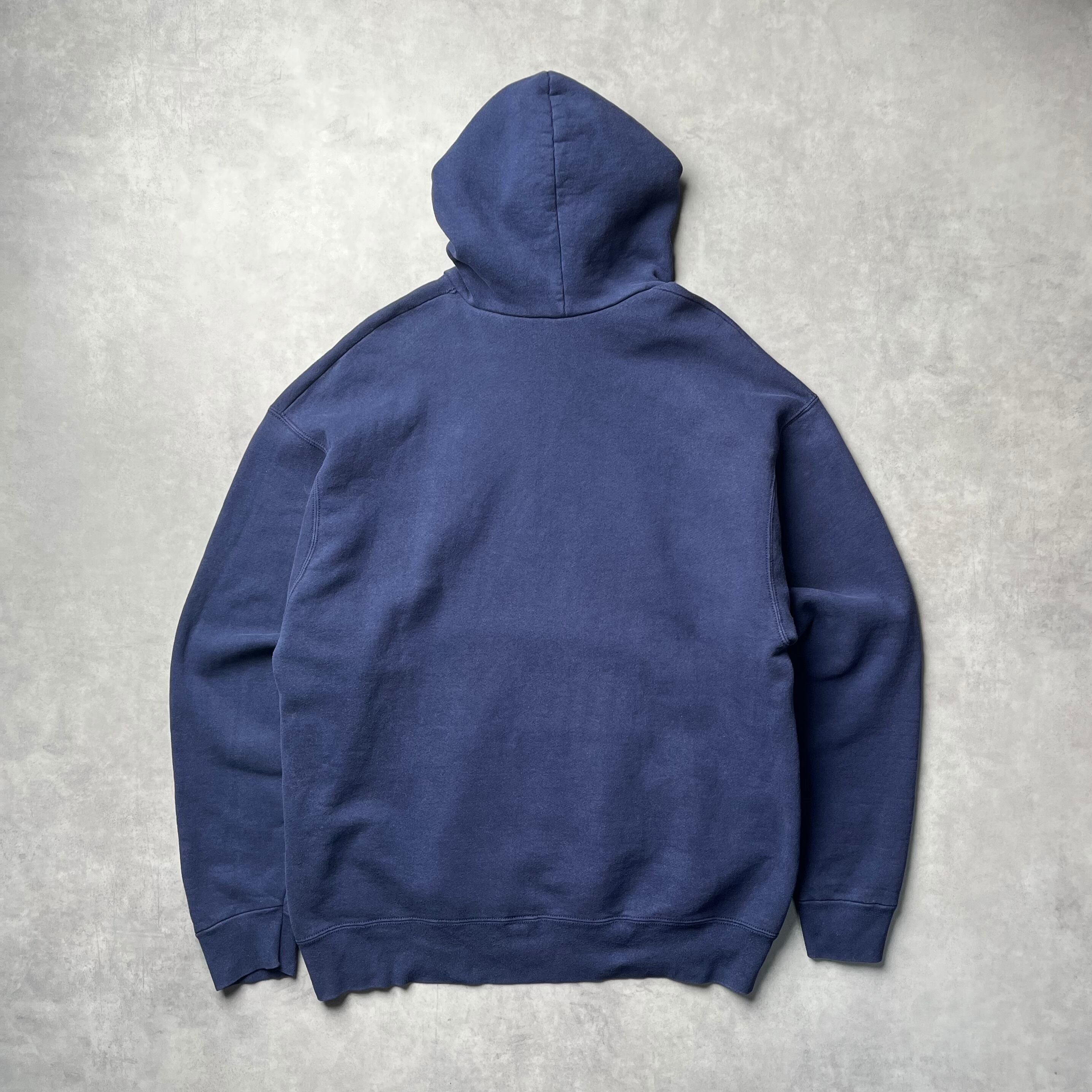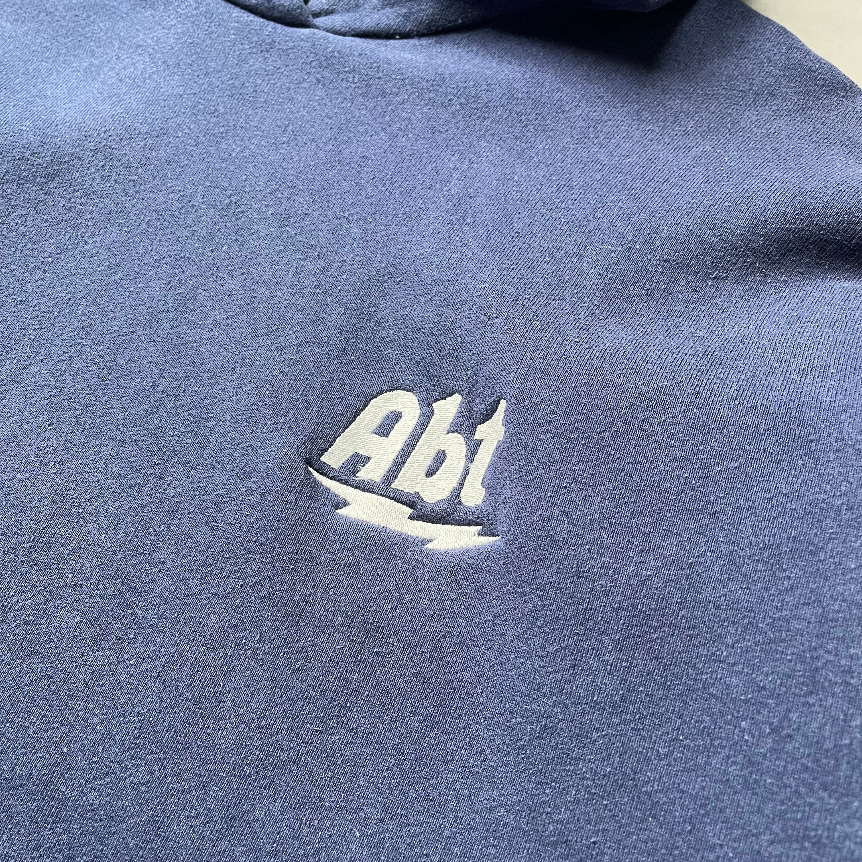90年代、アメリカの老舗ブランド「FRUIT OF THE LOOM」社製のフーディです。 胸元にワンポイントで施された「Abt」と稲妻のようなラインのロゴは、企業のスタッフ用や販促物として作られたと思われる無駄のないデザイン。ネイビーの単色ボディに、古着ならではの経年変化による風合いが絶妙にマッチした、シンプルながらも存在感のある一着です。
