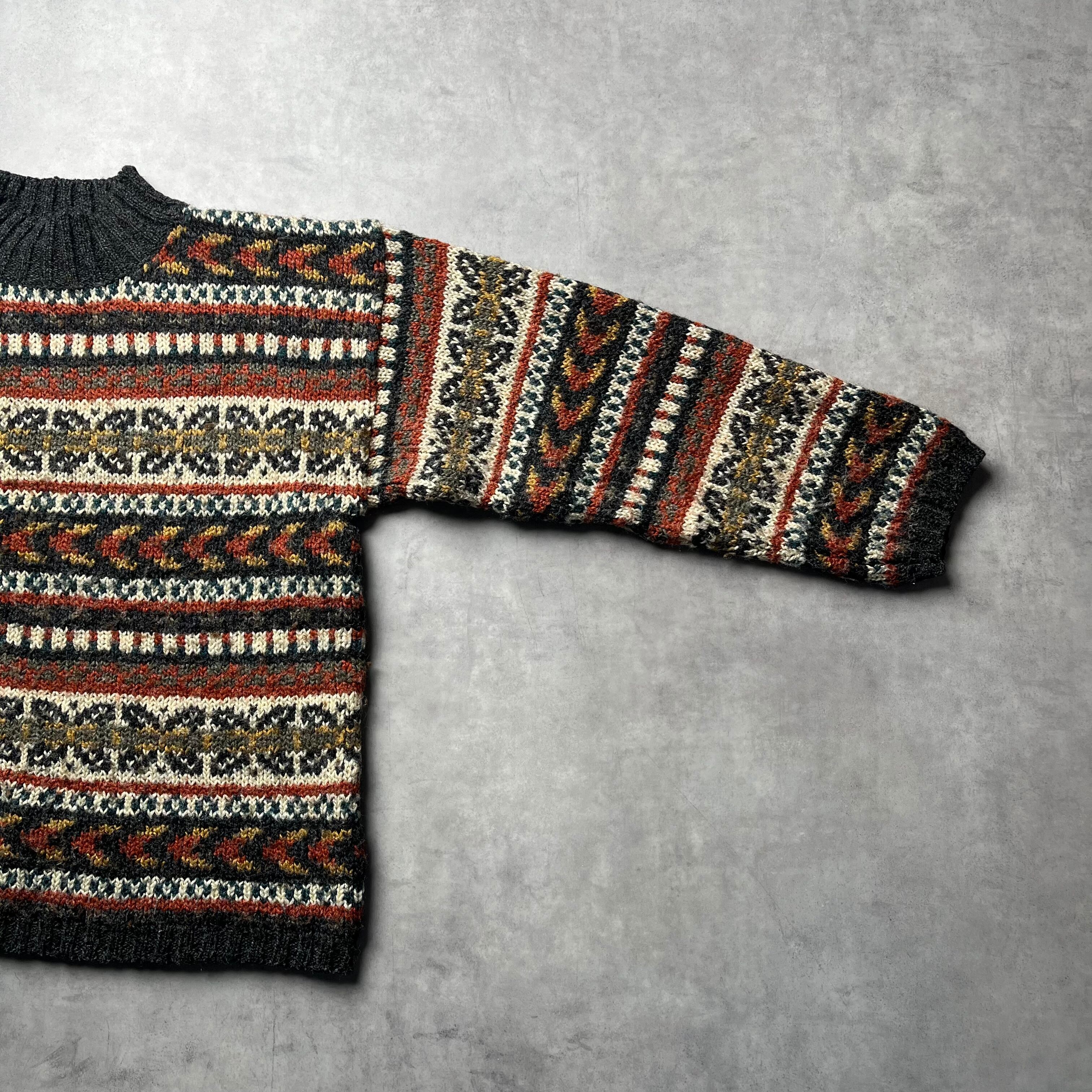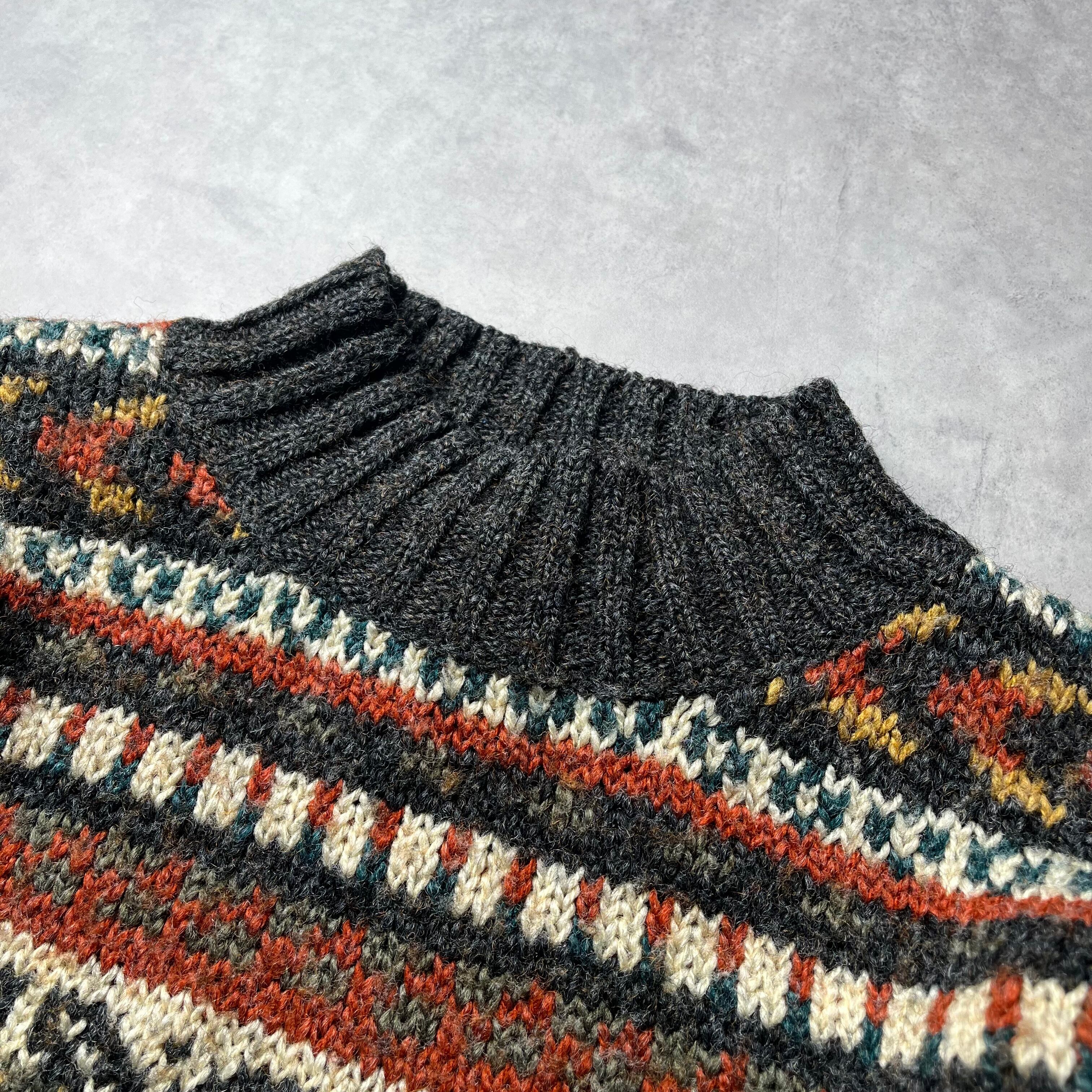 2000年代初頭の「Susquehanna Trail Outfitters」による総柄ニットです。 チャコールグレーをベースに、レンガ・マスタード・ボトルグリーンといったアースカラーを絶妙に配したフェアアイル柄が特徴。「渋さ」と、都会的なエッセンスが同居した、一着です。