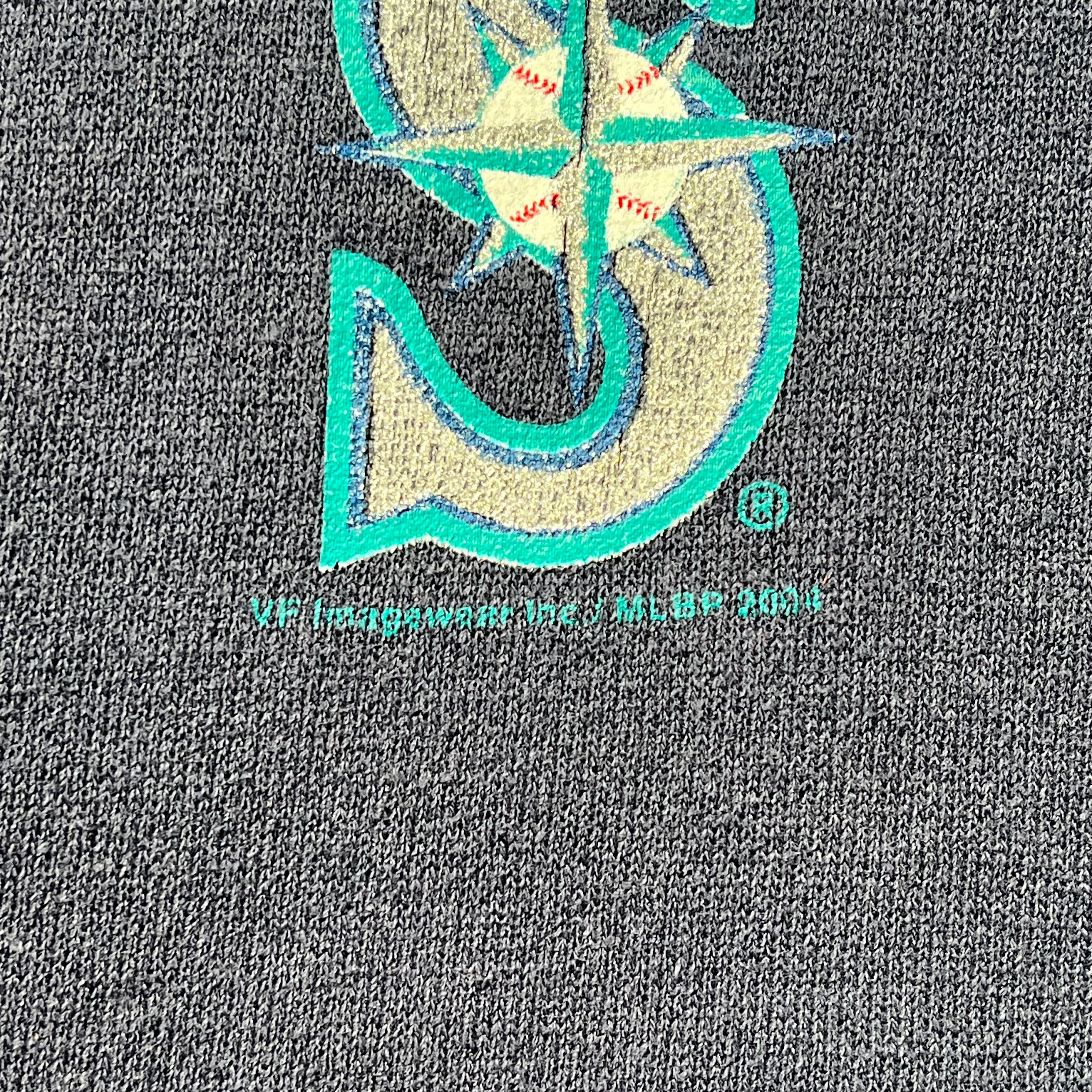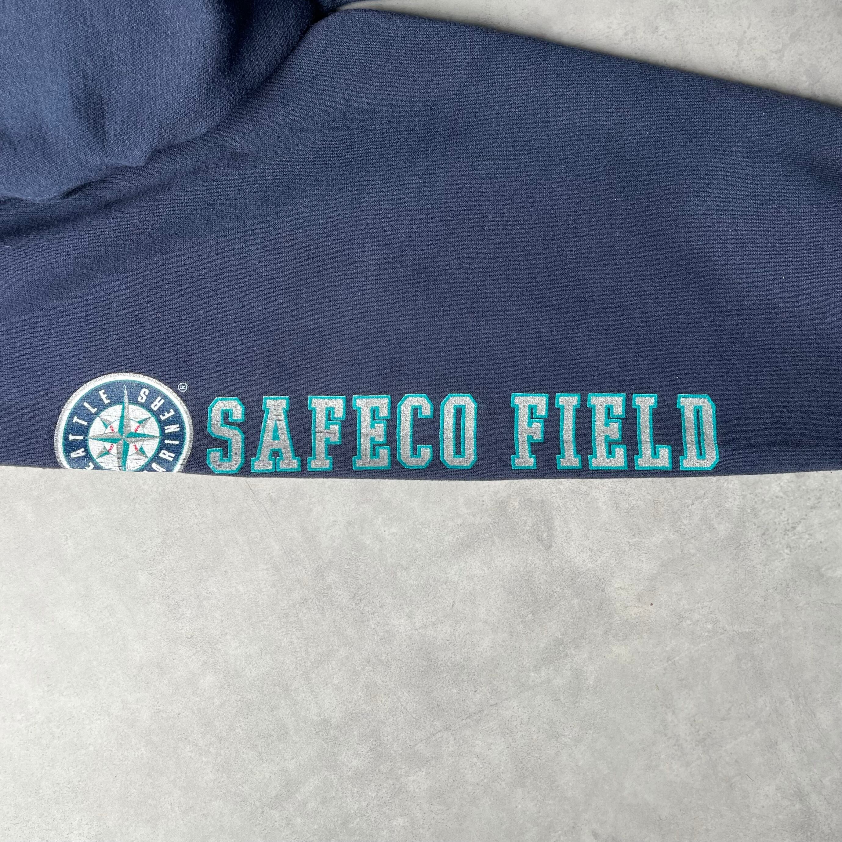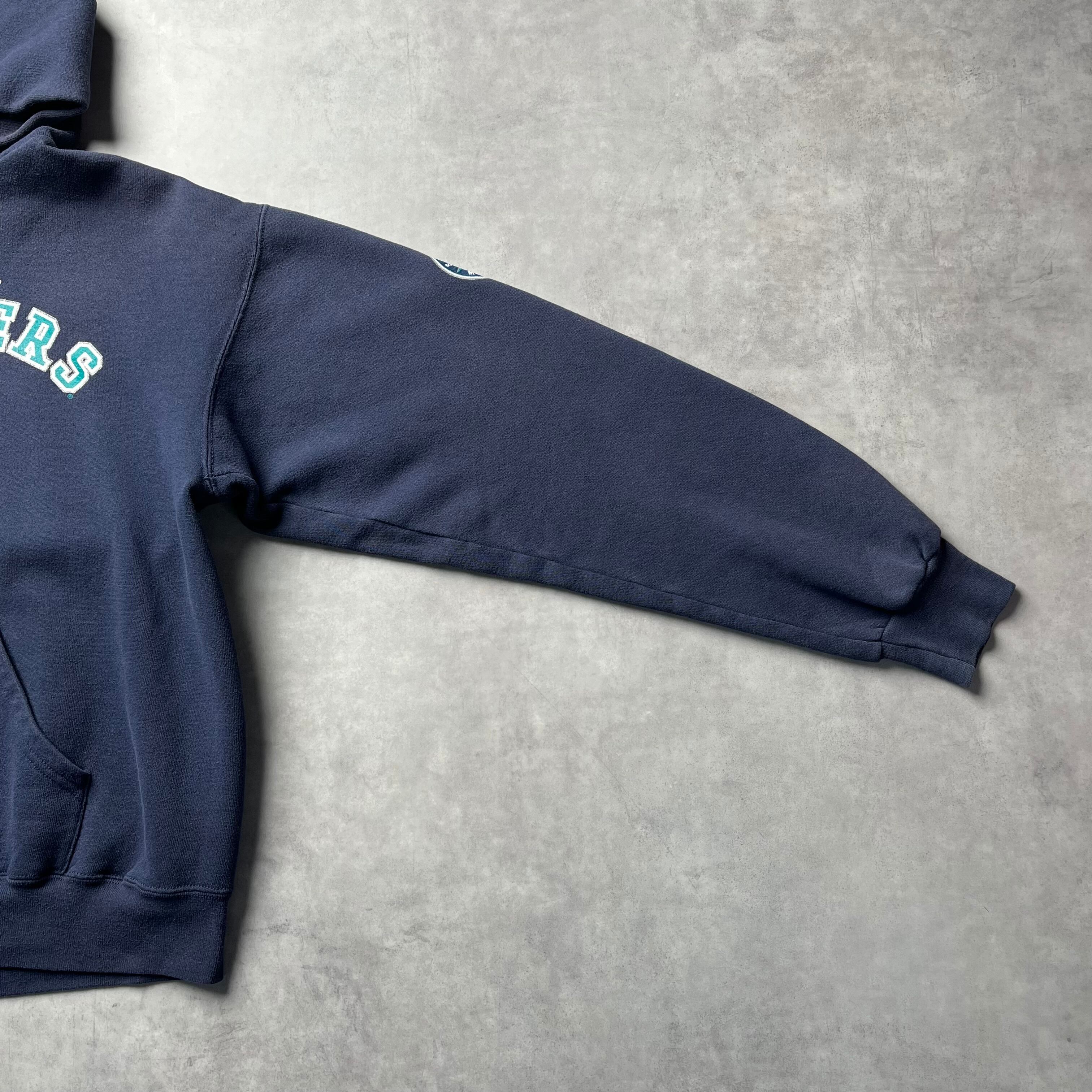 2000年代初頭のLee SPORT製、シアトル・マリナーズのオフィシャルスウェットパーカーです。 フロントに施されたアーチ状の「MARINERS」ロゴと、象徴的なコンパスロゴ入りの「S」が目を惹く王道のデザイン。ちょうどイチロー選手がメジャーに挑戦し、全米を熱狂させていた時期のアイテムです。