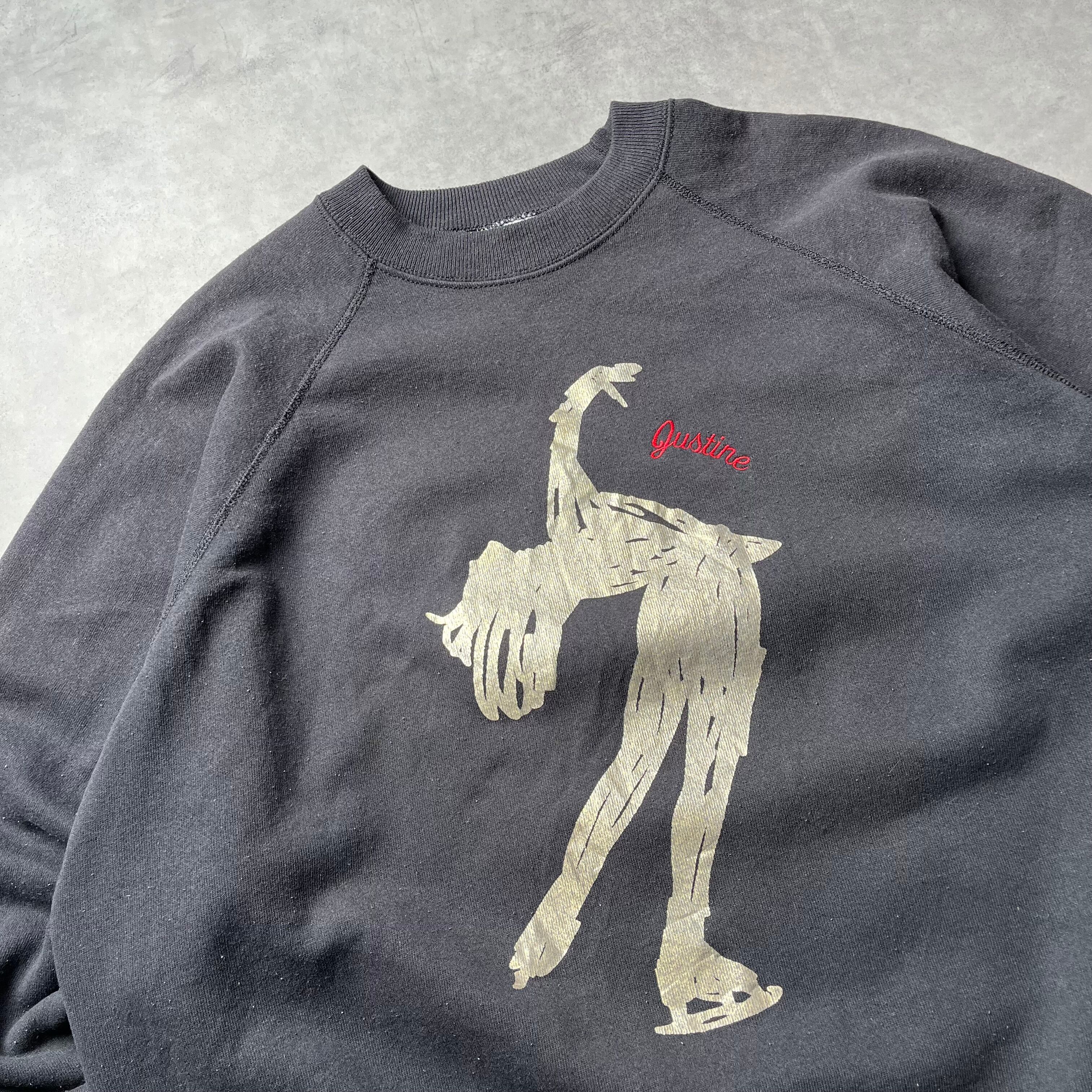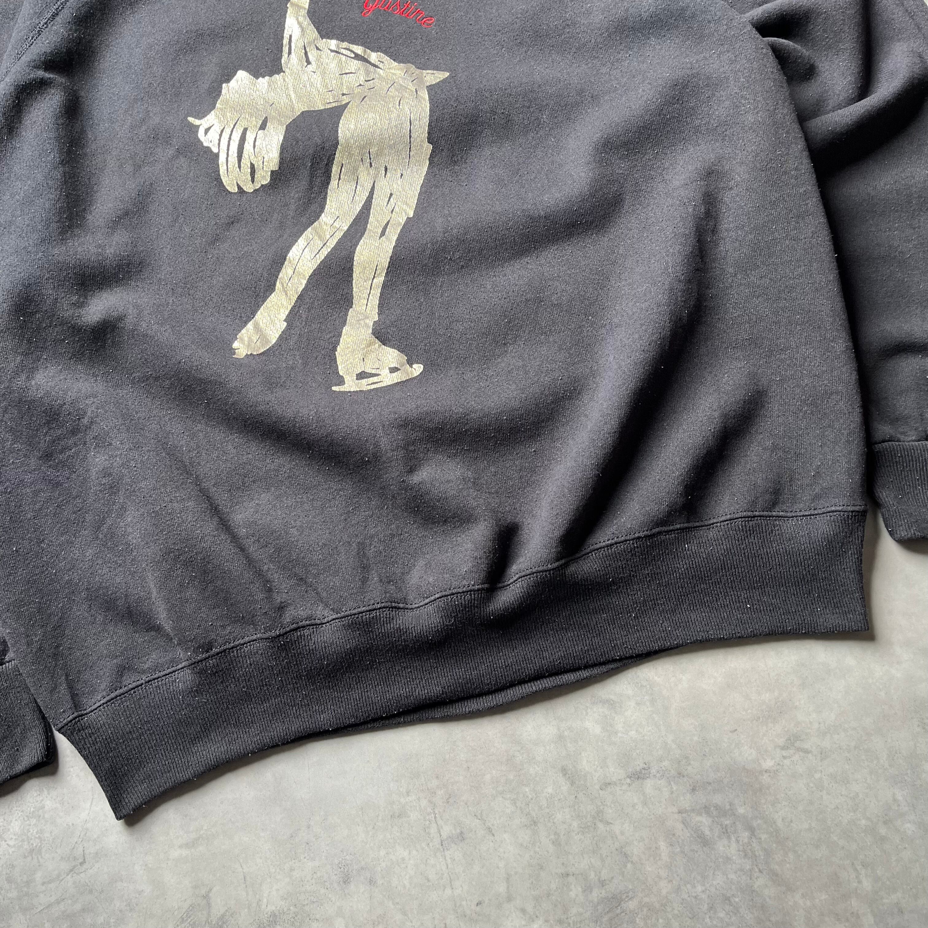 フロントにはフィギュアスケーターのようなシルエットを、ざくっとしたタッチのゴールドプリントで表現。胸元には赤いロゴで「Justine」と入った、アートポスターのような一枚です。