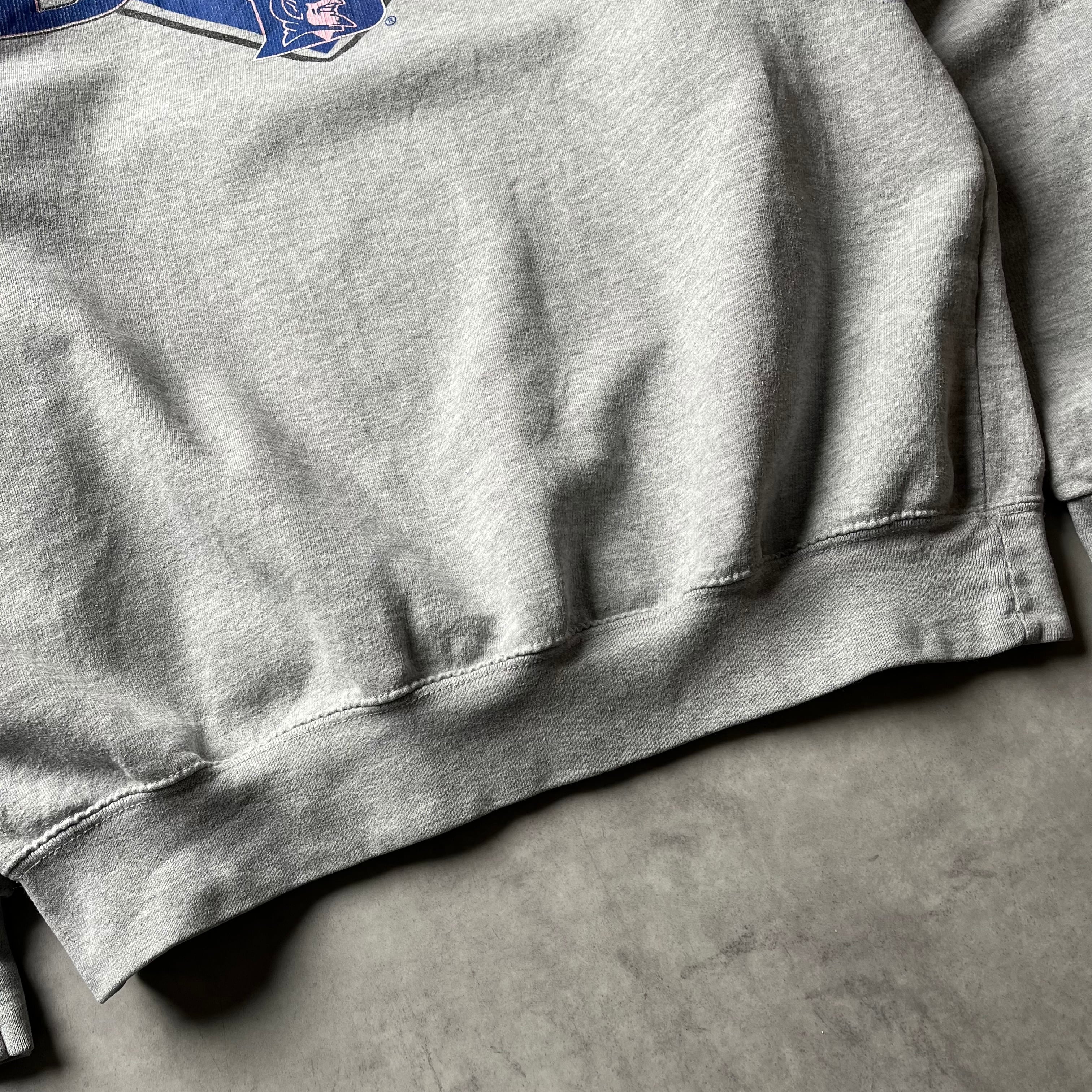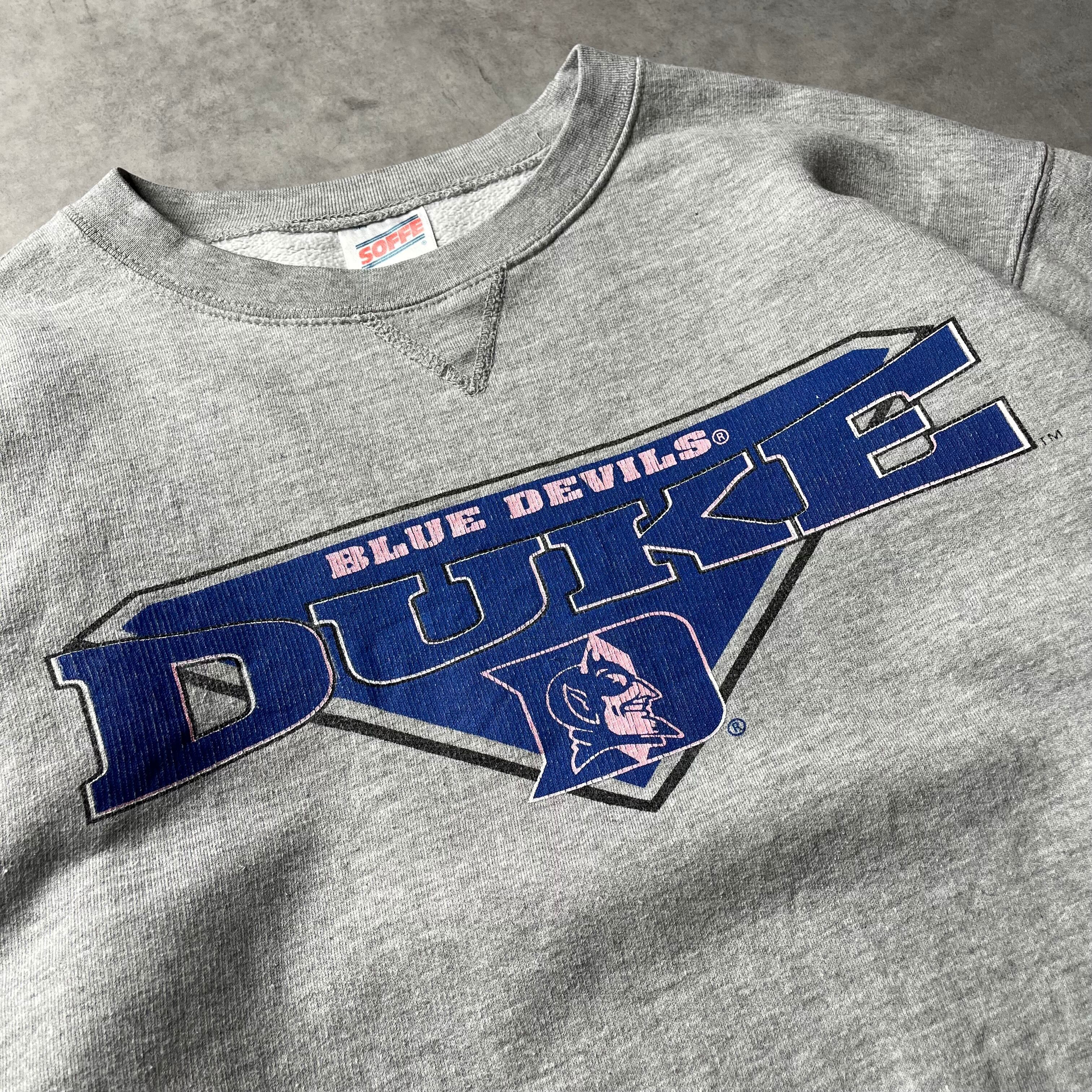 米バスケットボール界の至宝、ノースカロライナ州デューク大学のスポーツチーム「DUKE BLUE DEVILS」のオフィシャルロゴスウェットです。 数々のNBAスターを輩出してきた名門校のチームロゴを配した、カレッジ古着好きなら避けては通れない、ストリートでも圧倒的な支持を誇る定番の一着です。