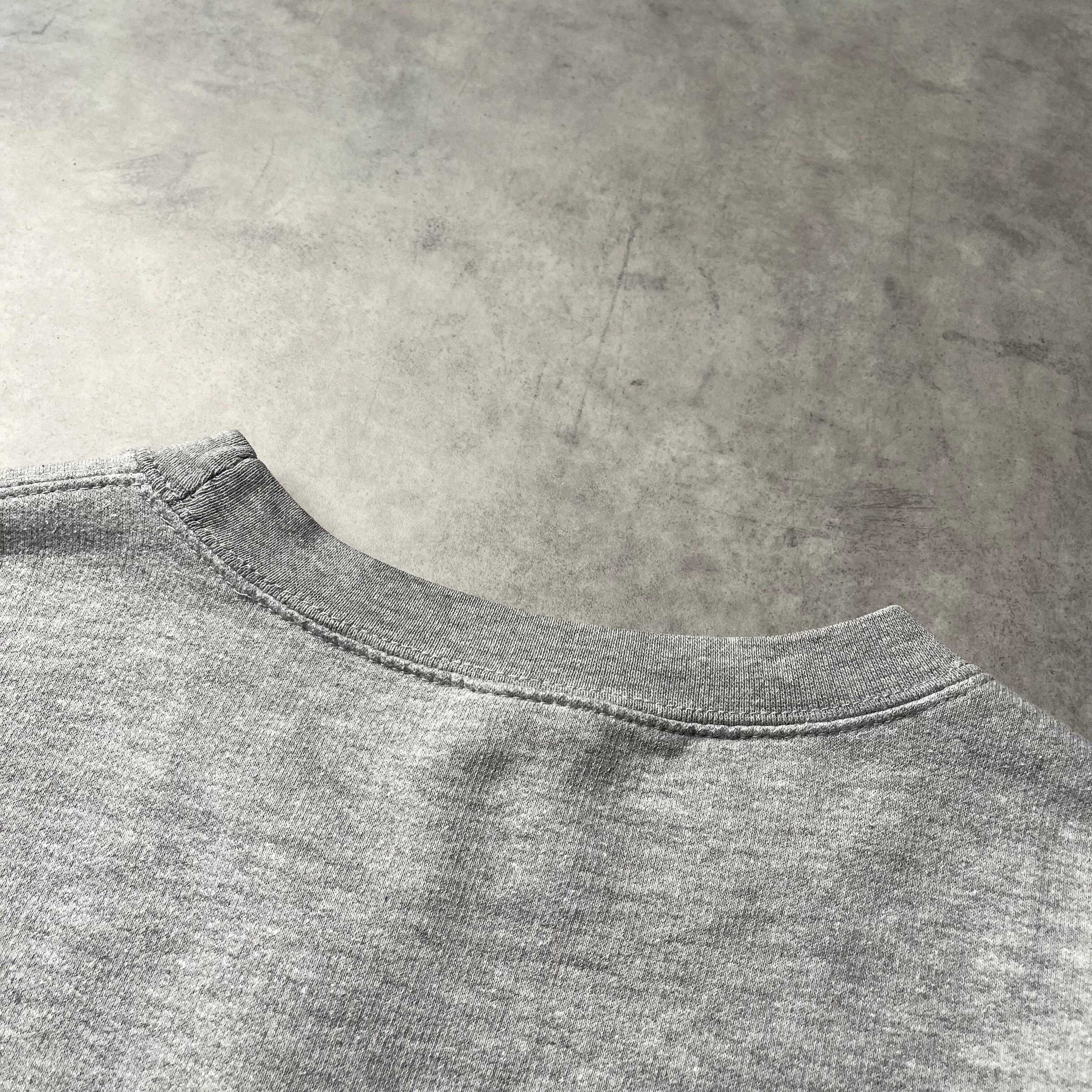 《ヴィンテージライクなVガゼット》首元には、古き良きスウェットの代名詞である「Vガゼット風の切り替え」入り。シンプルなグレーボディに、このディテールがあるだけで、グッと本格的なヴィンテージの雰囲気が高まります。