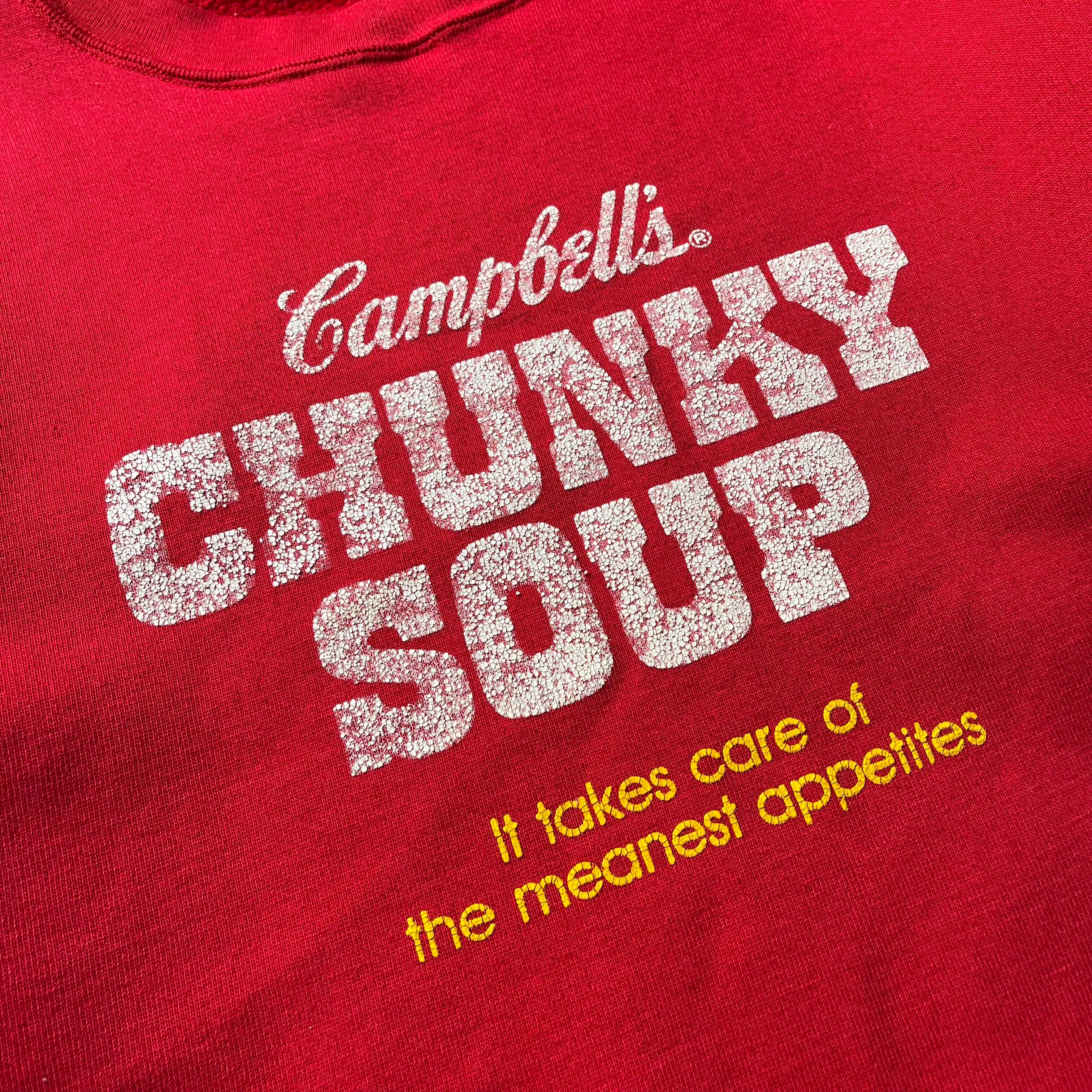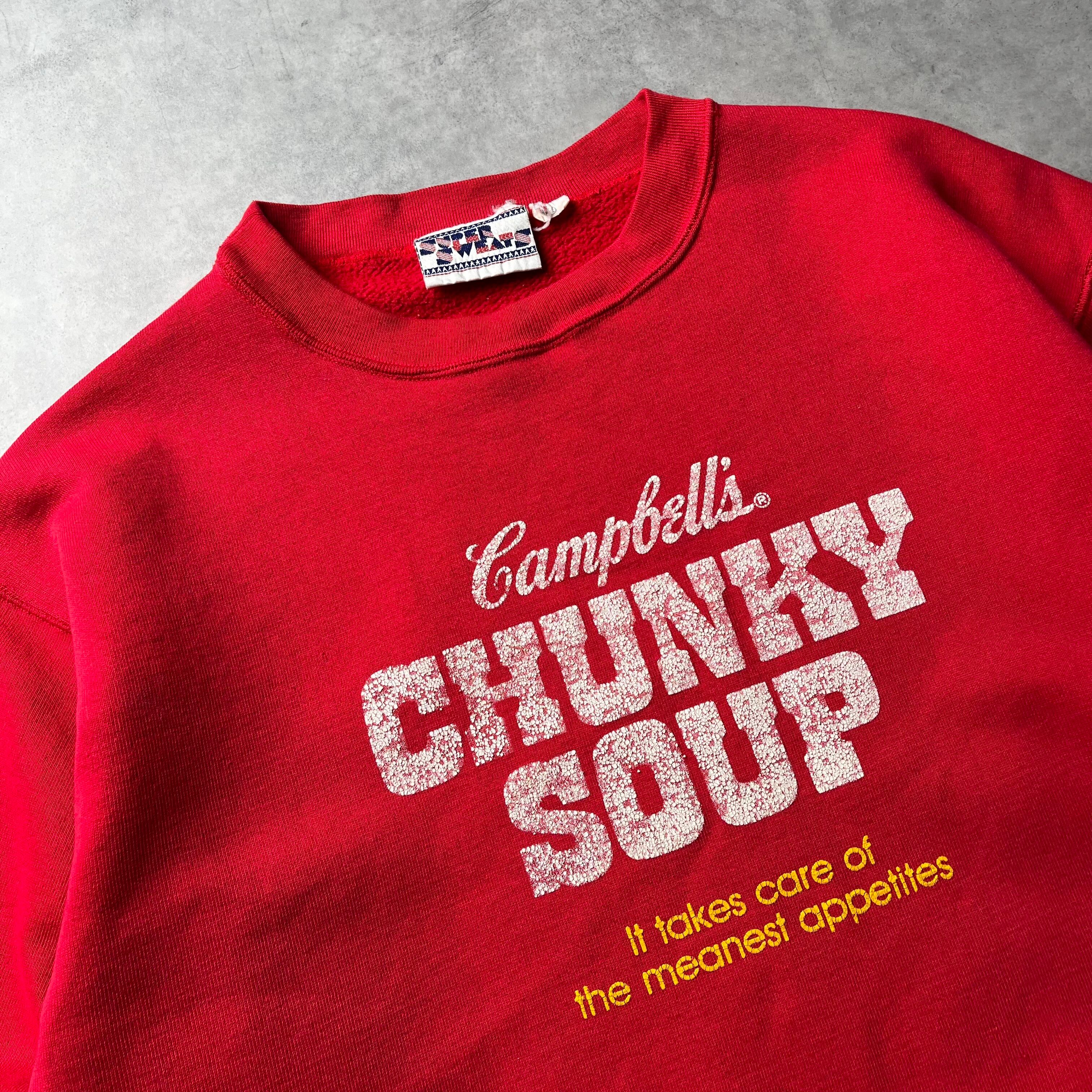 アメリカの老舗食品ブランド「キャンベル」が展開する、具だくさんなスープシリーズ「CHUNKY SOUP」のロゴが主役の一着。 広告コピーの「It takes care of the meanest appetites(最高の空腹を満たす)」という強気なフレーズが、いかにもアメリカらしい遊び心を感じさせる企業系スウェットです。