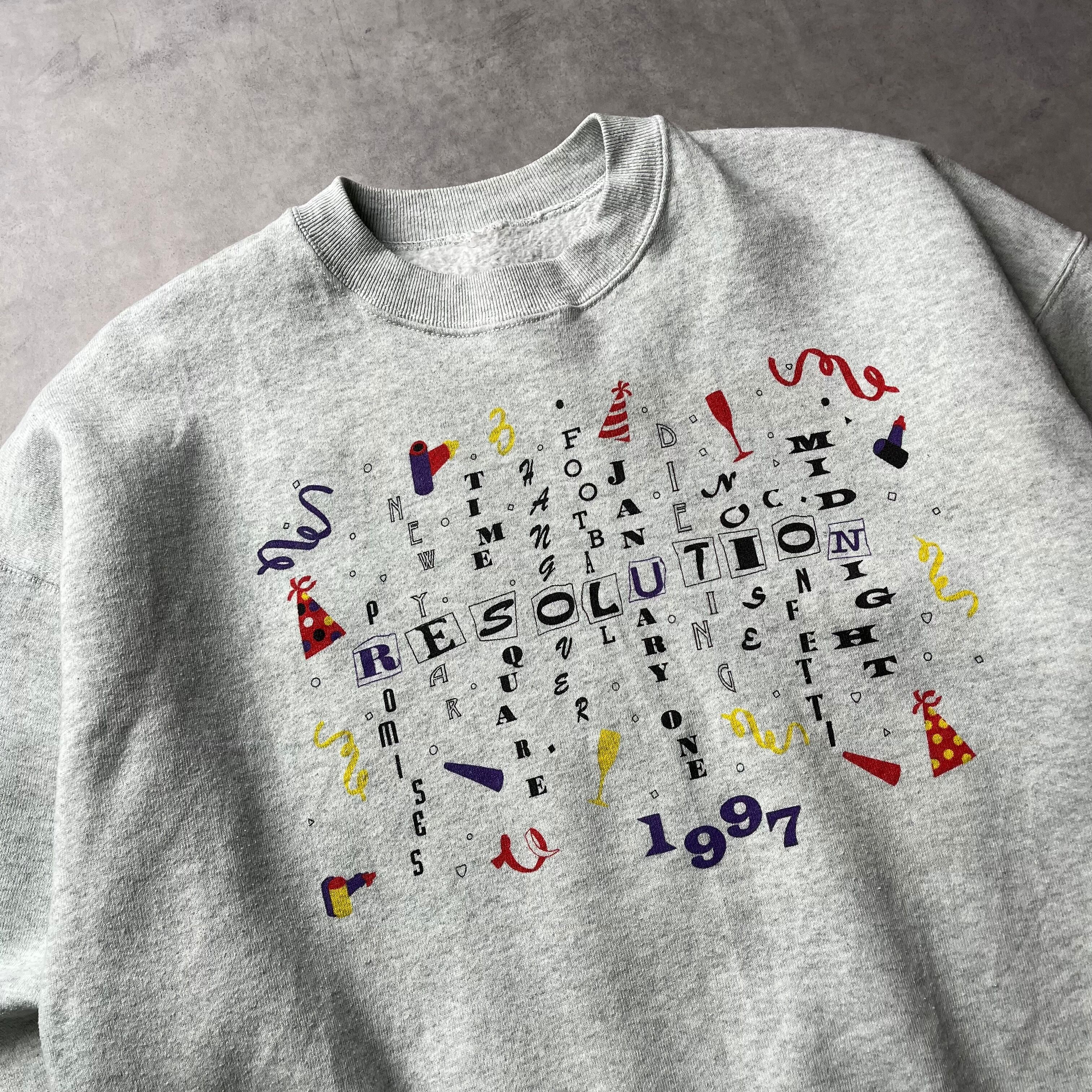 クラッカーやリボンが散りばめられた、祝祭ムード全開のグラフィックが目を引く90年代のスウェット。 "RESOLUTION 1997"をテーマに、文字パズルを組み合わせたような多色使いのプリントが、古着ならではの「一点物感」を際立たせる一着です。