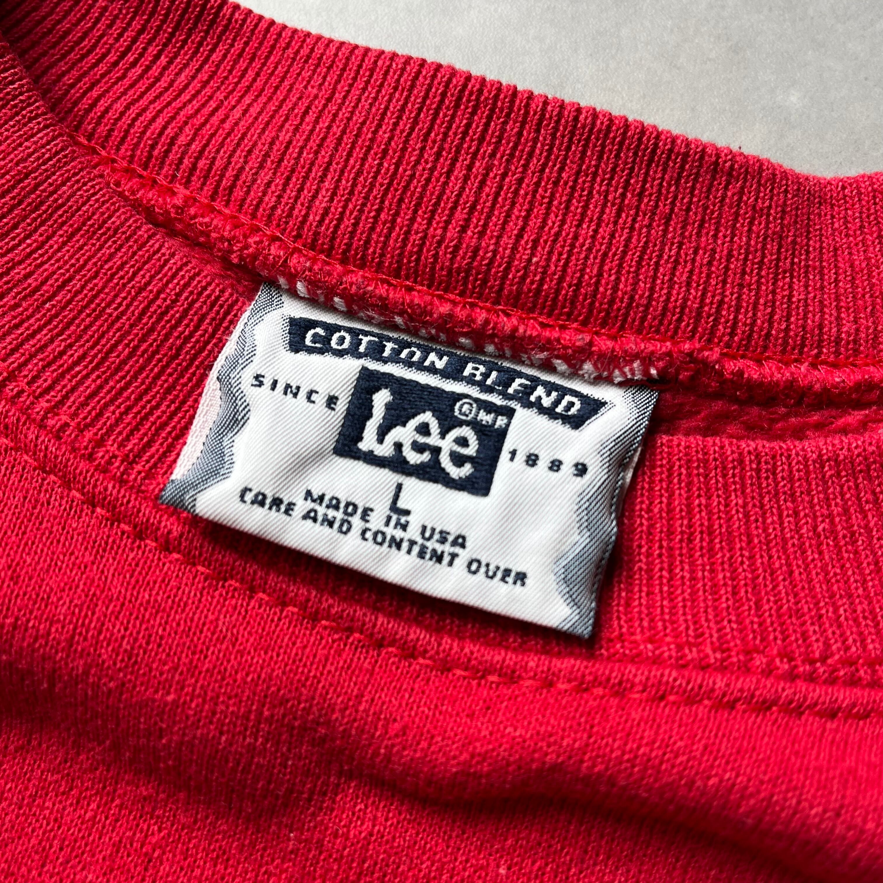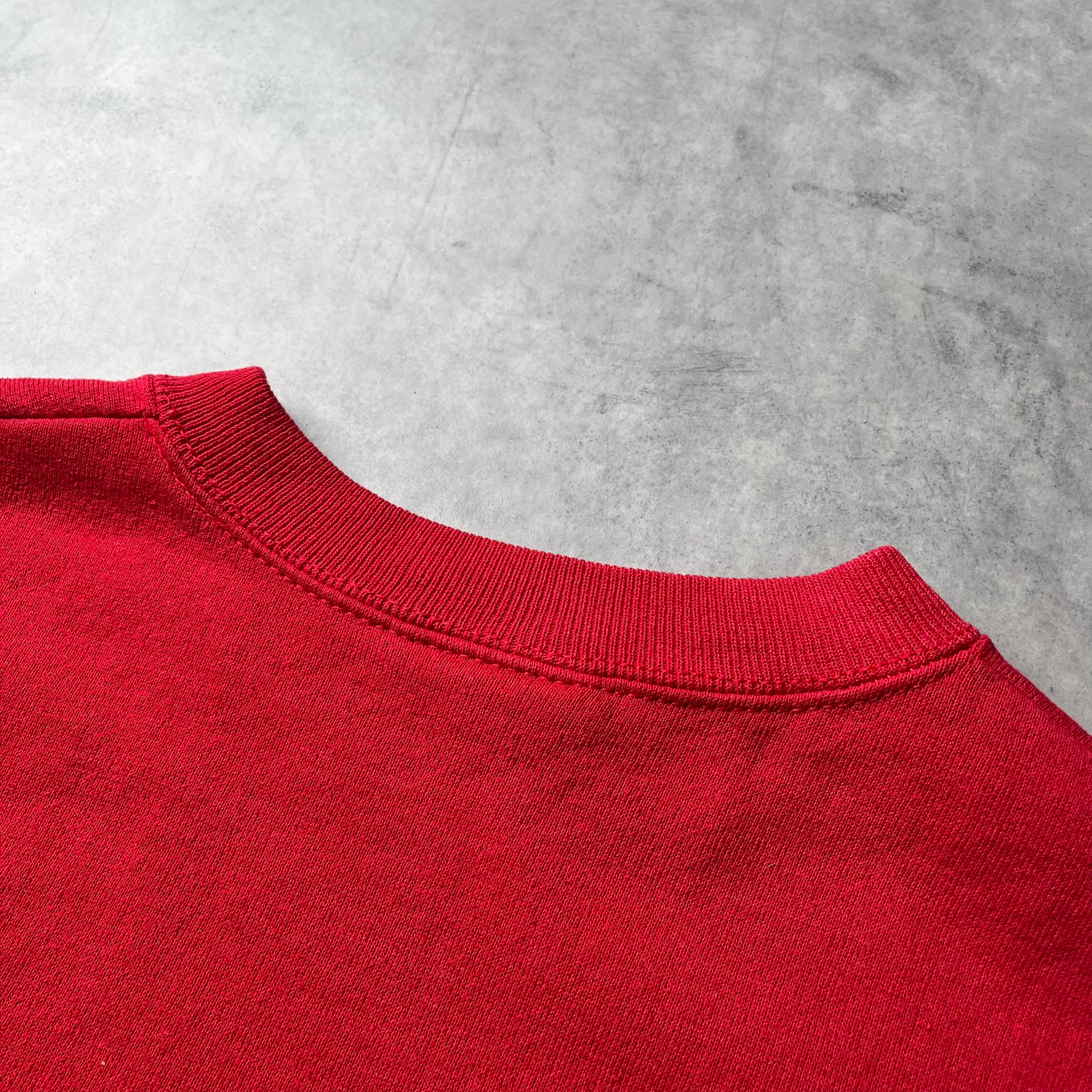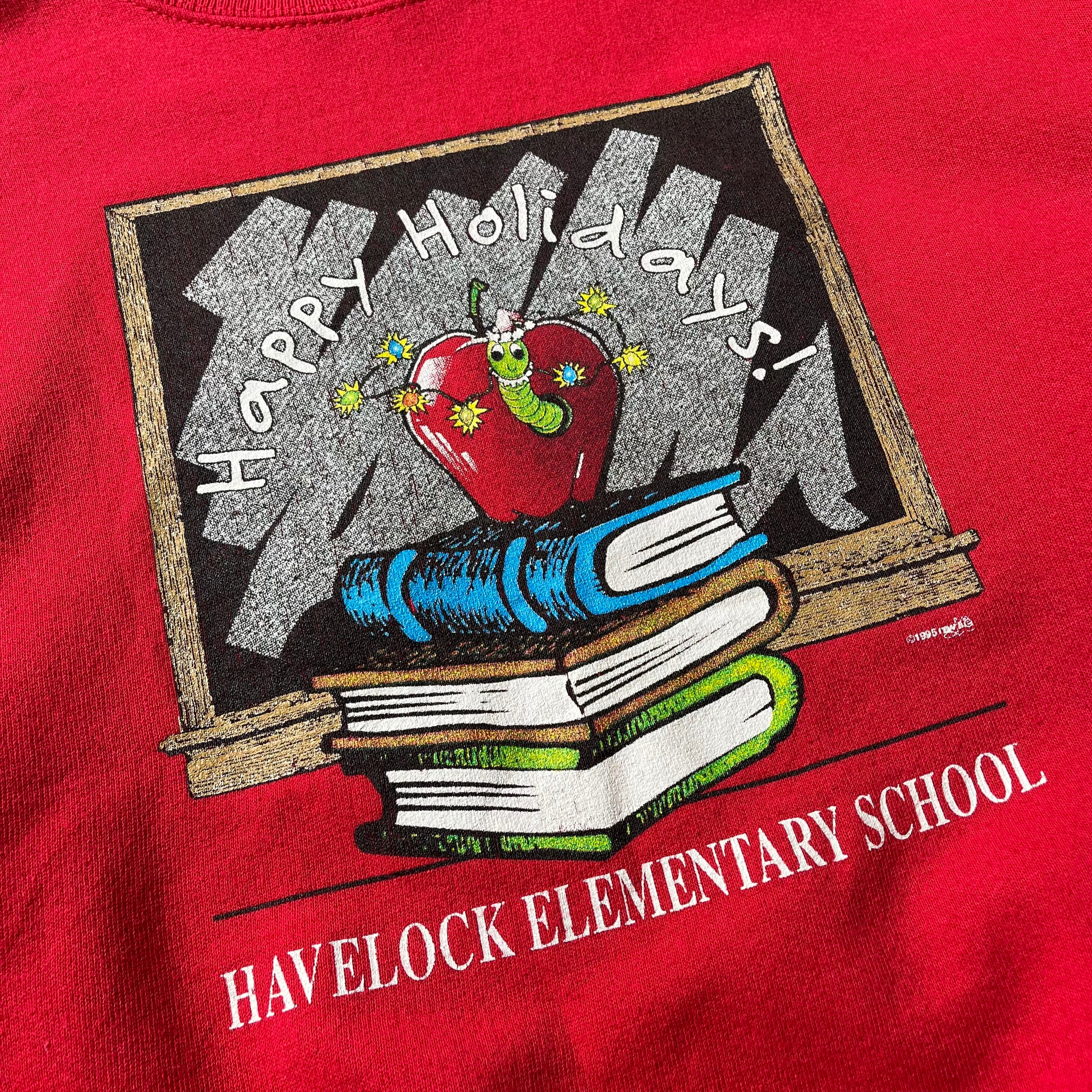 パキッと映えるレッドボディに、りんご・本・虫くんという最高にキュートなグラフィックが載った、90年代のLee製スウェット。 「HAVELOCK ELEMENTARY SCHOOL」のスクールネームが入った、アメリカのイベント系スウェットらしい、一点物感あふれるハッピーな一着です。