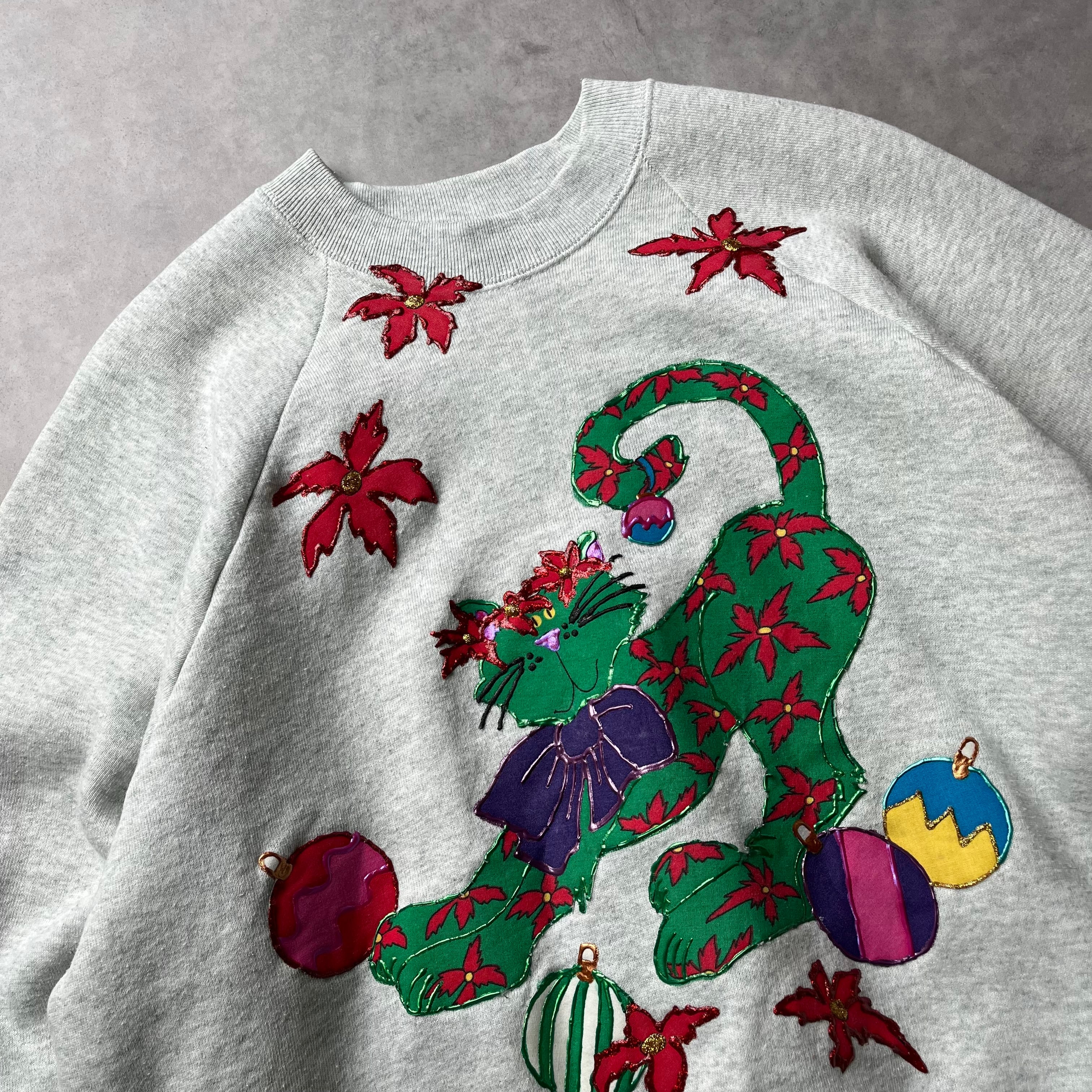 《表情豊かな立体パフ&メタリックプリント》 最大の特徴は、猫の生地と輪郭を縁取るメタリック・グリッターの装飾です。グリーンの猫とポインセチア、そしてオーナメントが鮮やかに描かれており、平面的なプリントにはない奥行きとクラフト感を楽しめます。