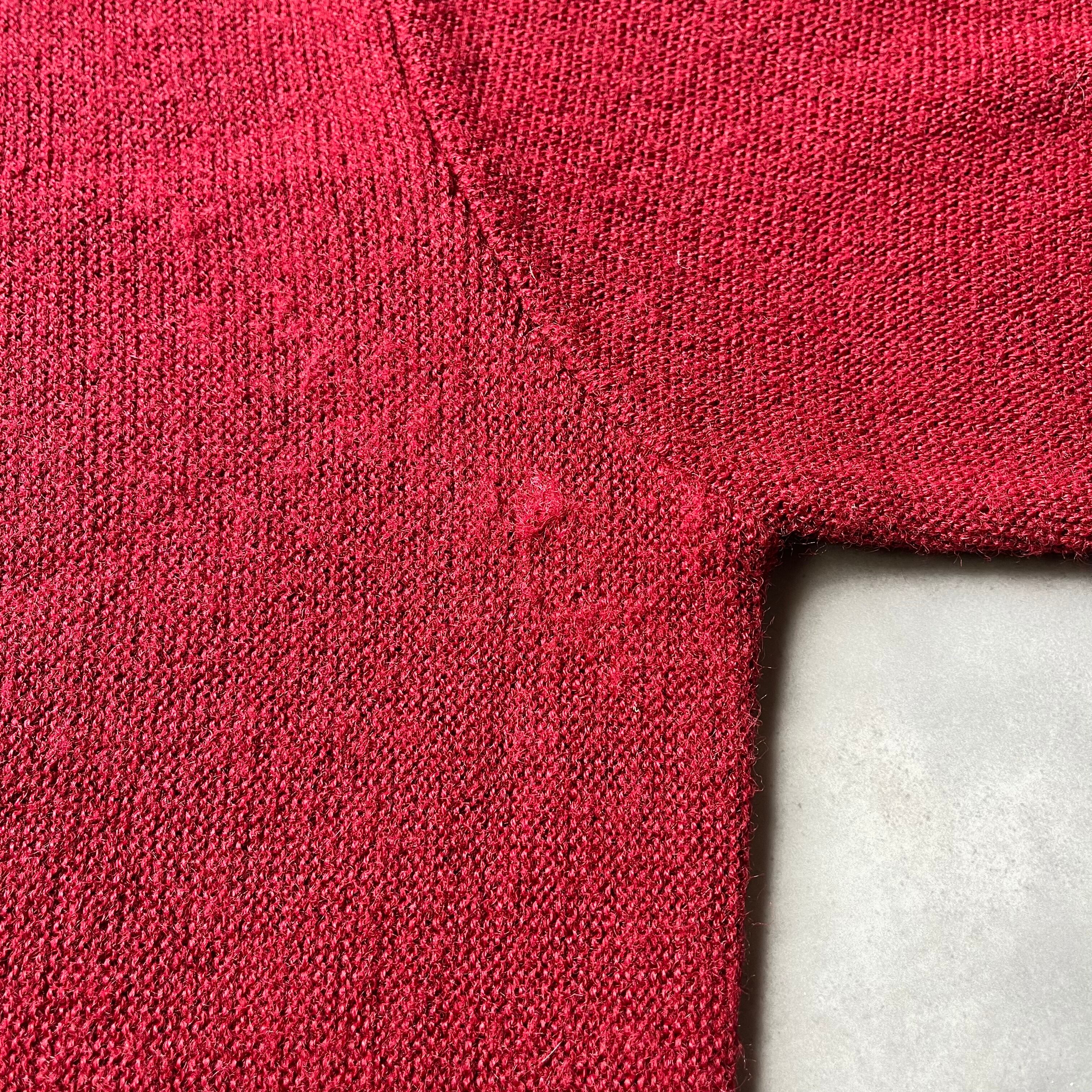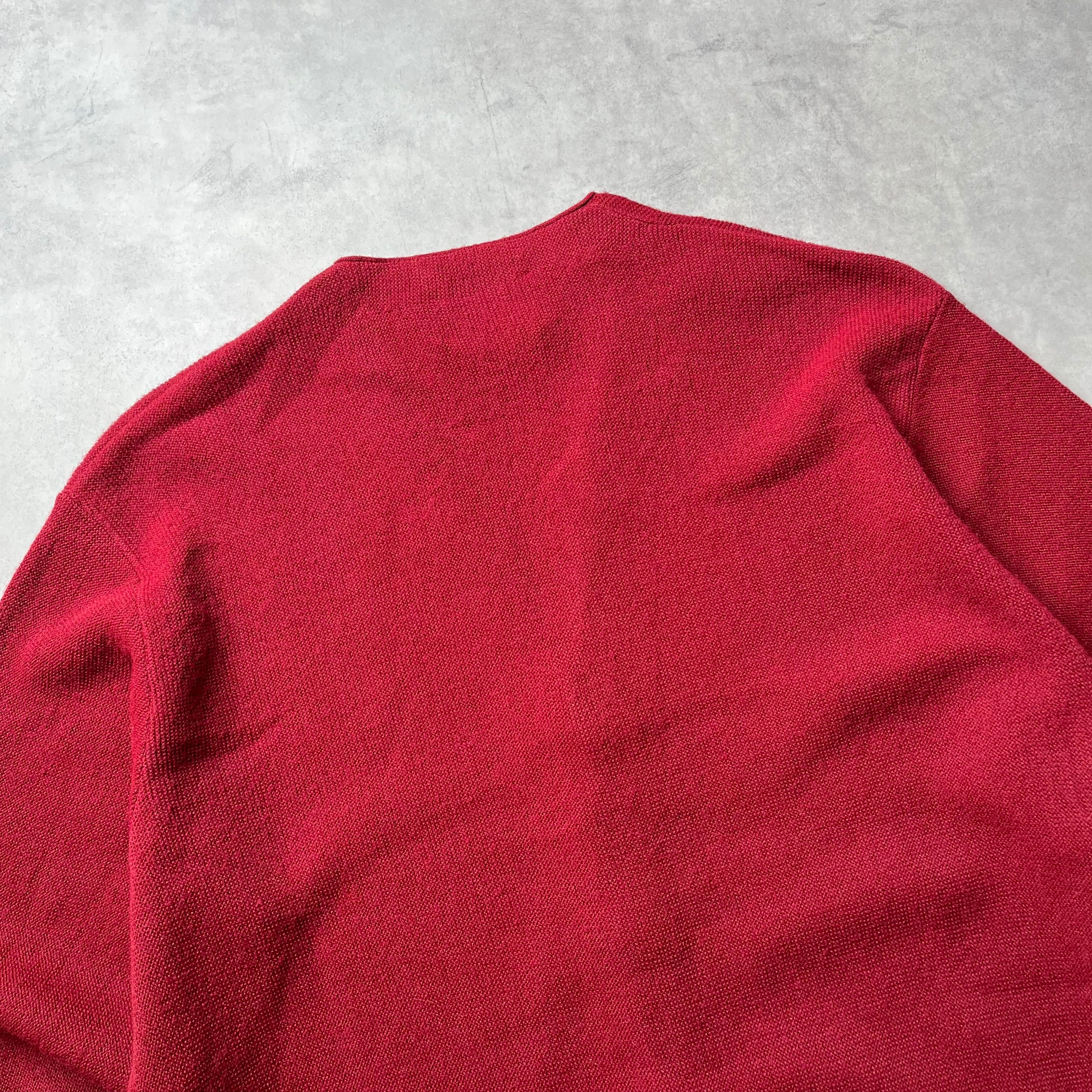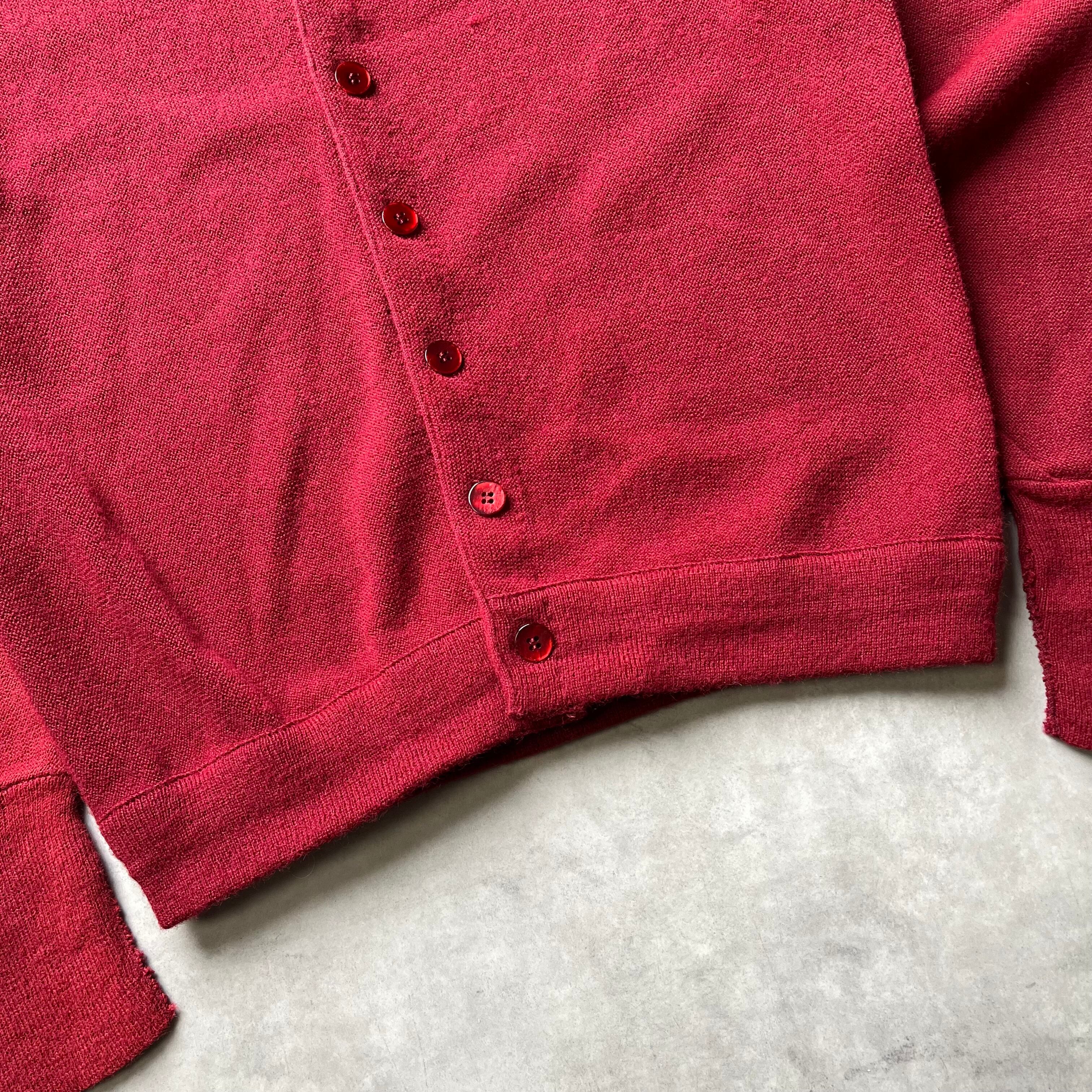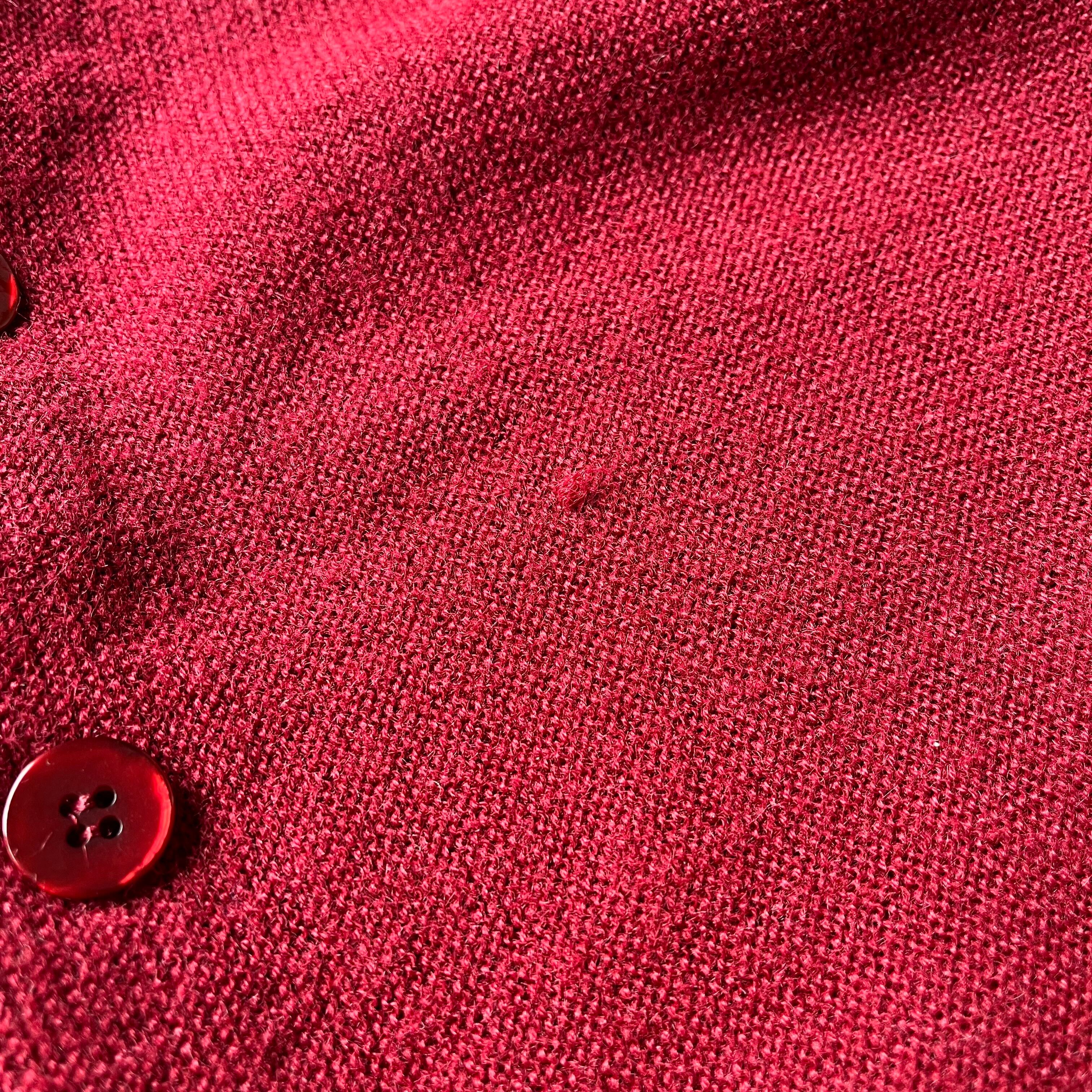 《ヴィンテージならではの深みのあるバーガンディ》 現行品ではなかなか出せない、この年代特有の深く落ち着いたバーガンディが魅力。Orlon素材特有の発色の良さと光沢感が相まって、シンプルながらも圧倒的な存在感を放ちます。ボタンも同系色で統一されており、ミニマルで洗練された印象を与えてくれます。