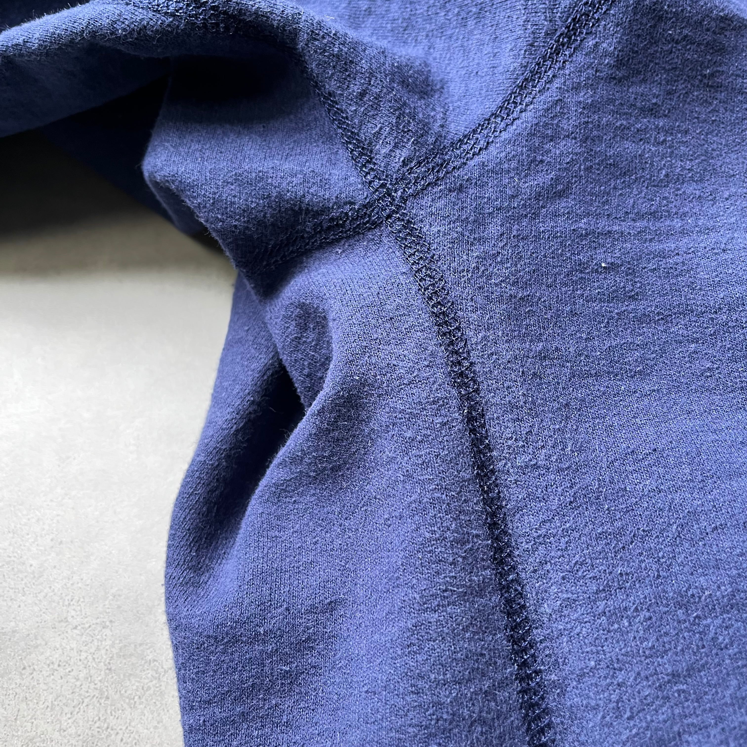 《高配合コットン》 コットン98%という配合により、ポリエステル混特有のテカリが抑えられたマットで深みのあるネイビーは、着込むことでさらに良い風合いに育っていきます。