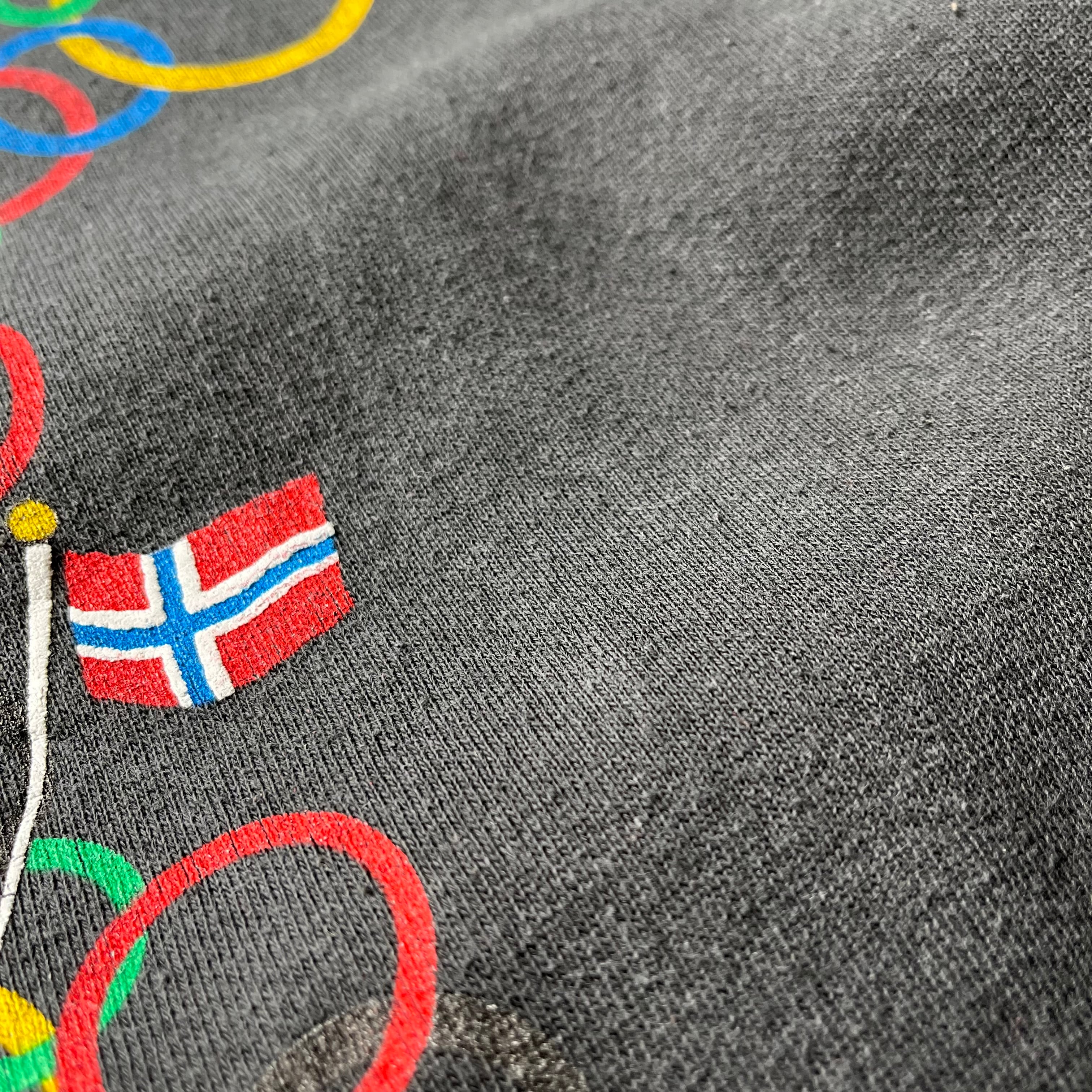 1994年に開催されたリレハンメル冬季五輪のプロモーションスウェットです。五輪の5色の輪をノルウェーの国土に見立てて配置した、非常に独創的でアート性の高いグラフィックが目を引きます。ボディは北欧圏の言葉でコットンを意味する「BOMULL」表記のタグが付いた、当時の現地の空気感をそのまま纏ったような希少な個体です。