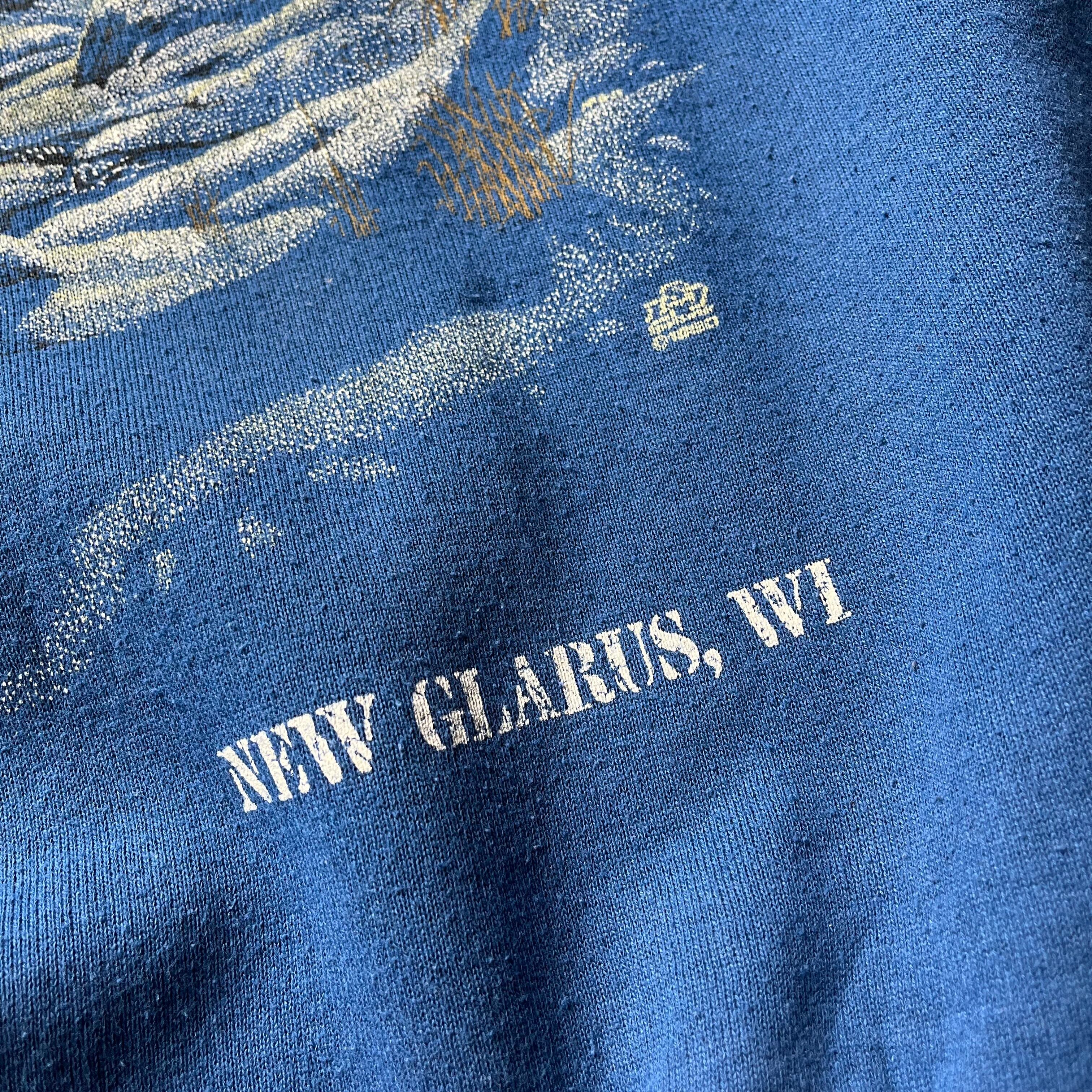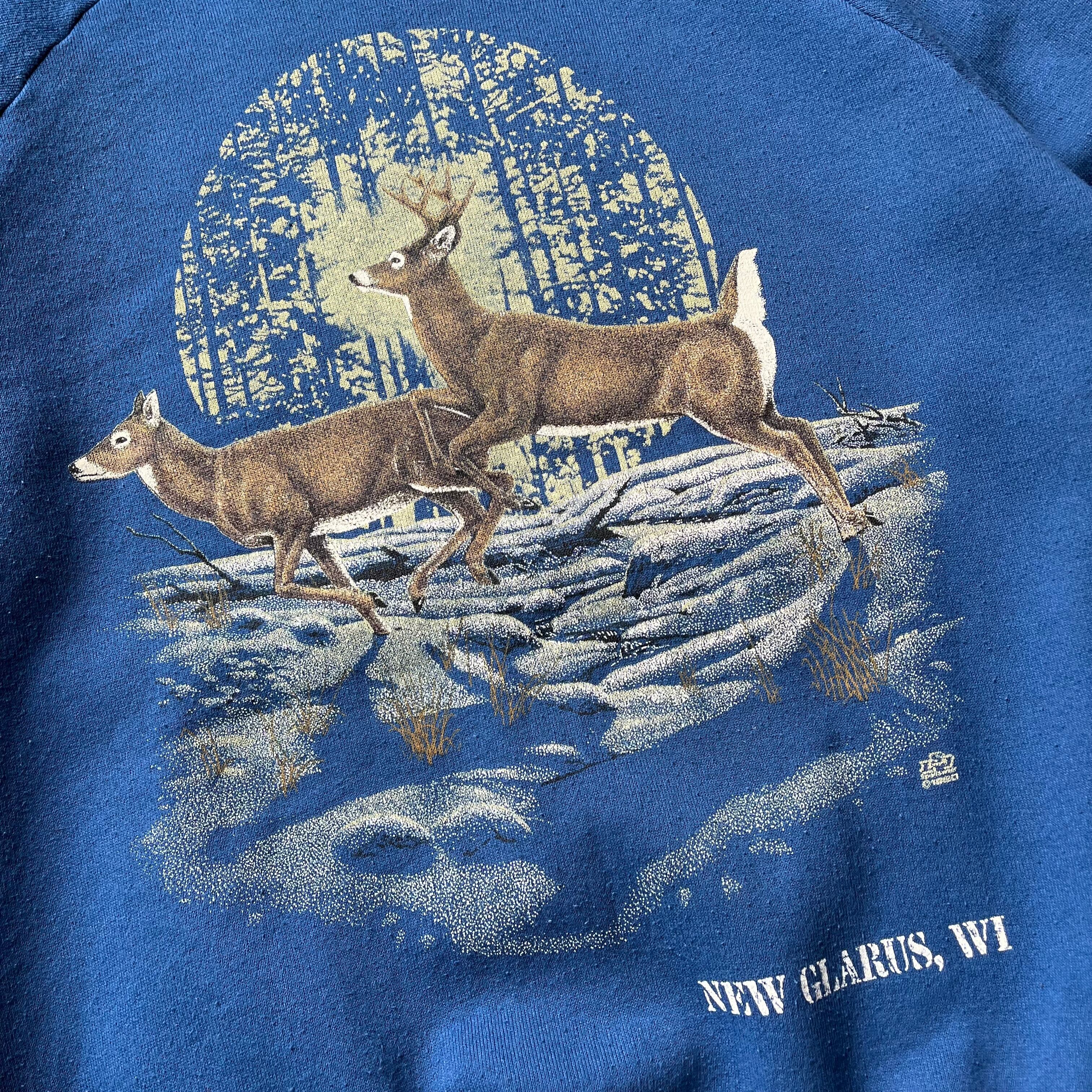 《風景を切り取ったようなネイチャー・グラフィック》 月明かりの下、森を駆ける親子鹿を描いたノスタルジックなアートワーク。単なるアニマルプリントではなく、夜の静寂を感じさせるような「雰囲気」のあるデザインは、まさに一点物ならではの魅力です。