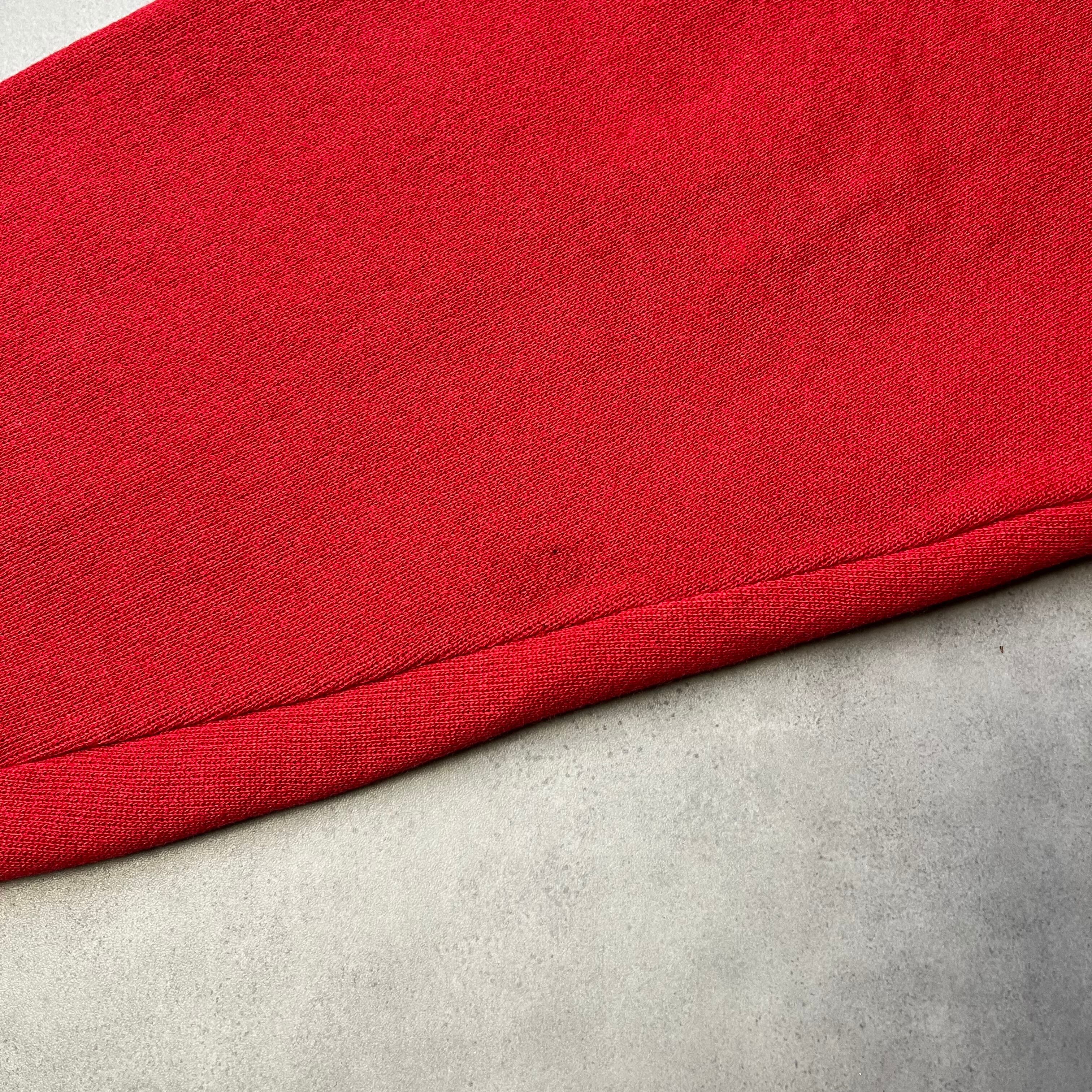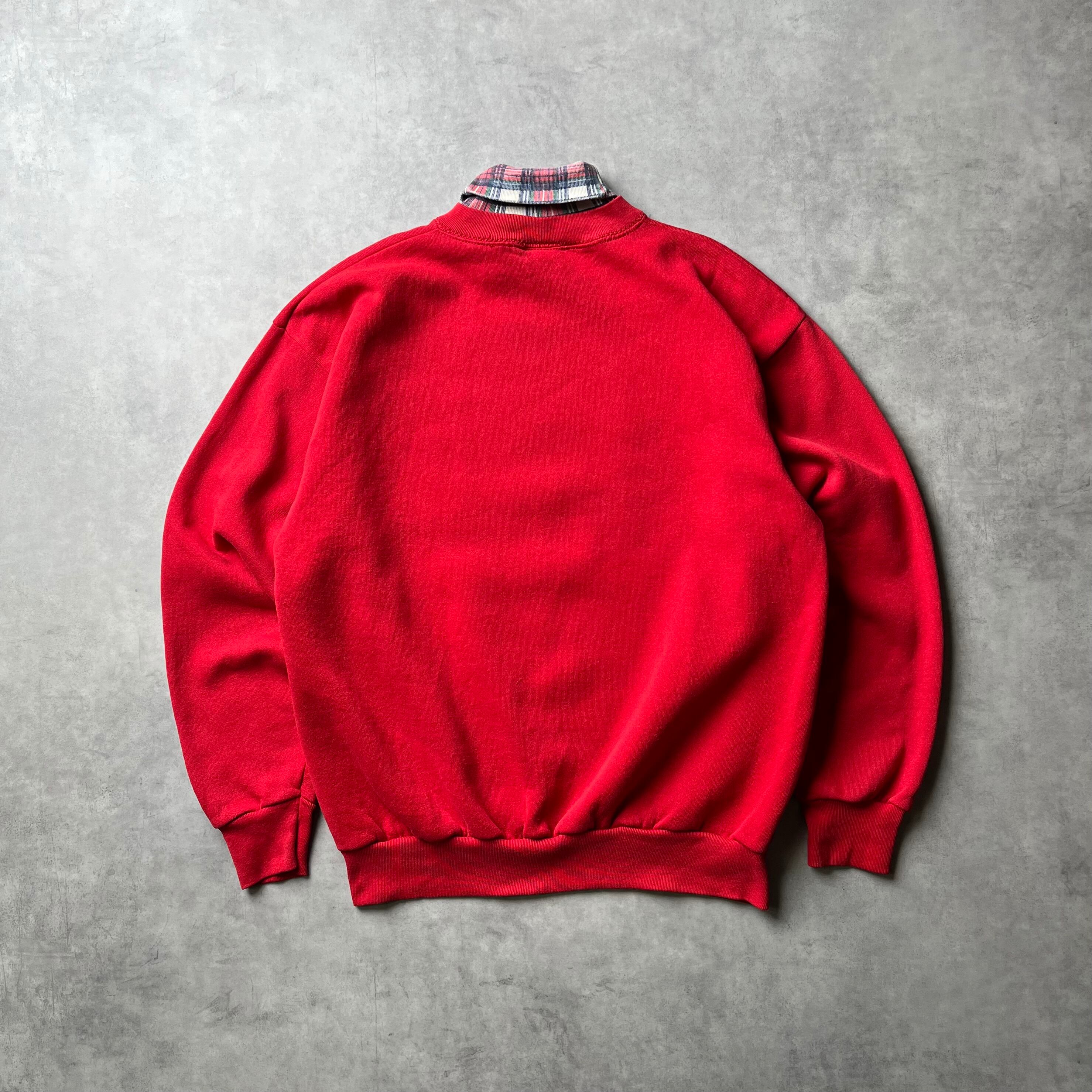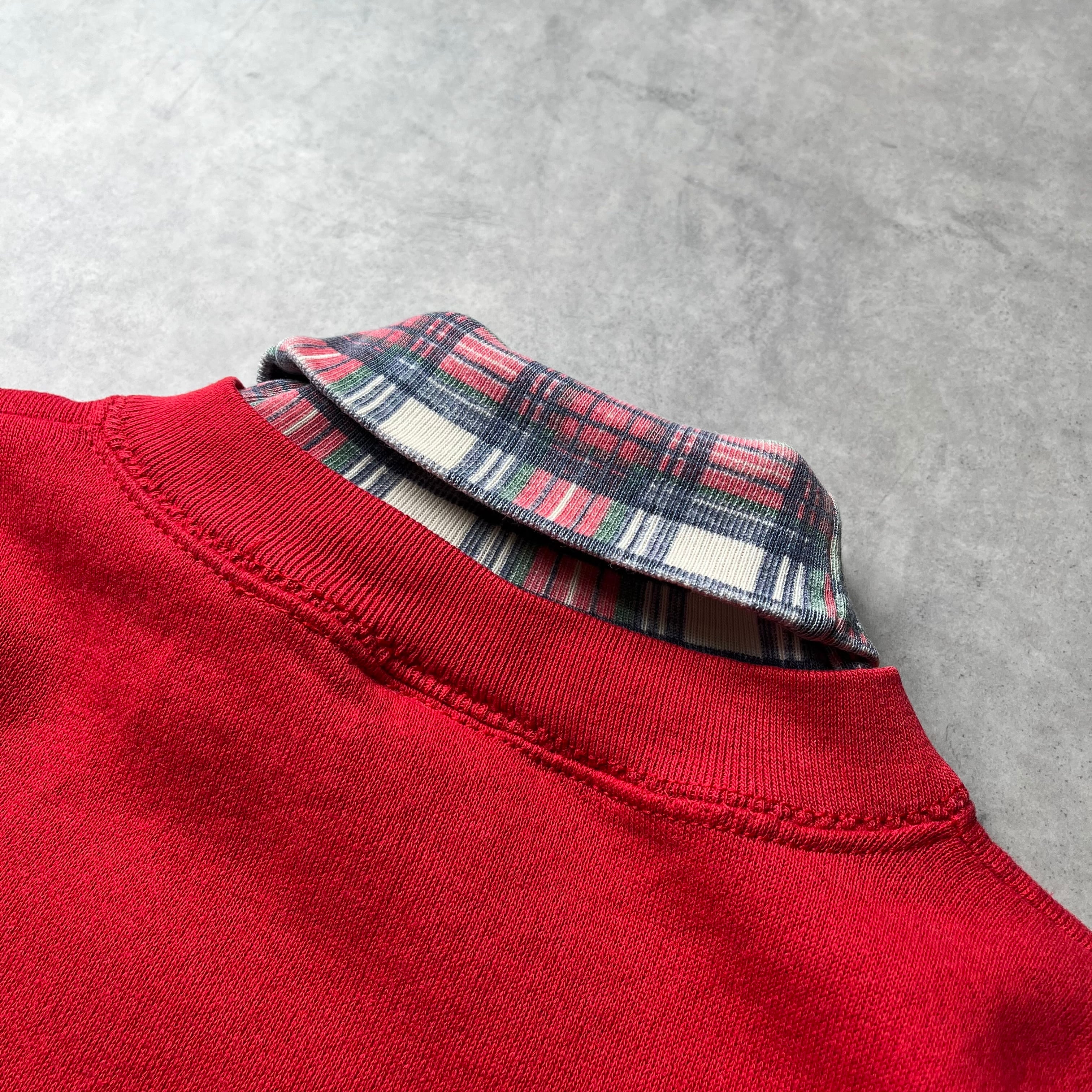 首元にはチェック柄のタートルネックのレイヤード仕様。これ一枚でシャツやカットソーを重ね着しているような雰囲気に。鮮やかなレッドのボディに、チェックのリボンを巻いた3匹のダルメシアンが並ぶ、愛らしいデザイン。