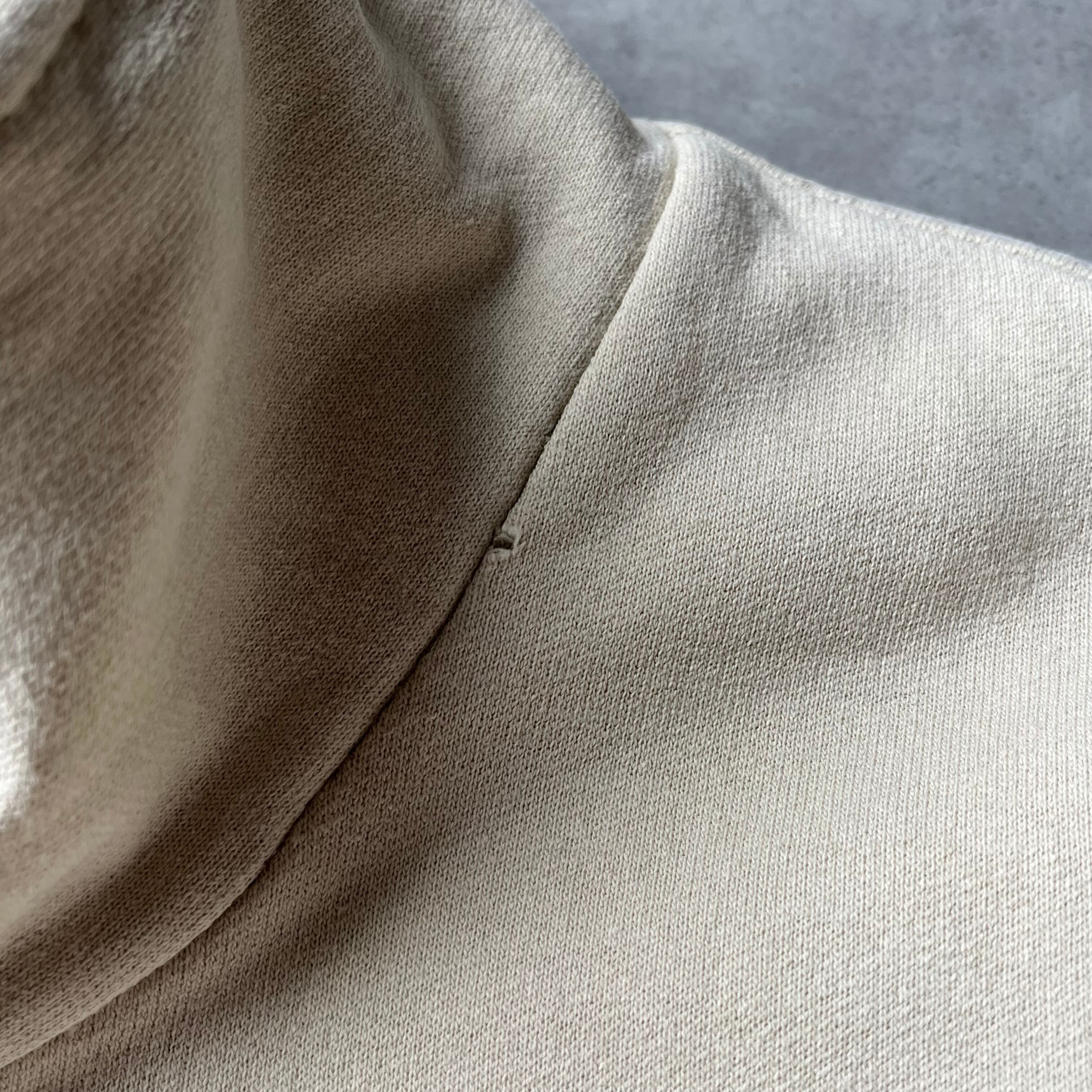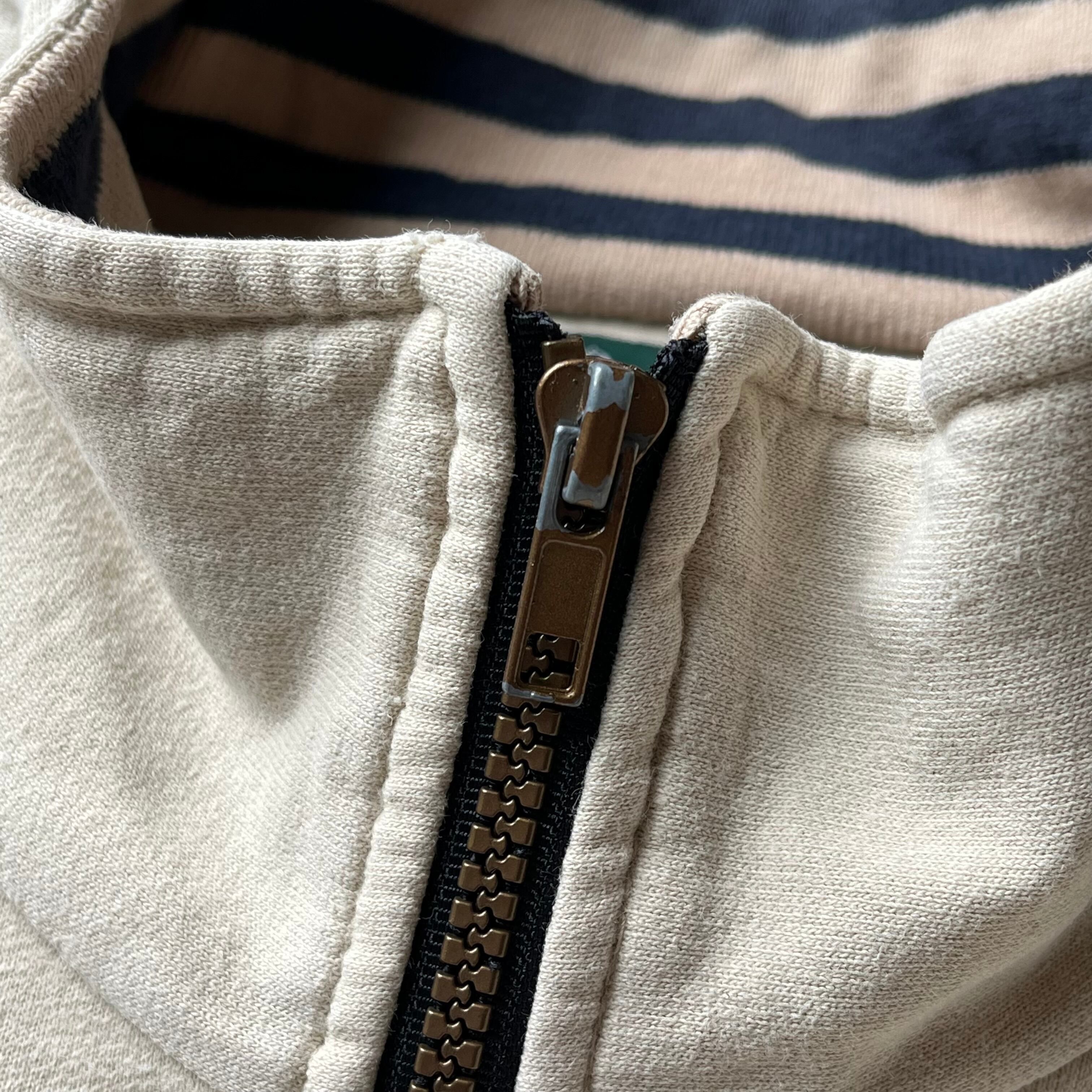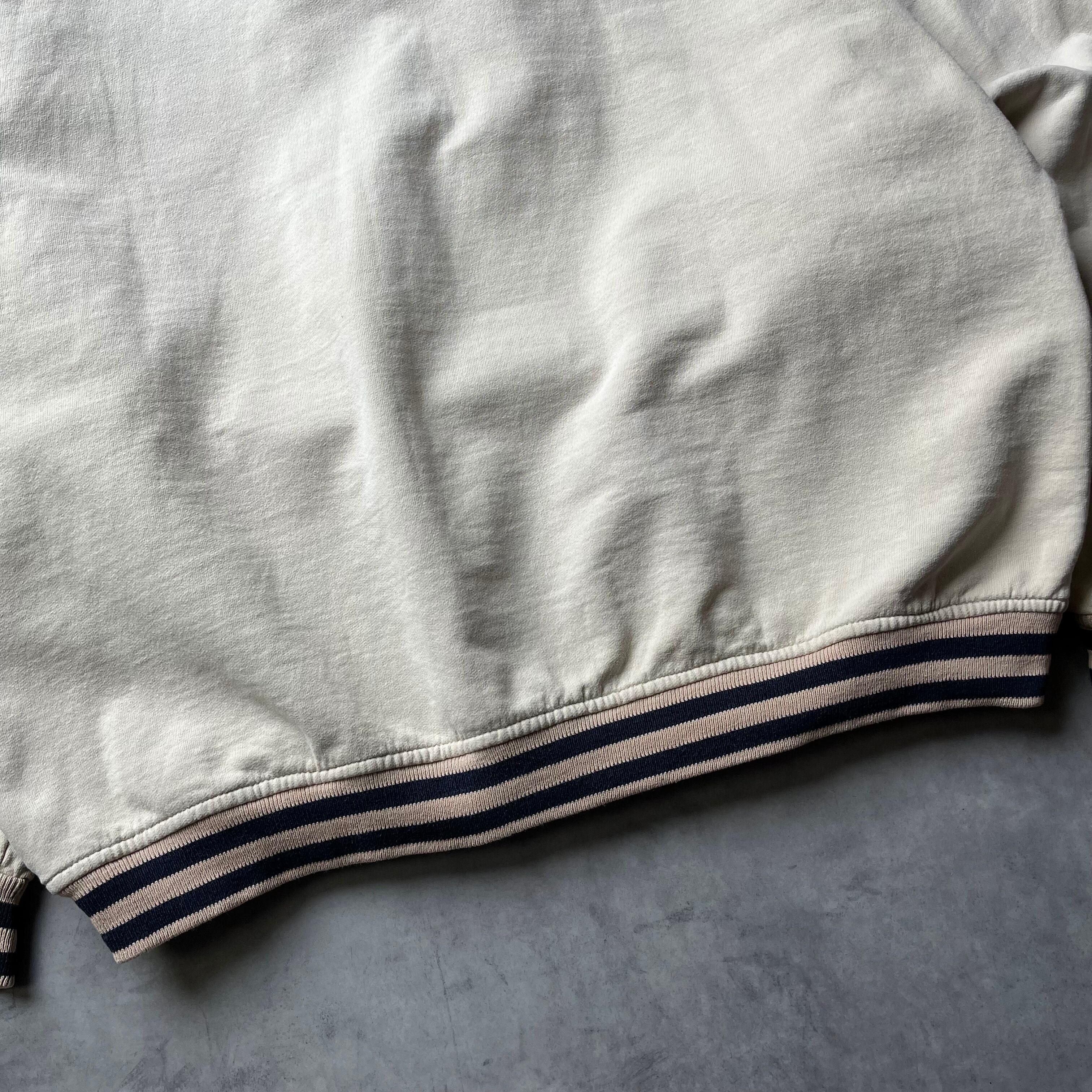 温かみのあるアイボリーカラーのボディに、襟・袖・裾のネイビー×ベージュのラインリブが全体を引き締めるグッドデザインです。スウェット特有の重さがなく、軽やかに着られ春先や秋口に一枚で着るのにちょうどいい厚みです。