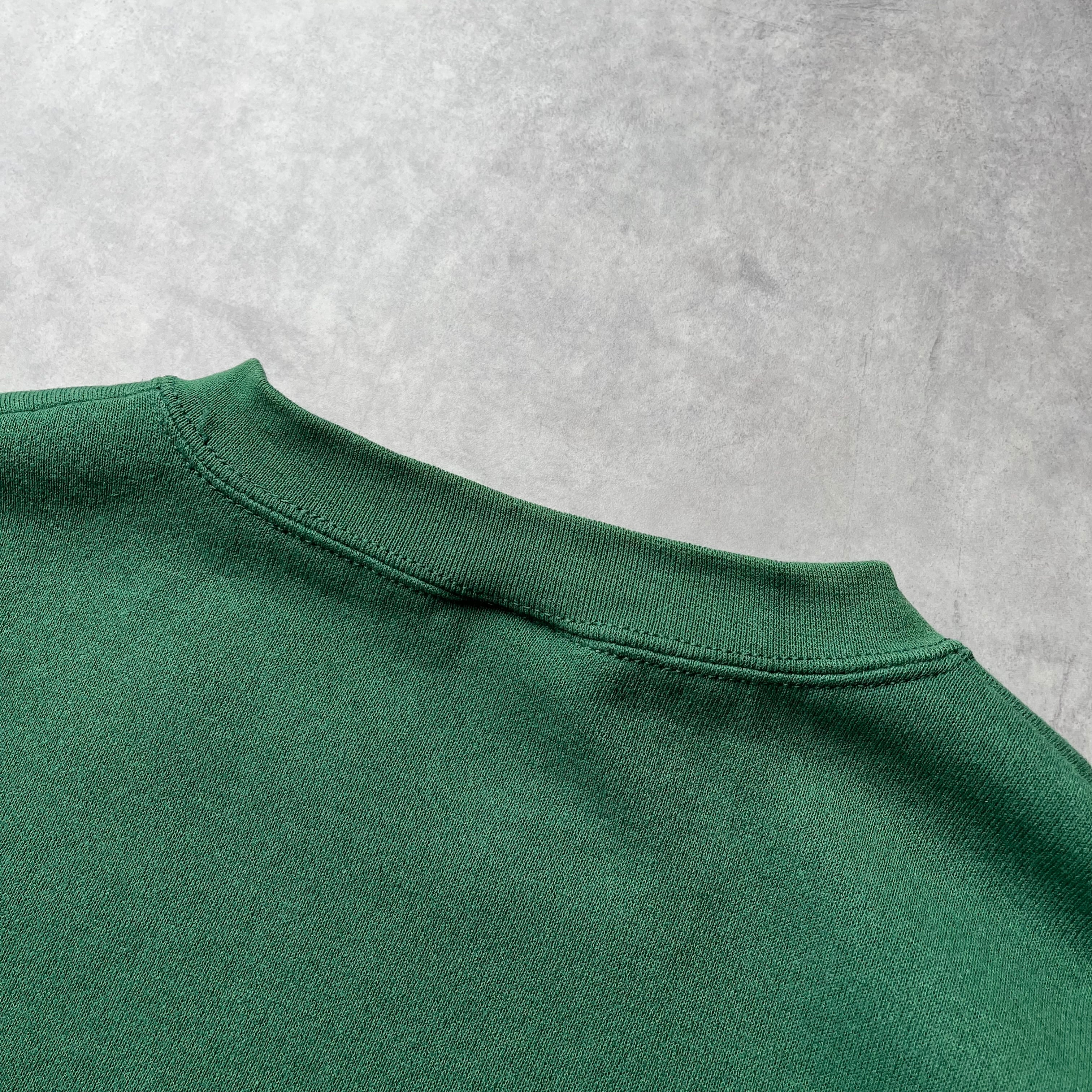 深みのあるフォレストグリーンに、アイコニックな地球儀ロゴの刺繍が映える一着。タフな生地感と、アメリカの日常を感じさせる「企業モノ」ならではのこなれ感が魅力です。