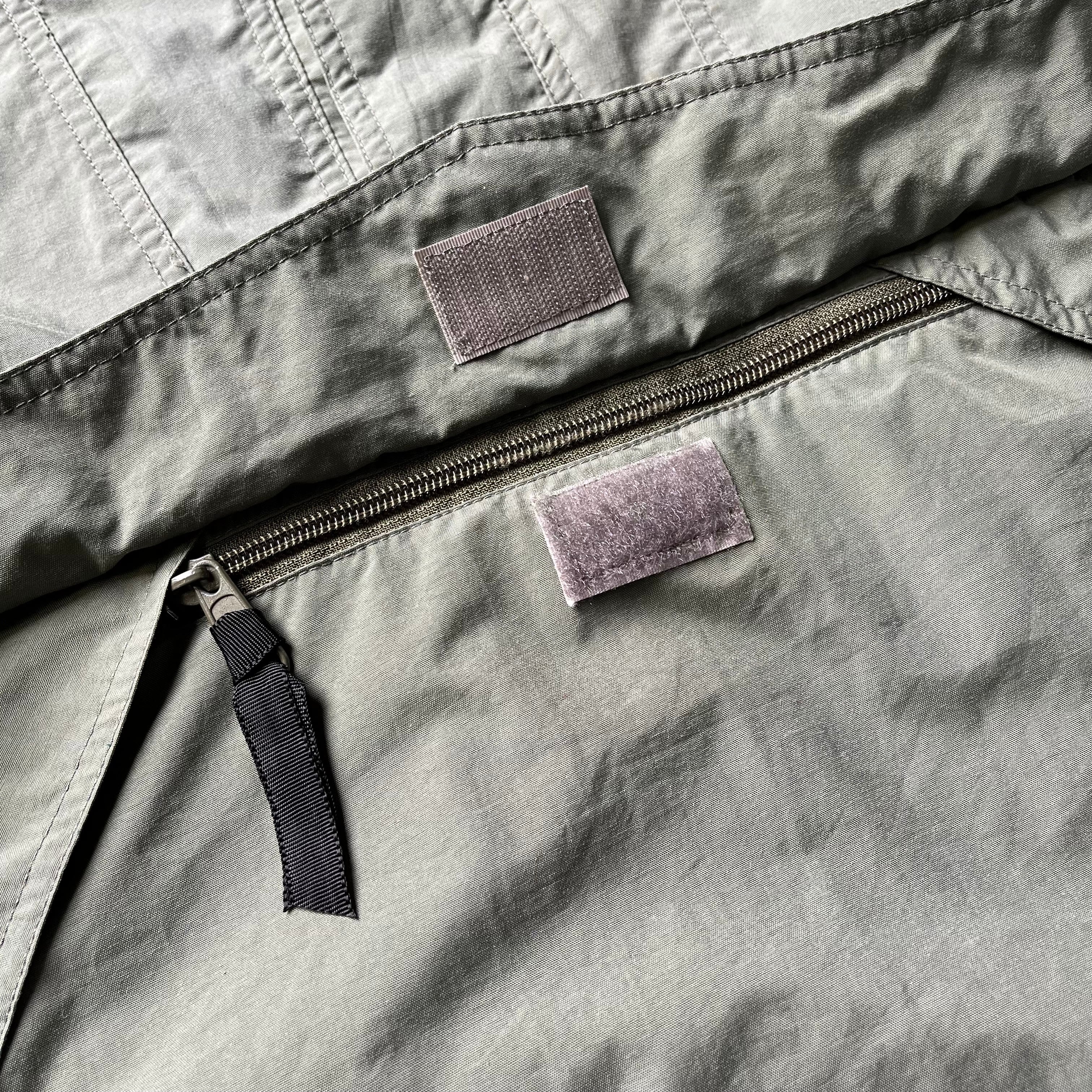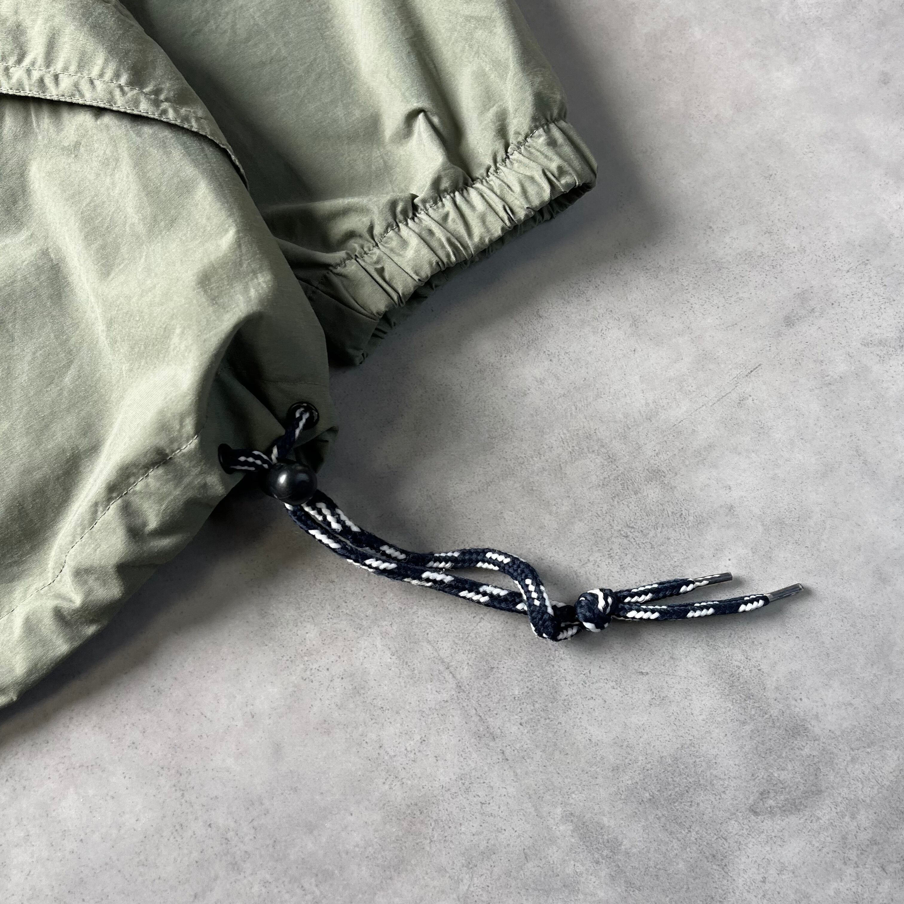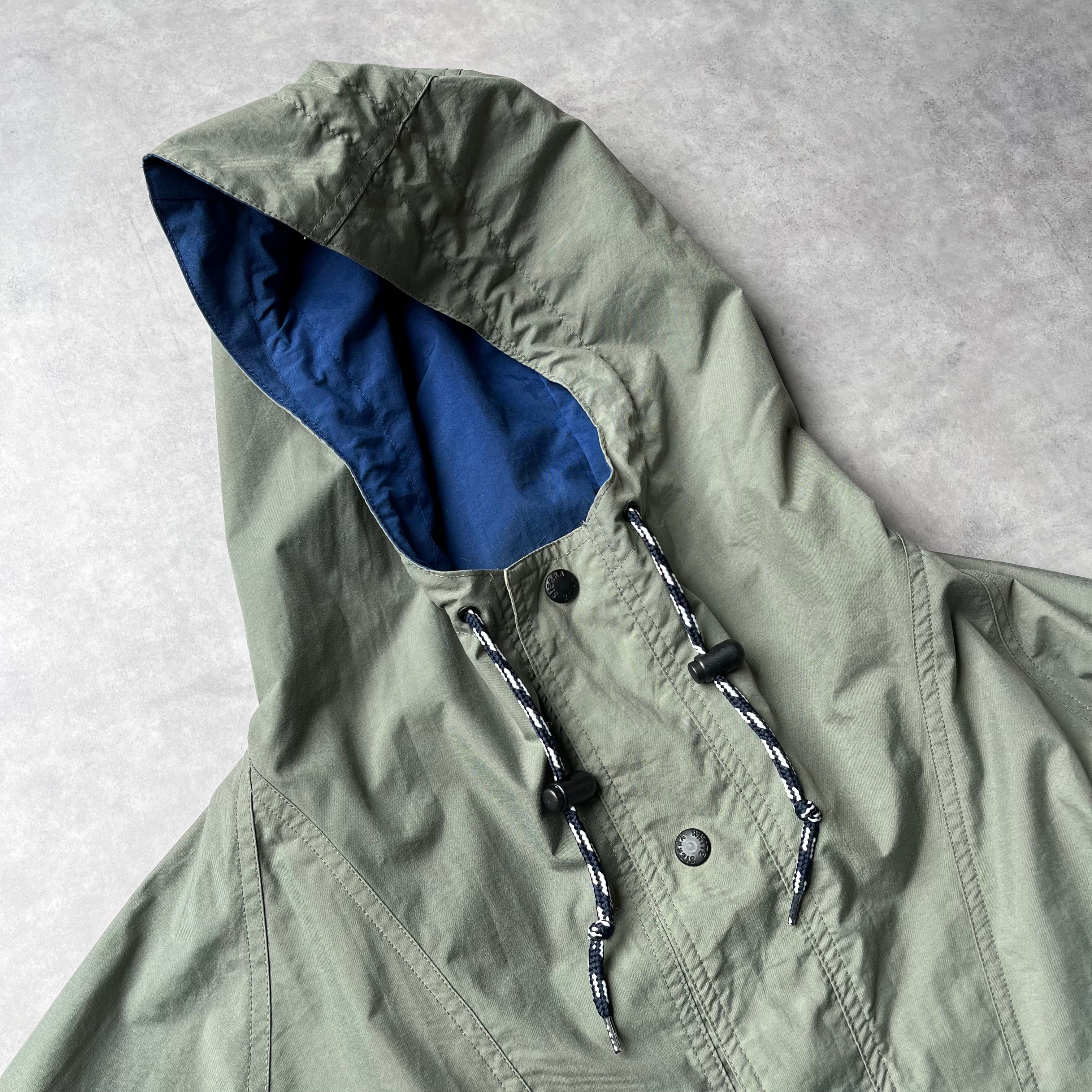 落ち着いたセージグリーンのボディに対し、フードから覗く鮮やかなブルーの裏地。この90年代特有の色使いが、シンプルになりがちな春・秋のコーディネートに奥行きを与えてくれます。