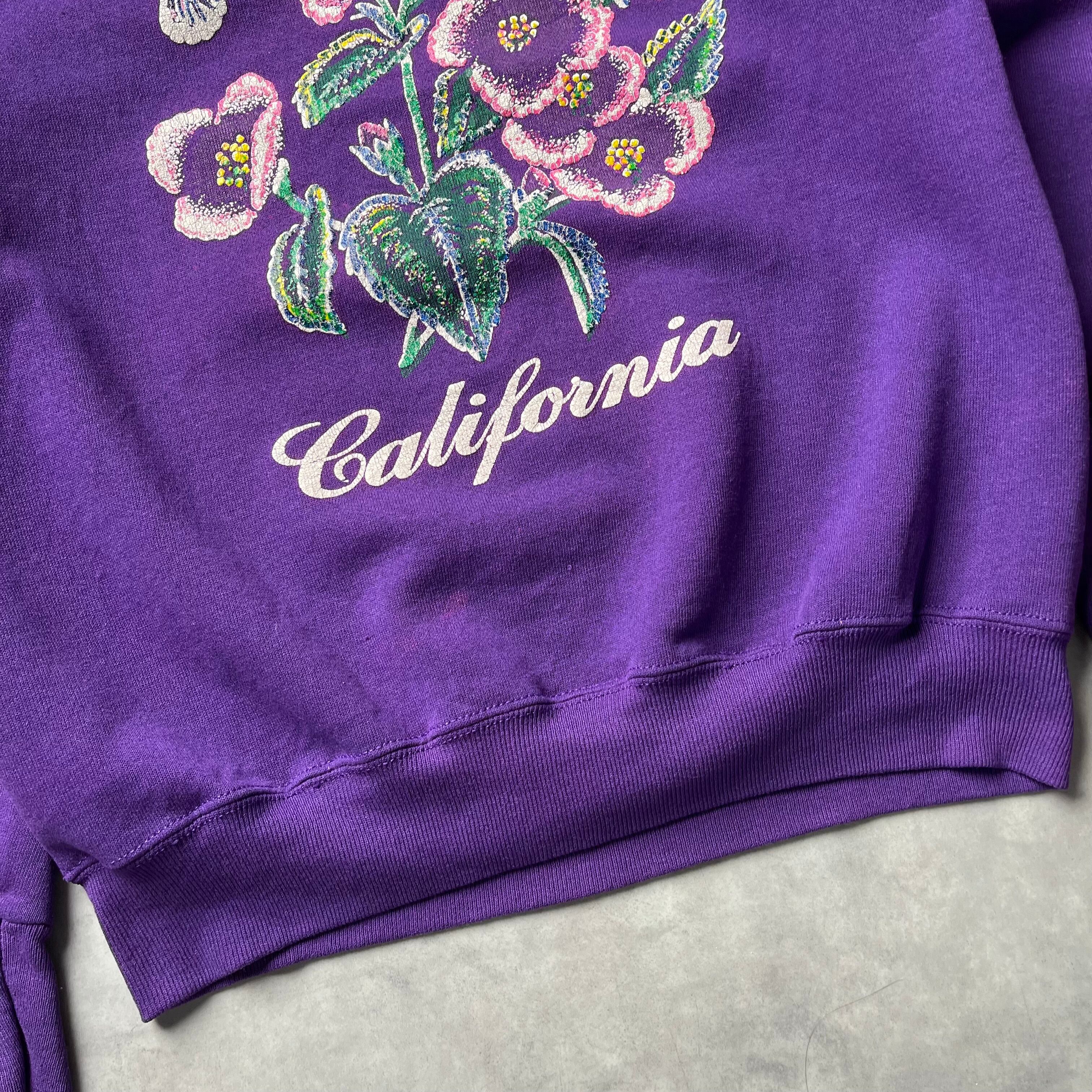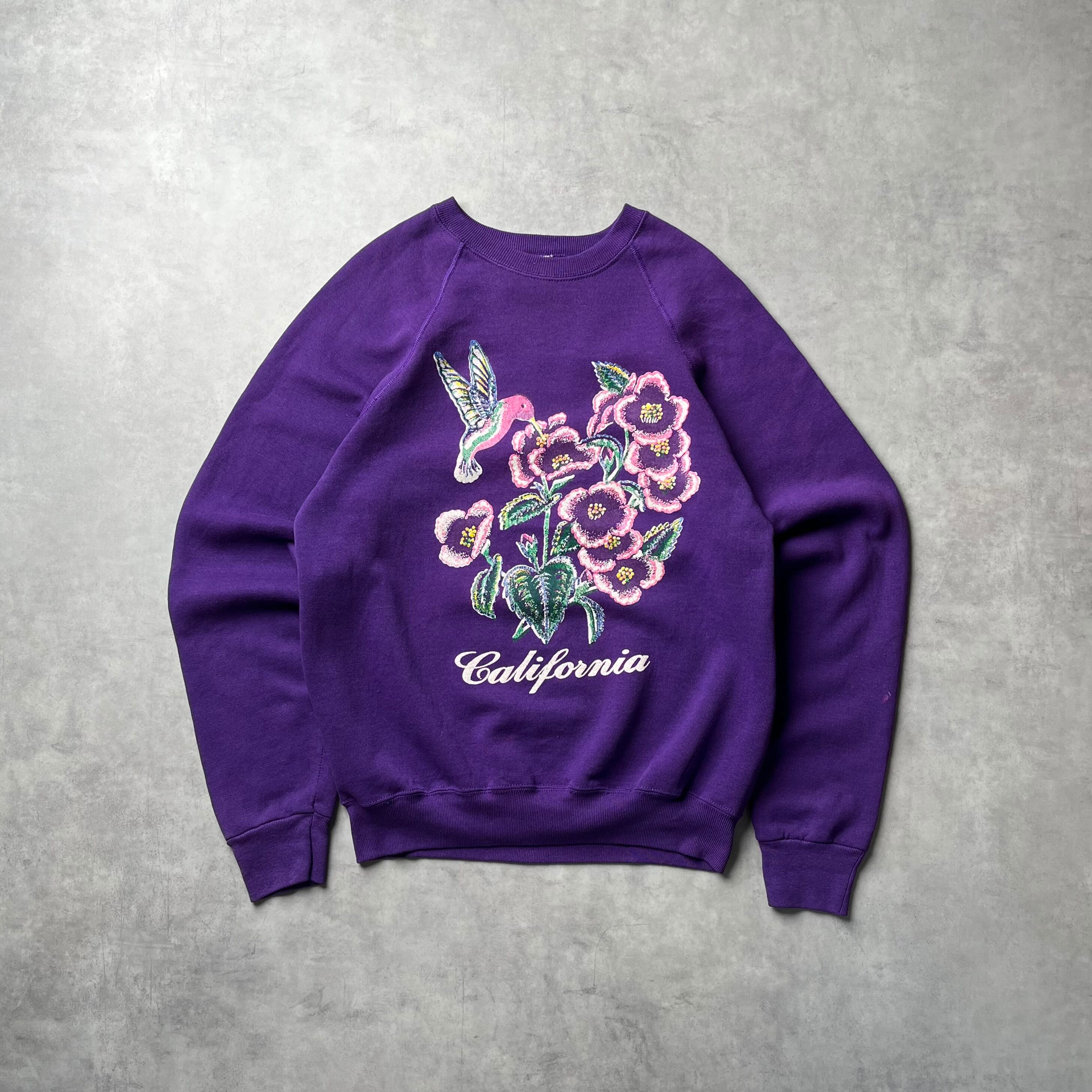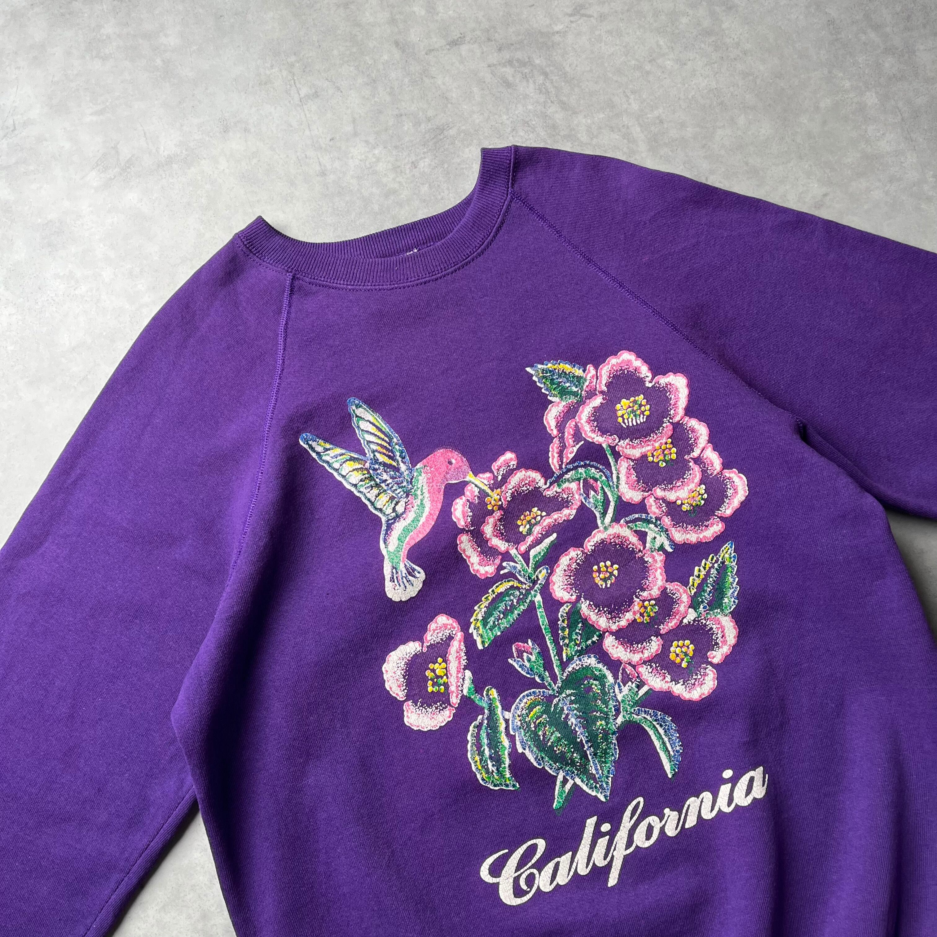 ハチドリと咲き誇る花々が、多色使いの繊細なプリントで表現されています。下部の「California」のレタリングも相まって、当時の西海岸の空気感をそのまま閉じ込めたような一着です。