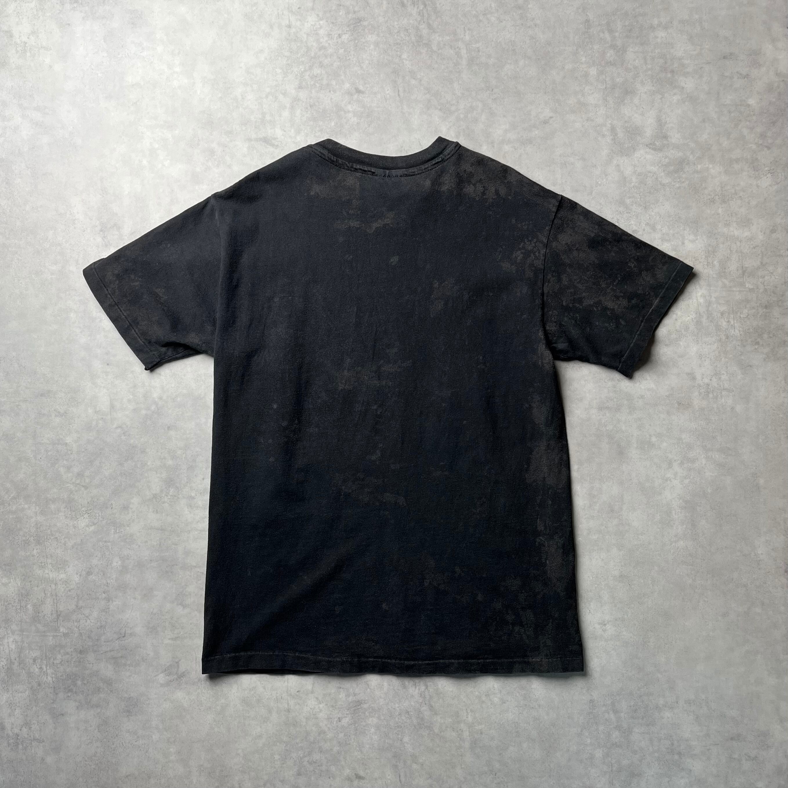 タイダイ染めやスノーウォッシュを施したかのような、美しいムラのある仕上がり。コウモリの残像のダークなグラフィックと、この退廃的なボディの質感が完璧にマッチしています。