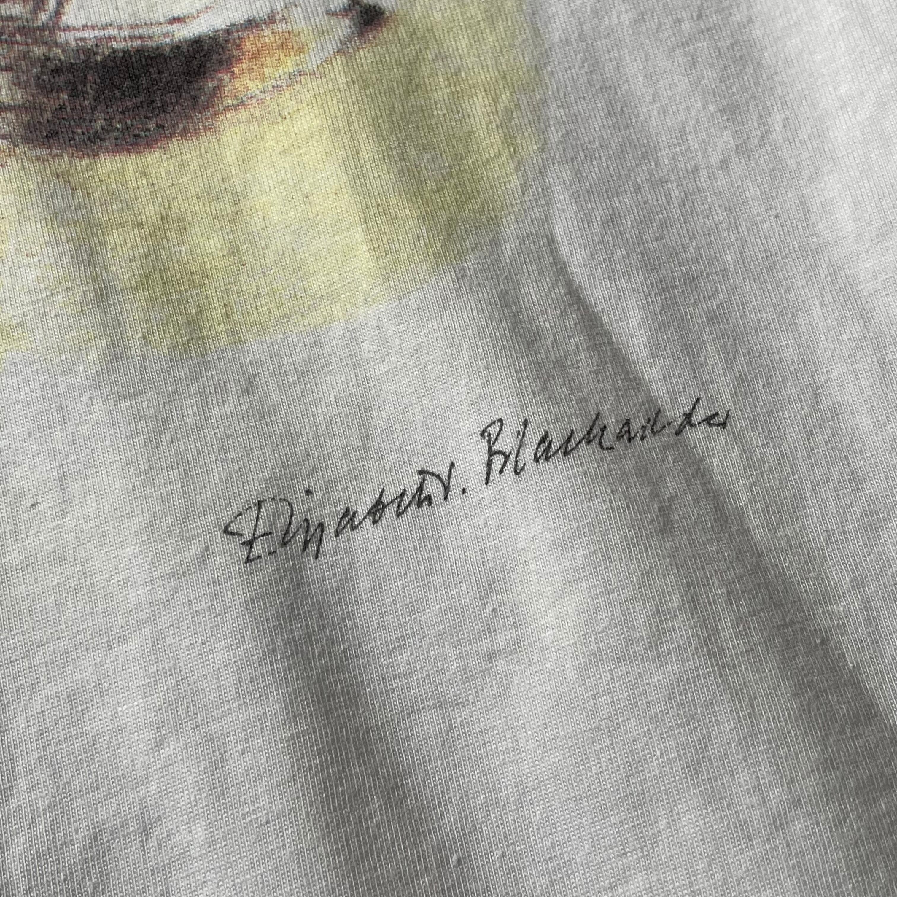 エリザベス・ブラックアダーは、猫や花を愛した画家として知られています。右下に配された彼女のシグネチャーが、このTシャツが単なるファンシーグッズではなく、確かな背景を持つアートピースであることを示しています。