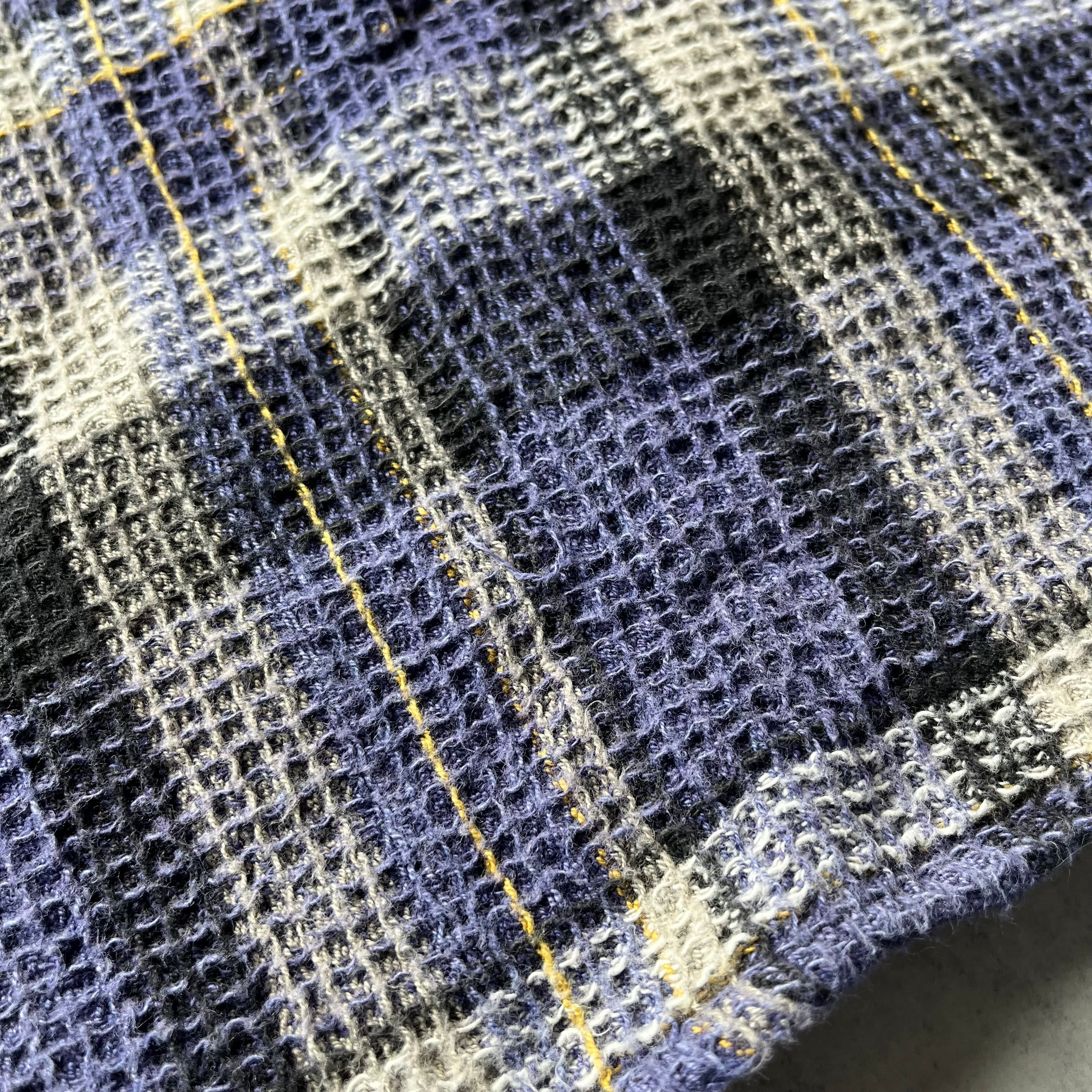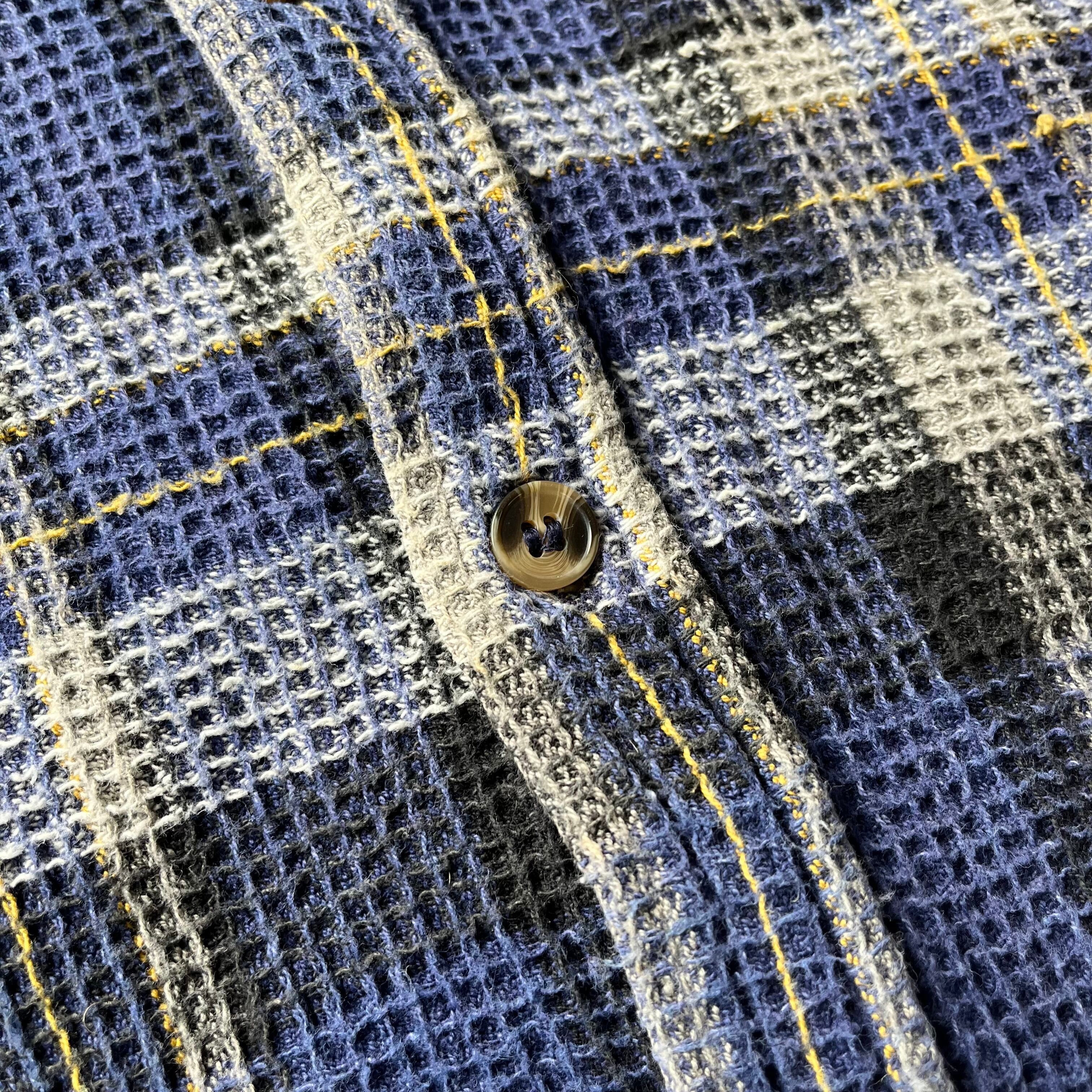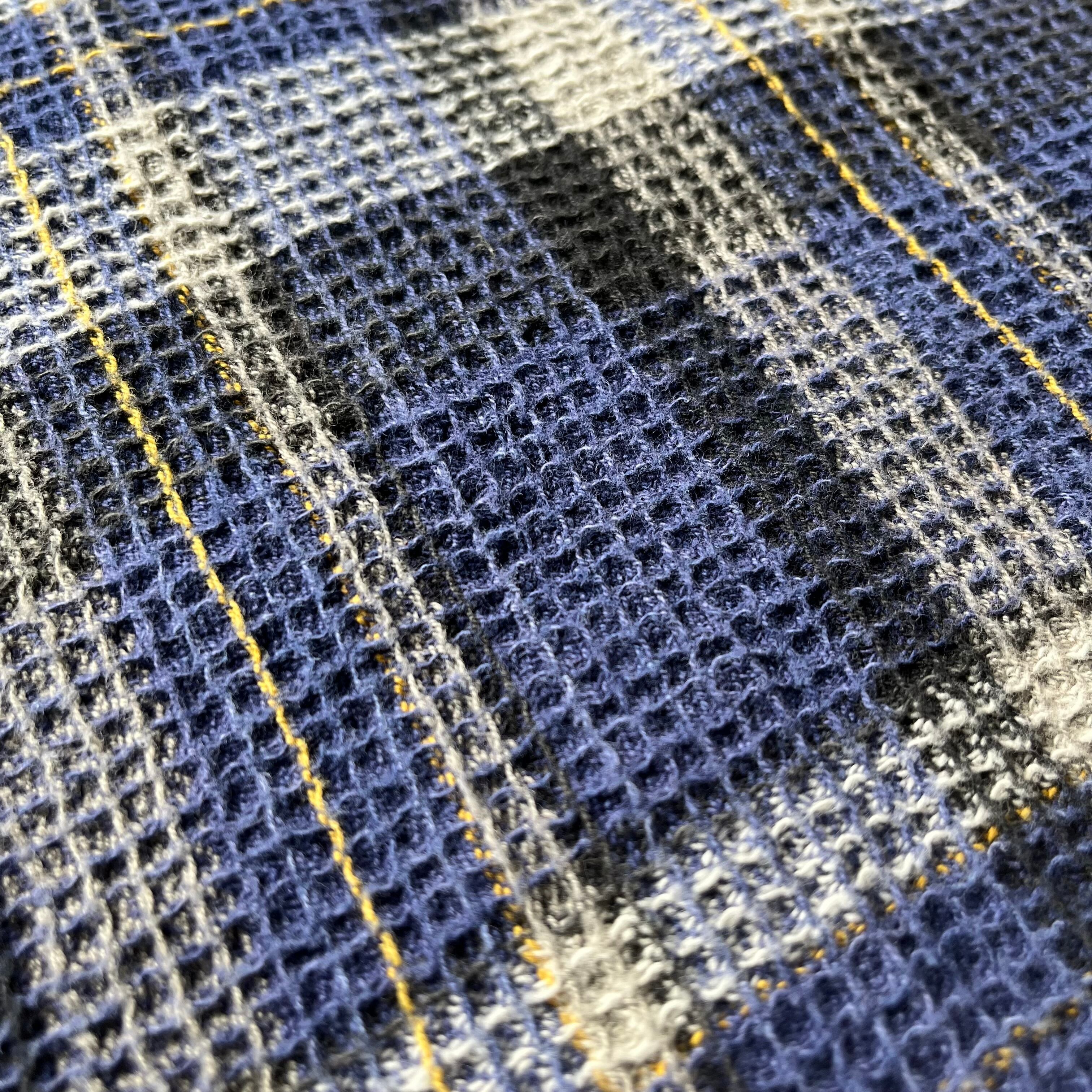 ブルーとネイビーを基調とした落ち着いたチェック柄に、ワッフル地特有の凹凸感が加わることで、独特の奥行きと立体感が生まれています。さらに、アクセントとして効いているイエローの格子ラインが、全体の印象をグッと引き締めています。