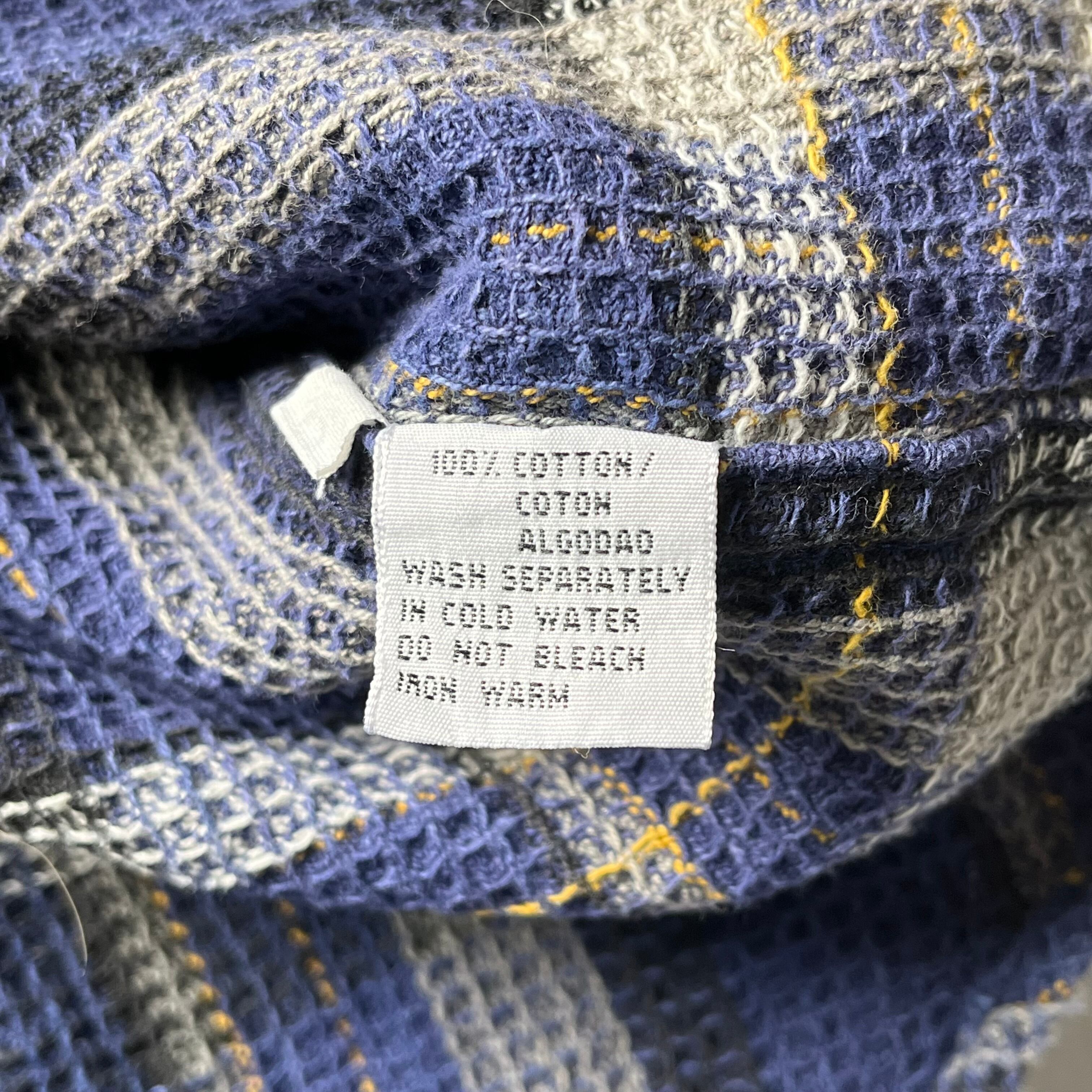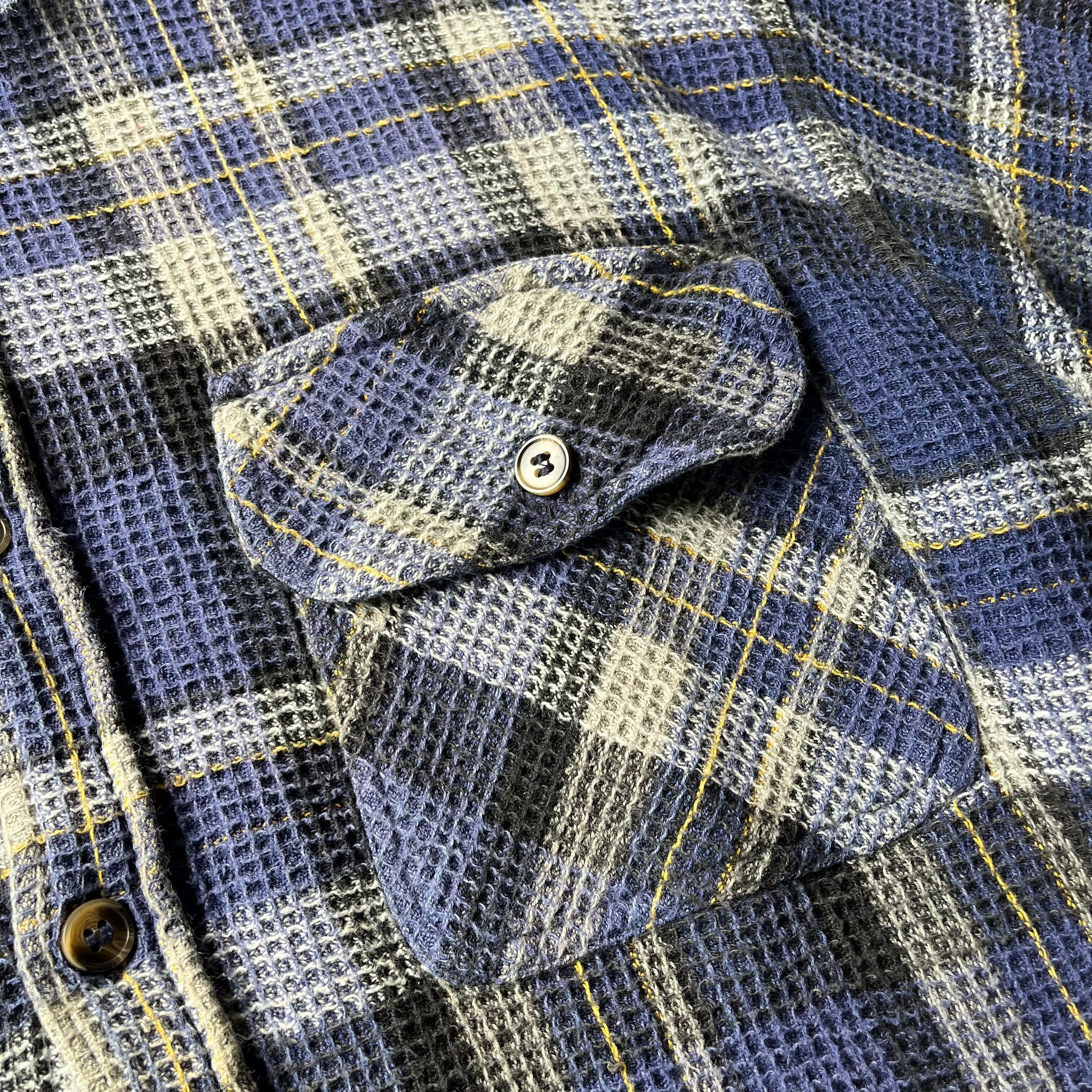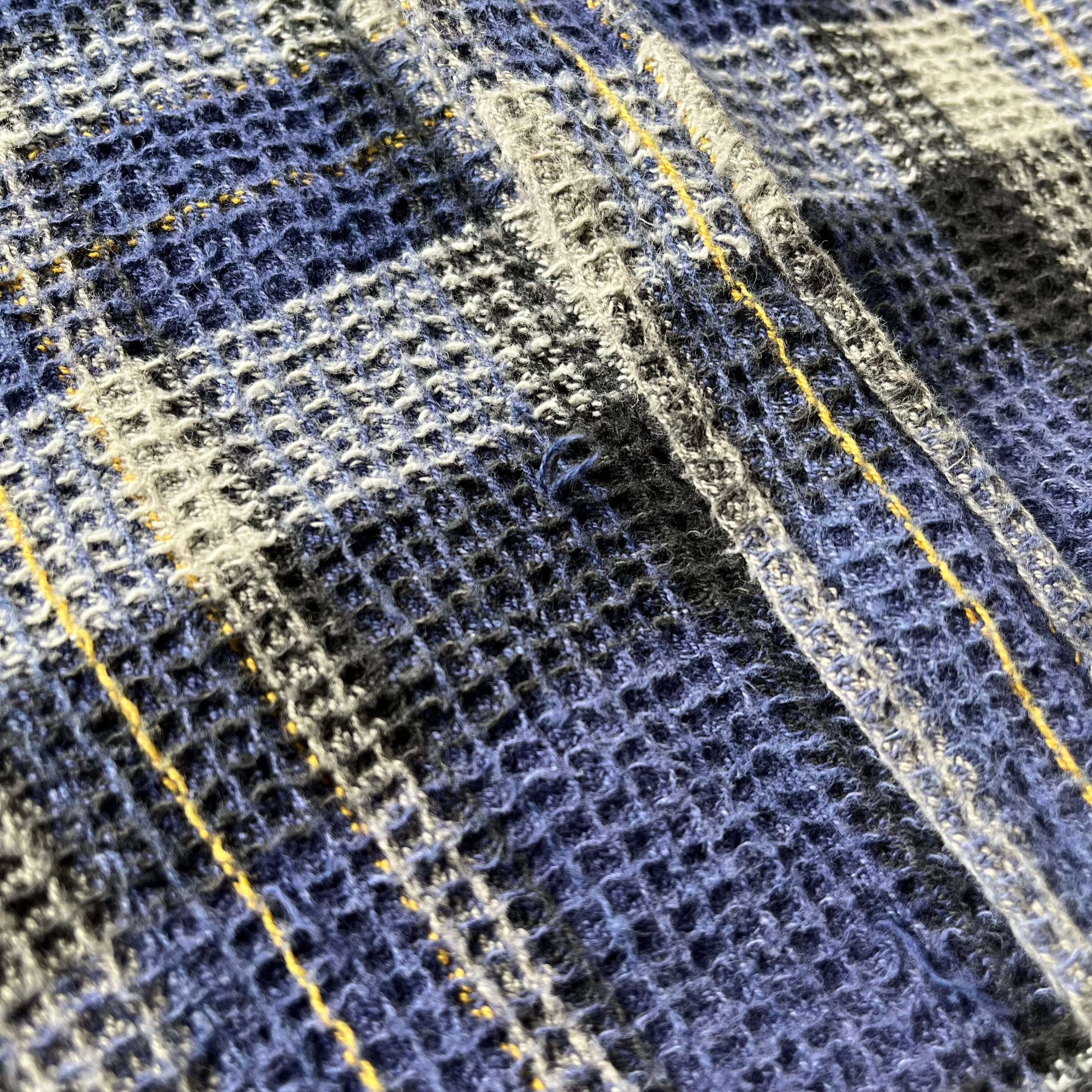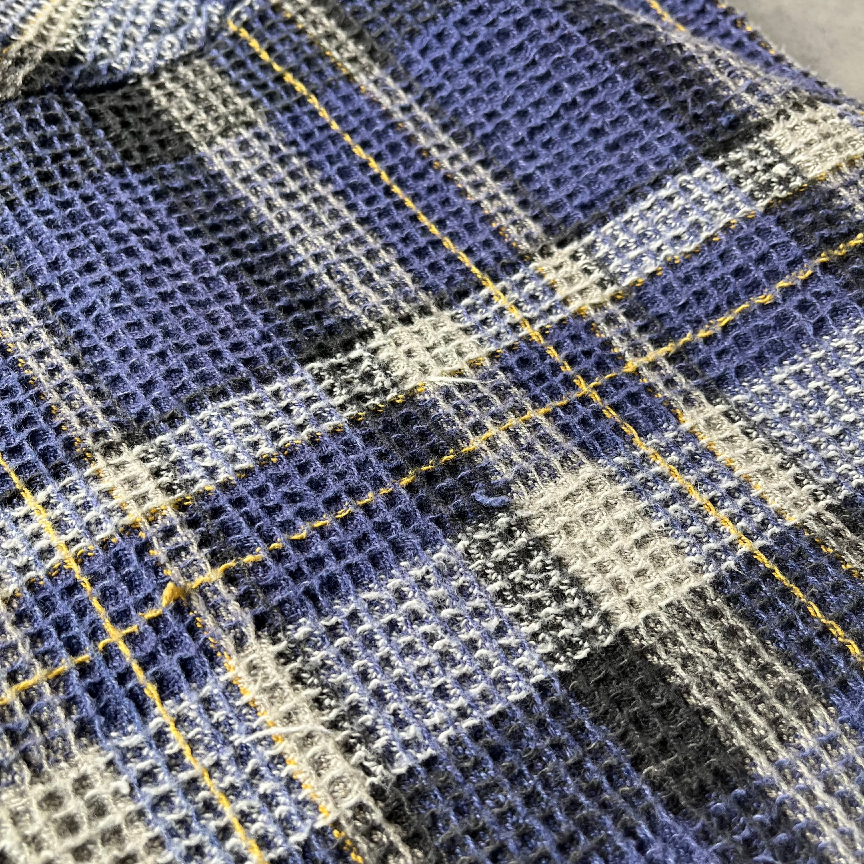 ブルーとネイビーを基調とした落ち着いたチェック柄に、ワッフル地特有の凹凸感が加わることで、独特の奥行きと立体感が生まれています。さらに、アクセントとして効いているイエローの格子ラインが、全体の印象をグッと引き締めています。