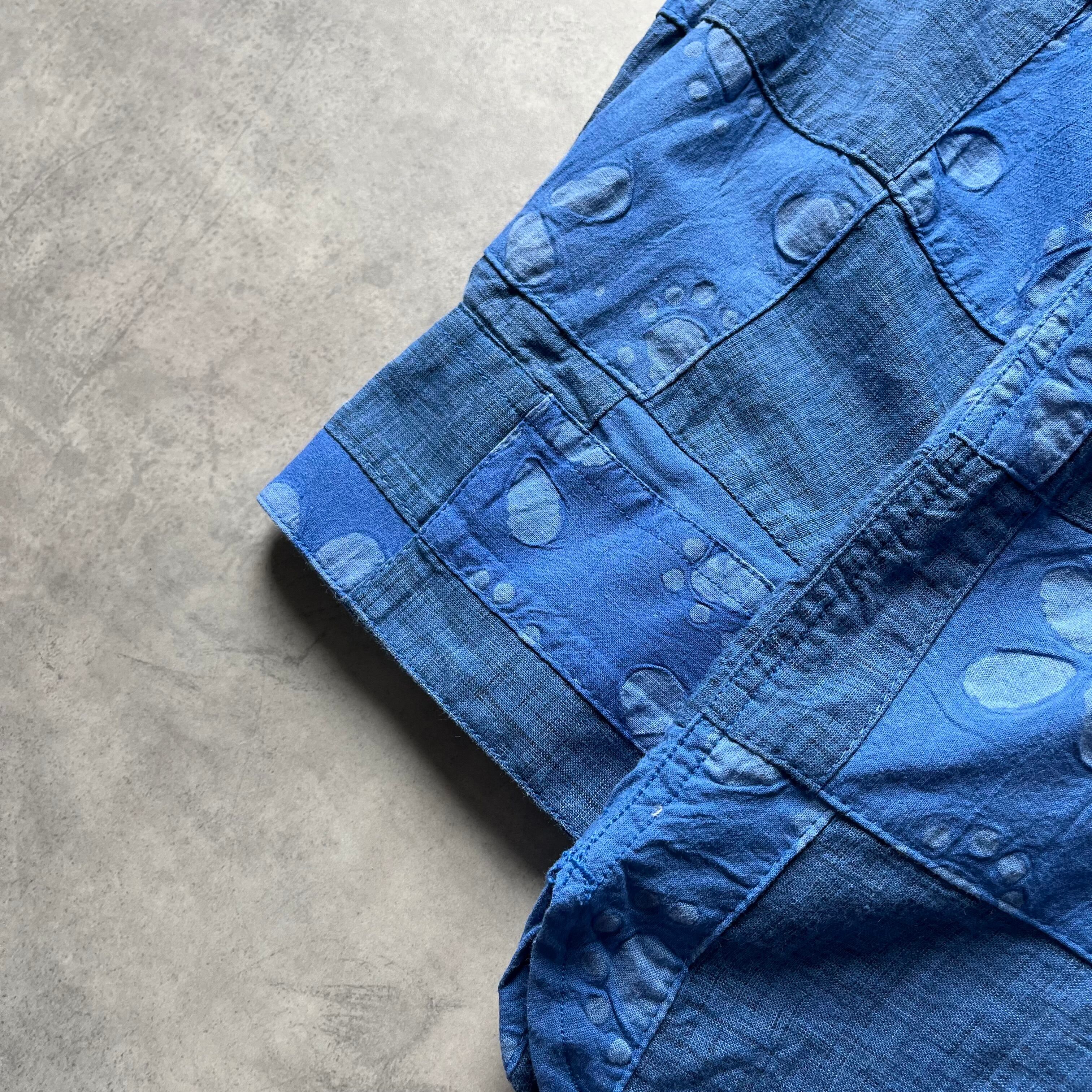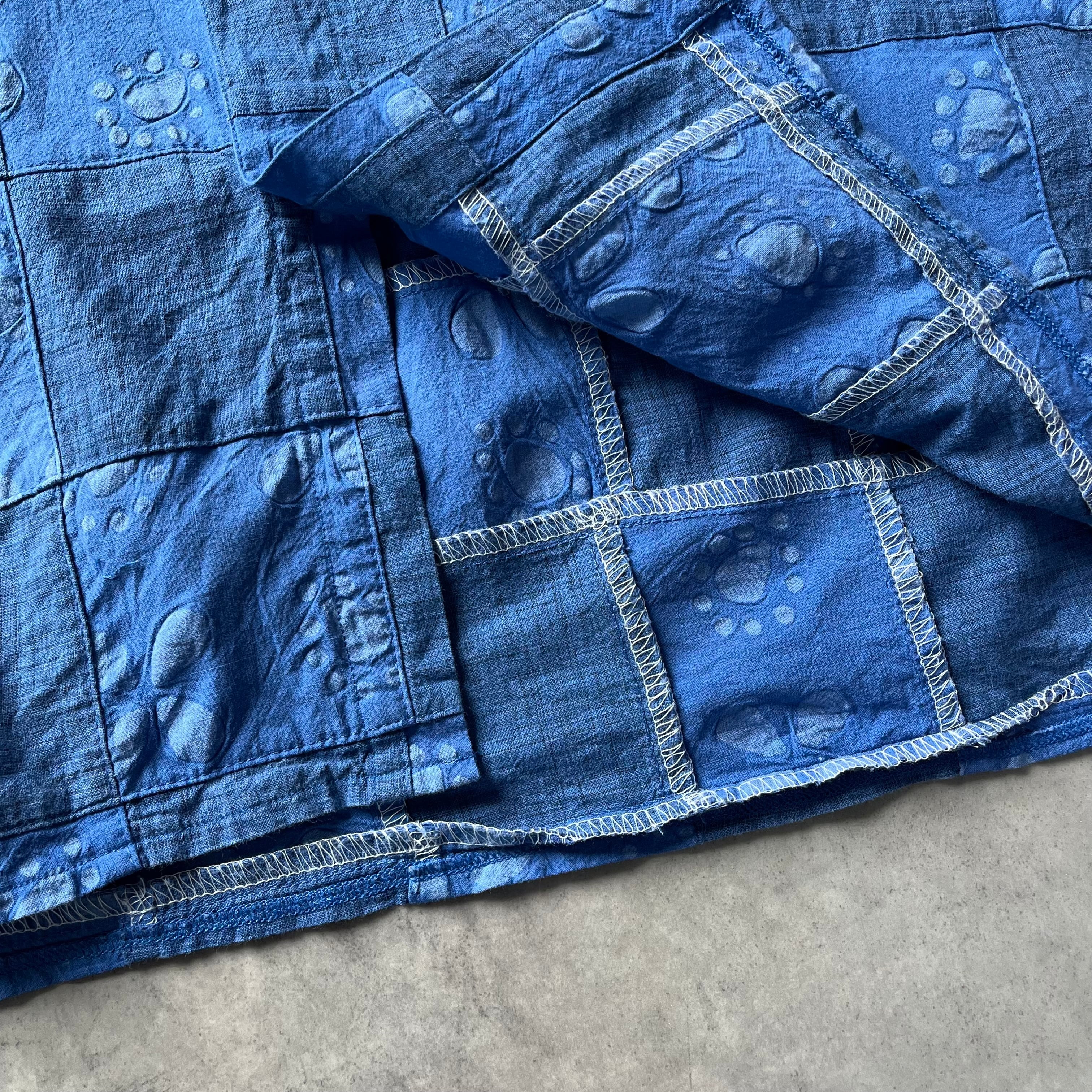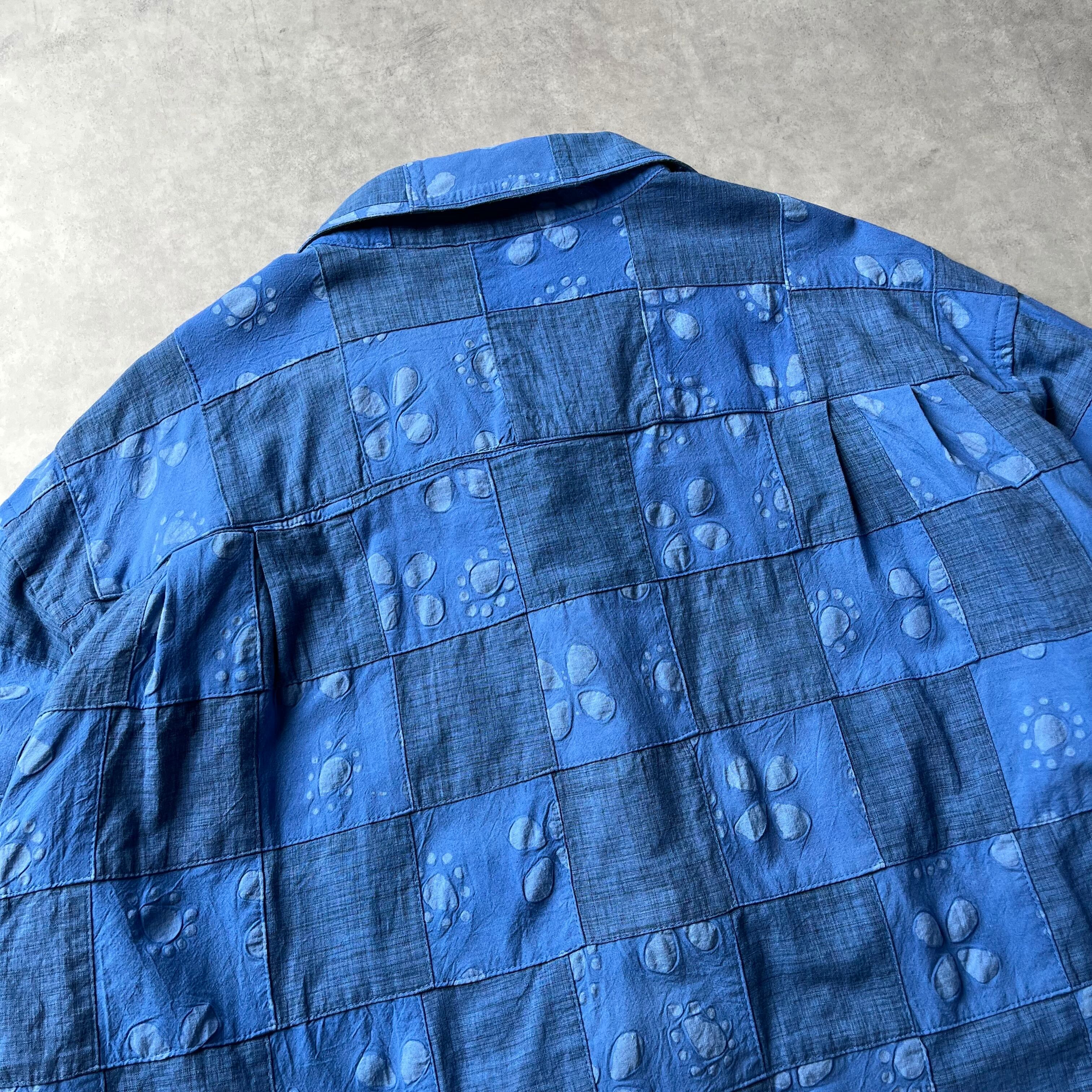 濃淡の異なるブルーの生地をチェッカー状に繋ぎ合わせ、それぞれのパネルに立体的な花のモチーフや幾何学模様を施した贅沢な作り。